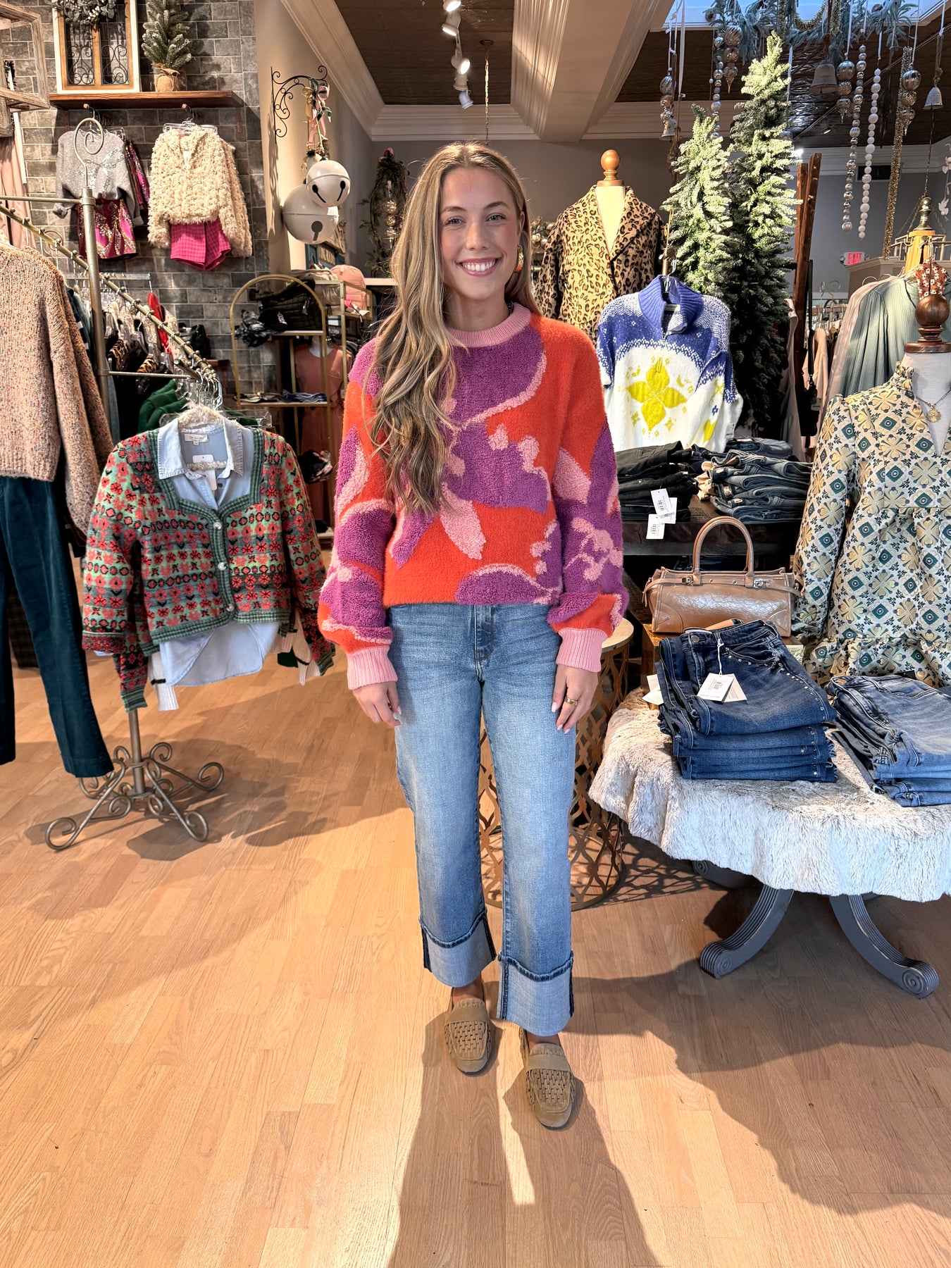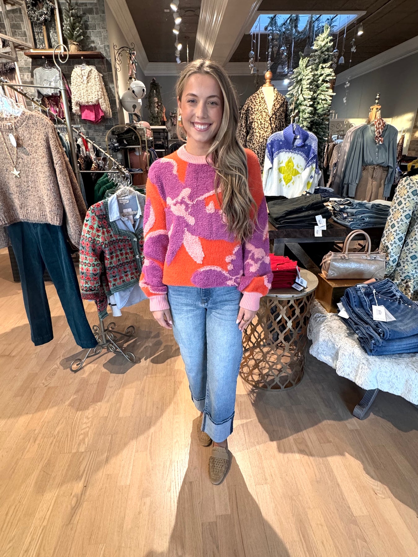 The AYME Sweater brings a playful burst of color and texture to your wardrobe. Featuring a vibrant print combined with diverse textures, this sweater offers rich detail that stands out in any setting. Perfect for those who love unique, eye-catching style with a cozy feel, it adds energy and personality to your outfit effortlessly.