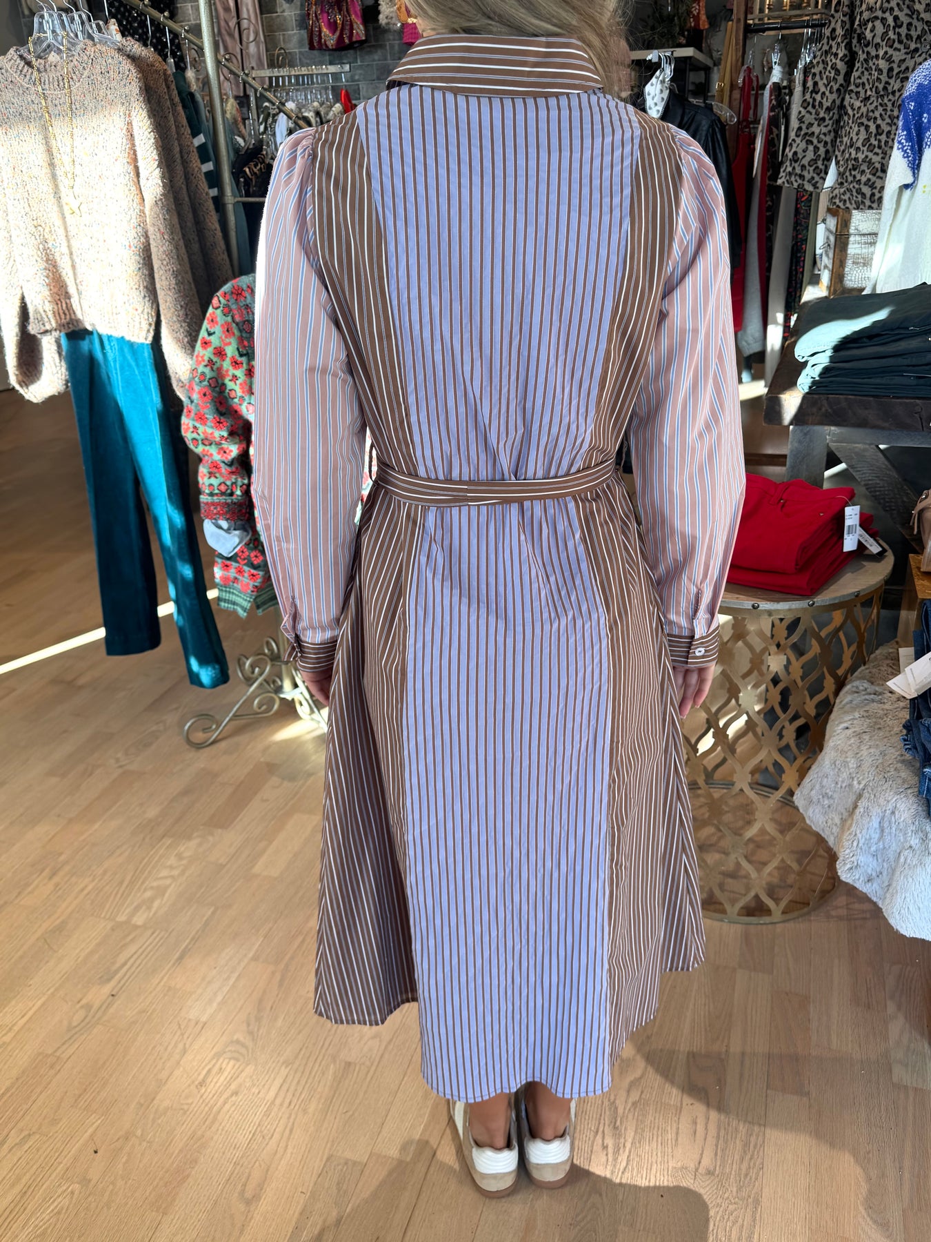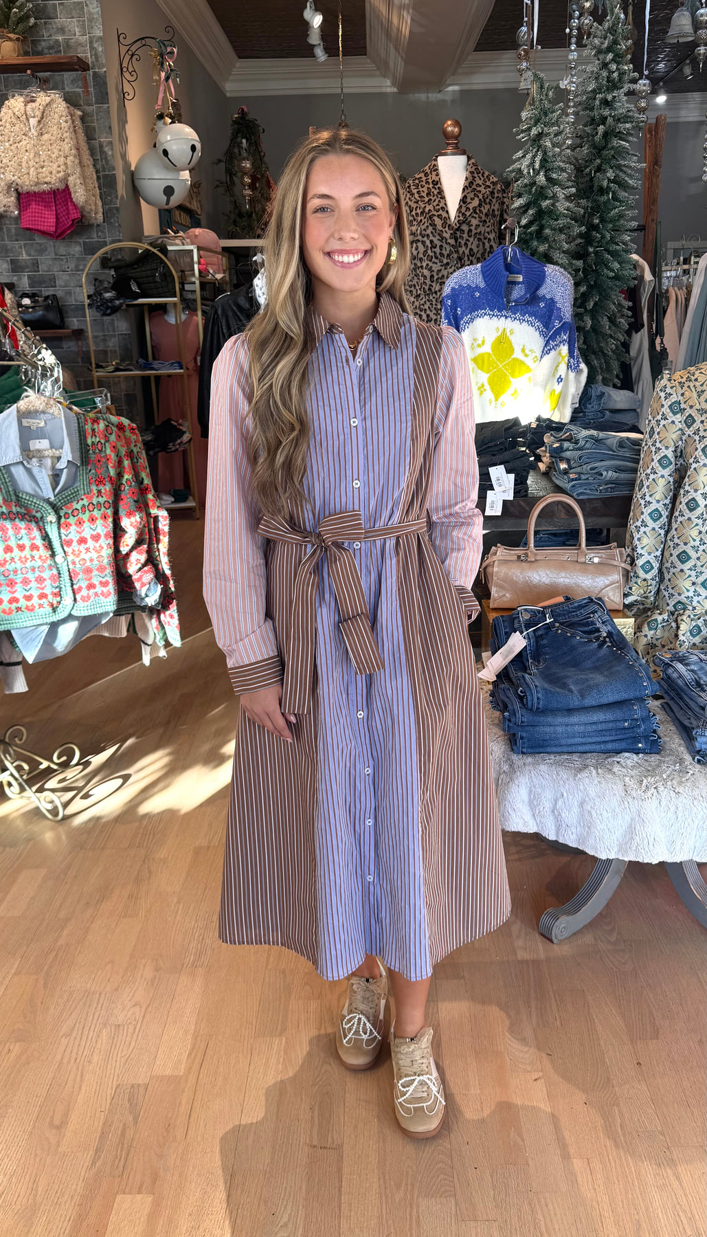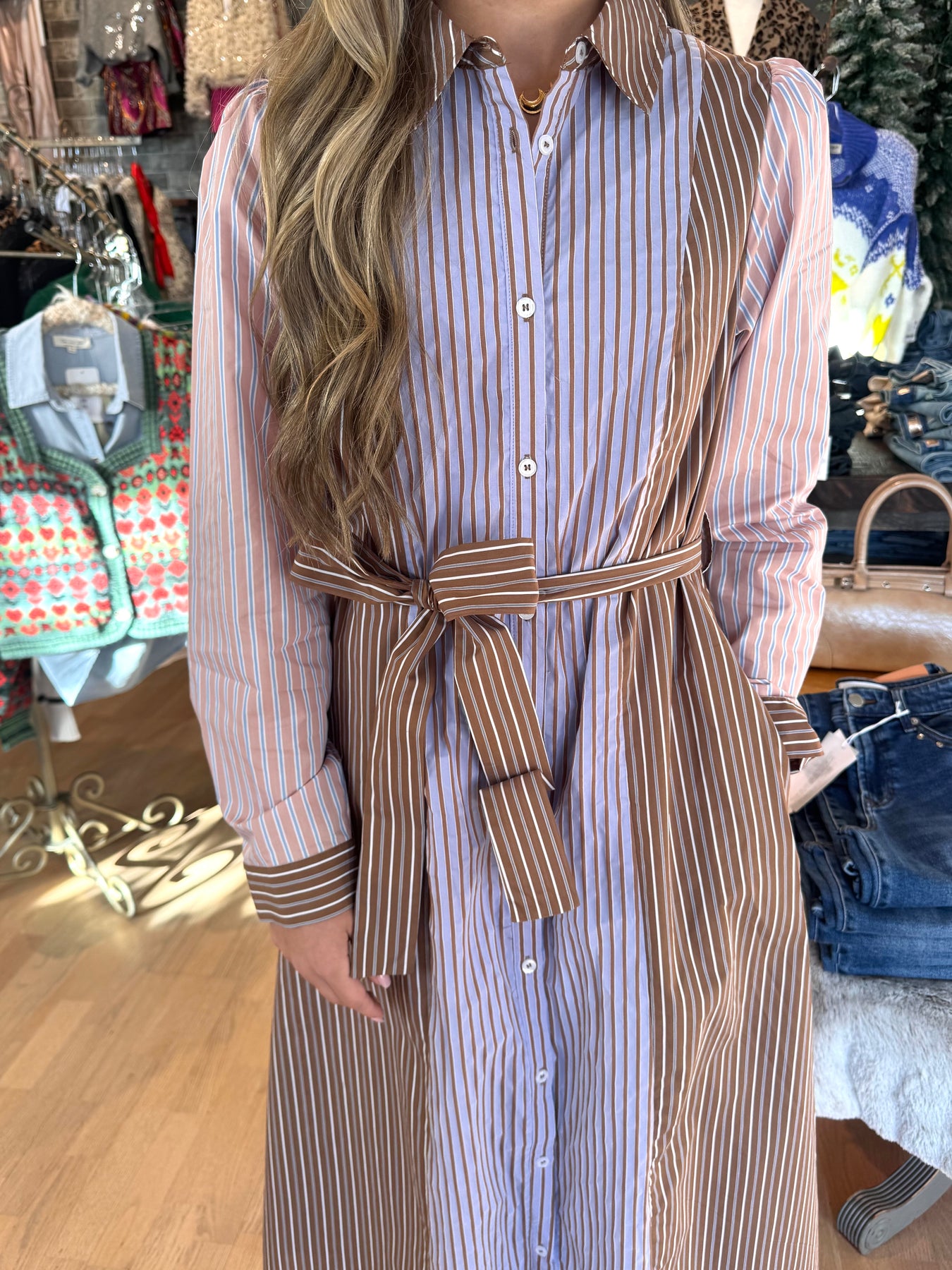 Elevate your style with this Button Up Mixed Stripe Shirt Maxi Dress featuring a flattering tie waist. The blend of stripes adds a modern twist to a classic silhouette, while the button-up front offers versatile wear from casual days to chic evenings. Designed for comfort and effortless elegance, this maxi dress is your go-to piece for a polished, confident look.