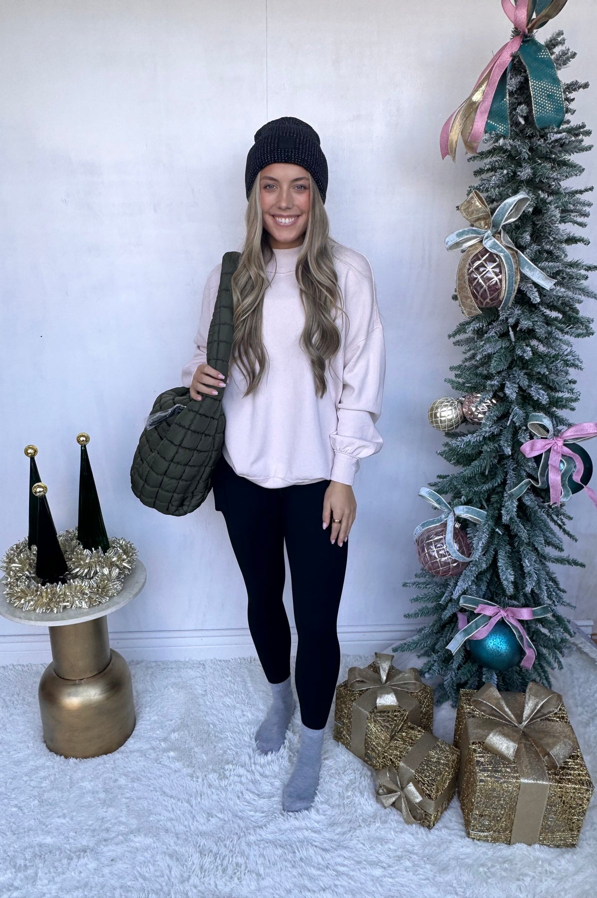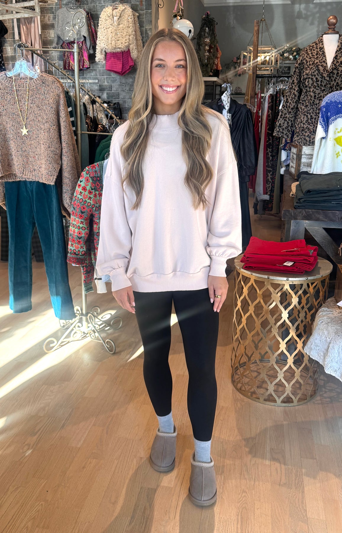 Features: French terry fabrication, mock neckline, drop-shoulder long sleeves, ribbed trim, exposed seams