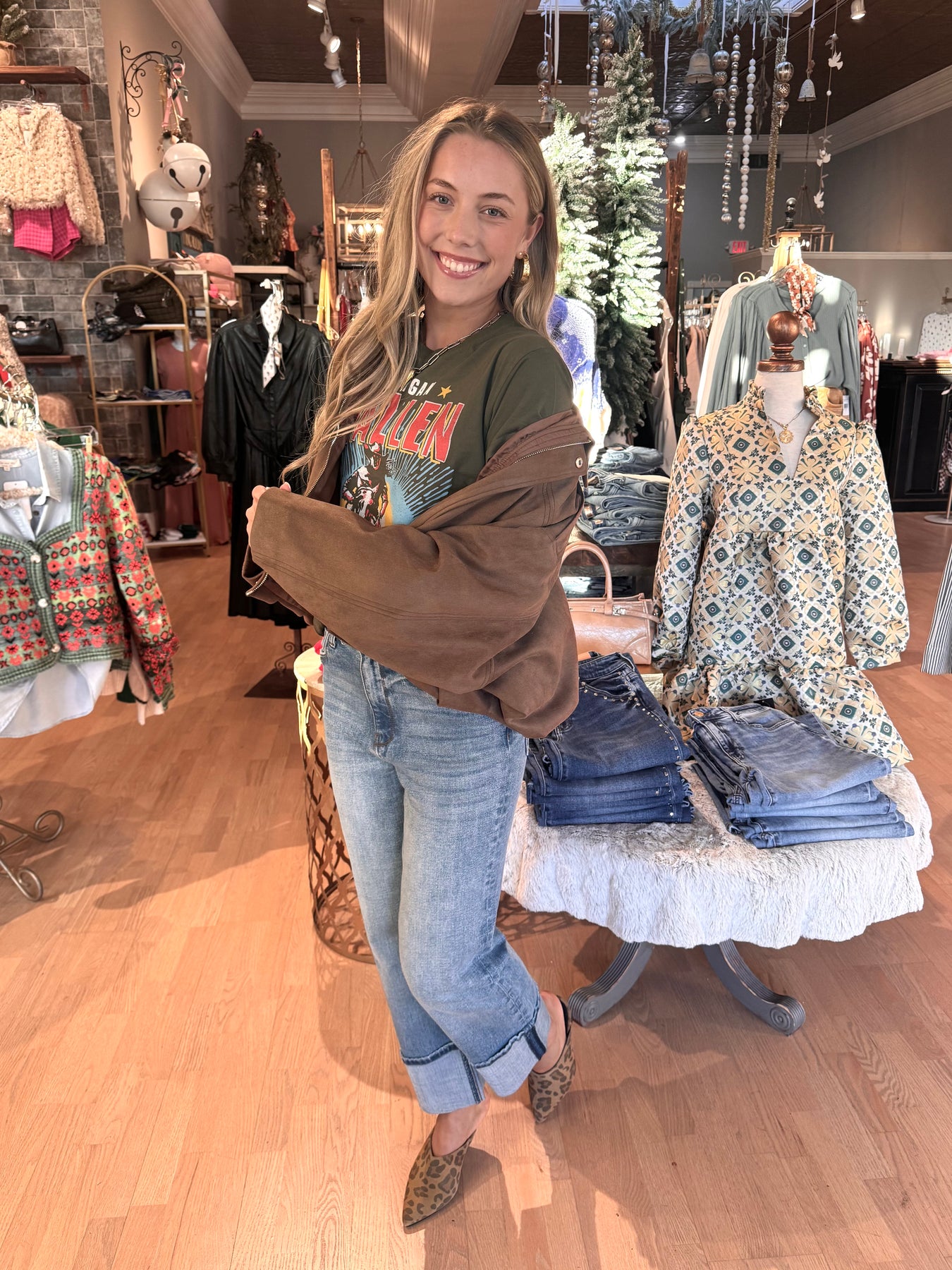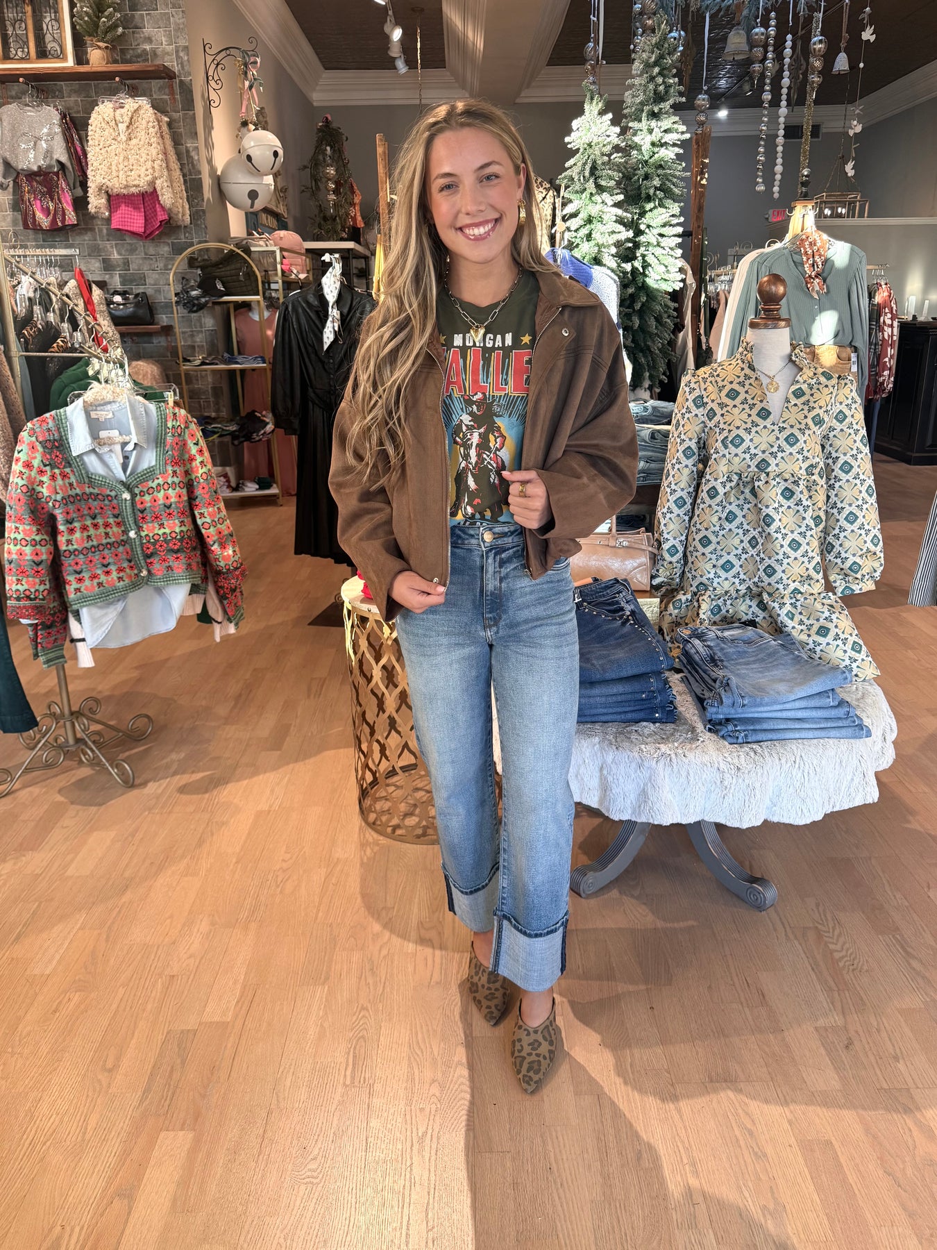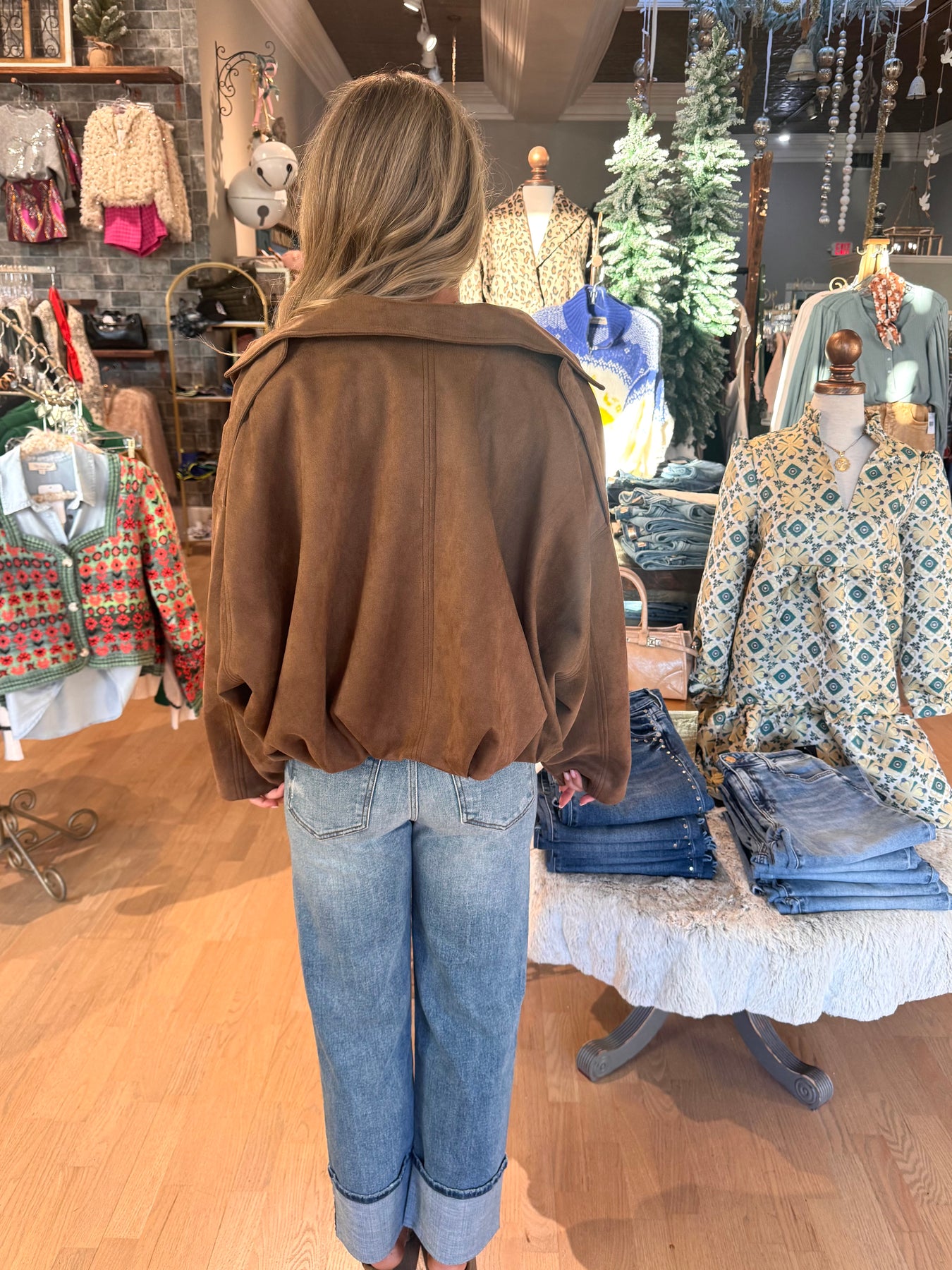 Elevate your fall wardrobe with this suede bomber jacket, a must-have trend this season. Perfectly styled with jeans, skirts, or knee-high boots, it adds effortless edge to any outfit. Layer it over a tank or band tee for a versatile, chic look that’s ready for anything.