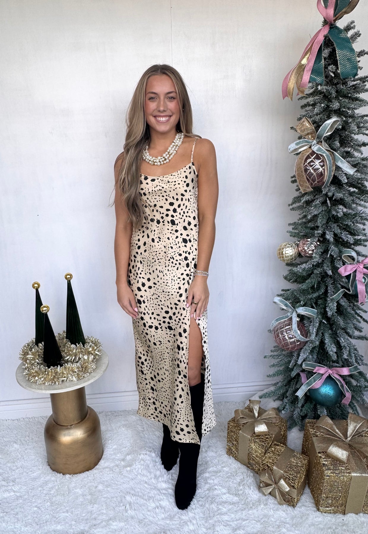 Cut in luxe satin with a flowing midi length, this printed dress balances elegance with ease. Adjustable straps make it wearable from day to night.