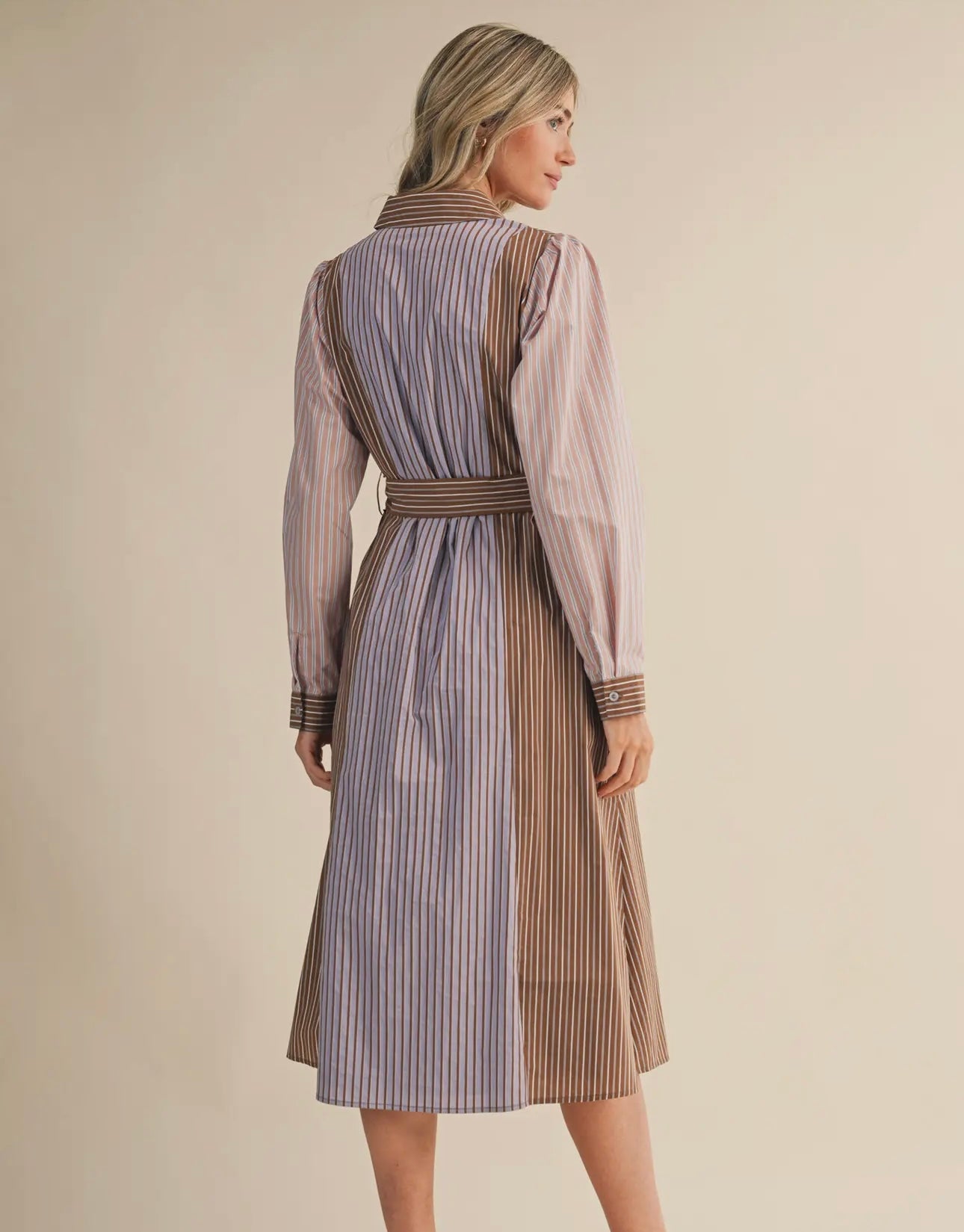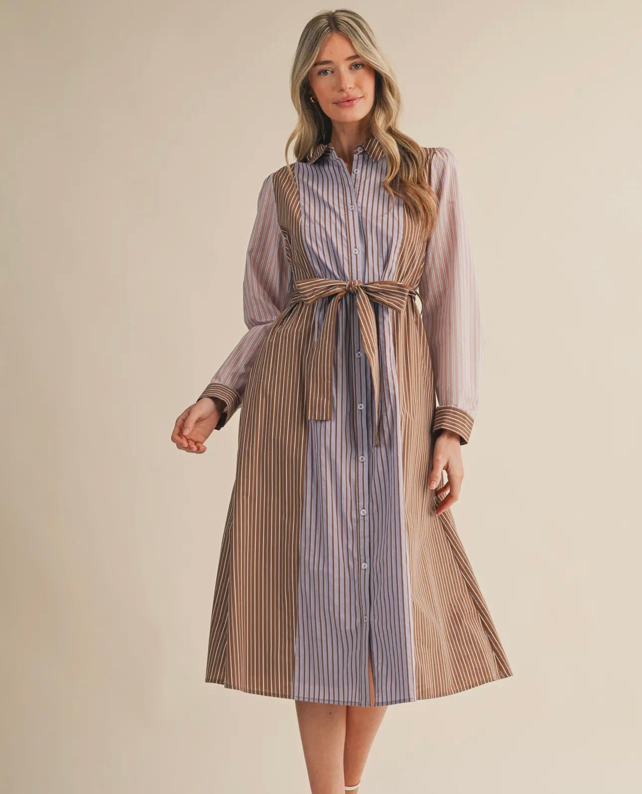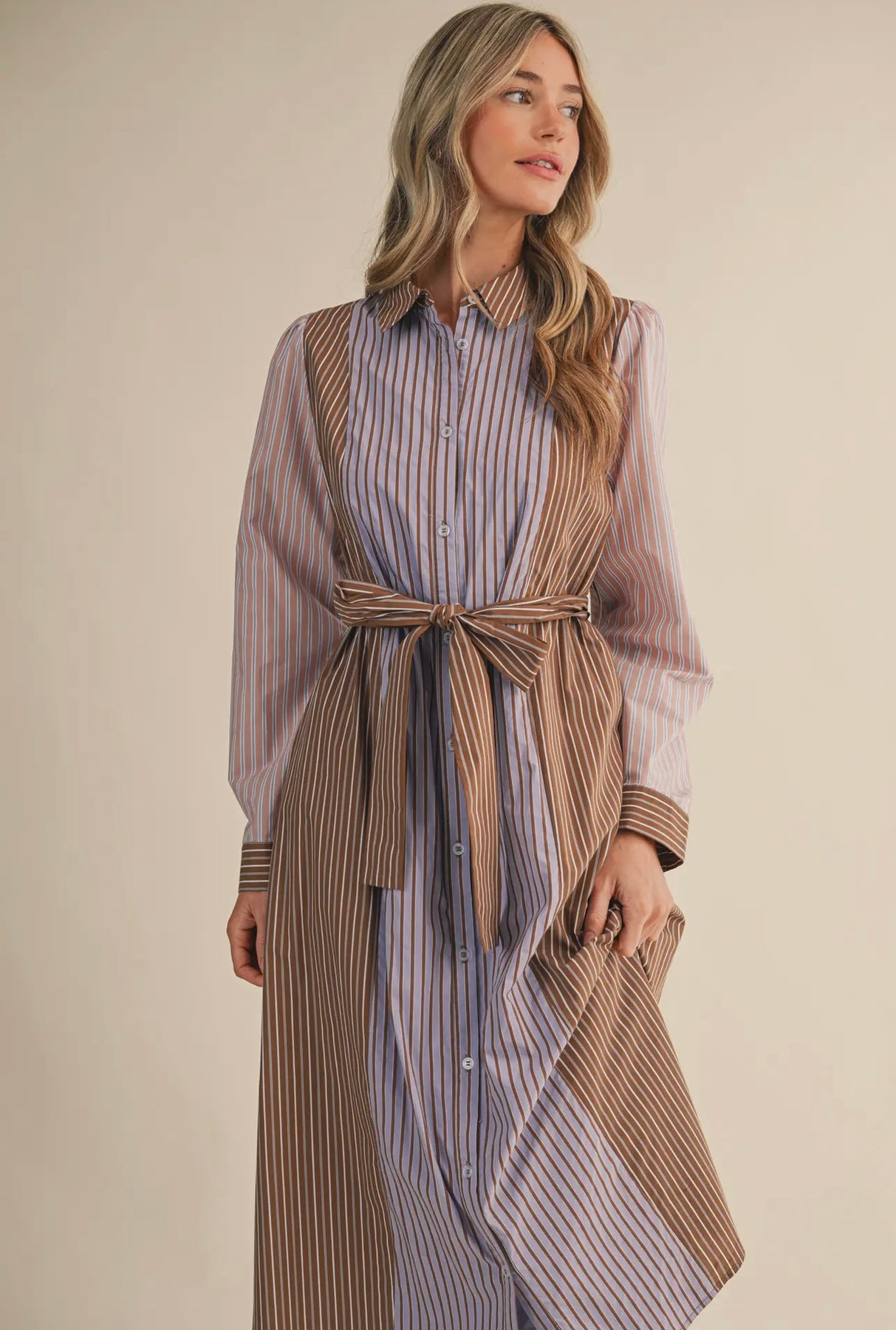 Elevate your style with this Button Up Mixed Stripe Shirt Maxi Dress featuring a flattering tie waist. The blend of stripes adds a modern twist to a classic silhouette, while the button-up front offers versatile wear from casual days to chic evenings. Designed for comfort and effortless elegance, this maxi dress is your go-to piece for a polished, confident look.