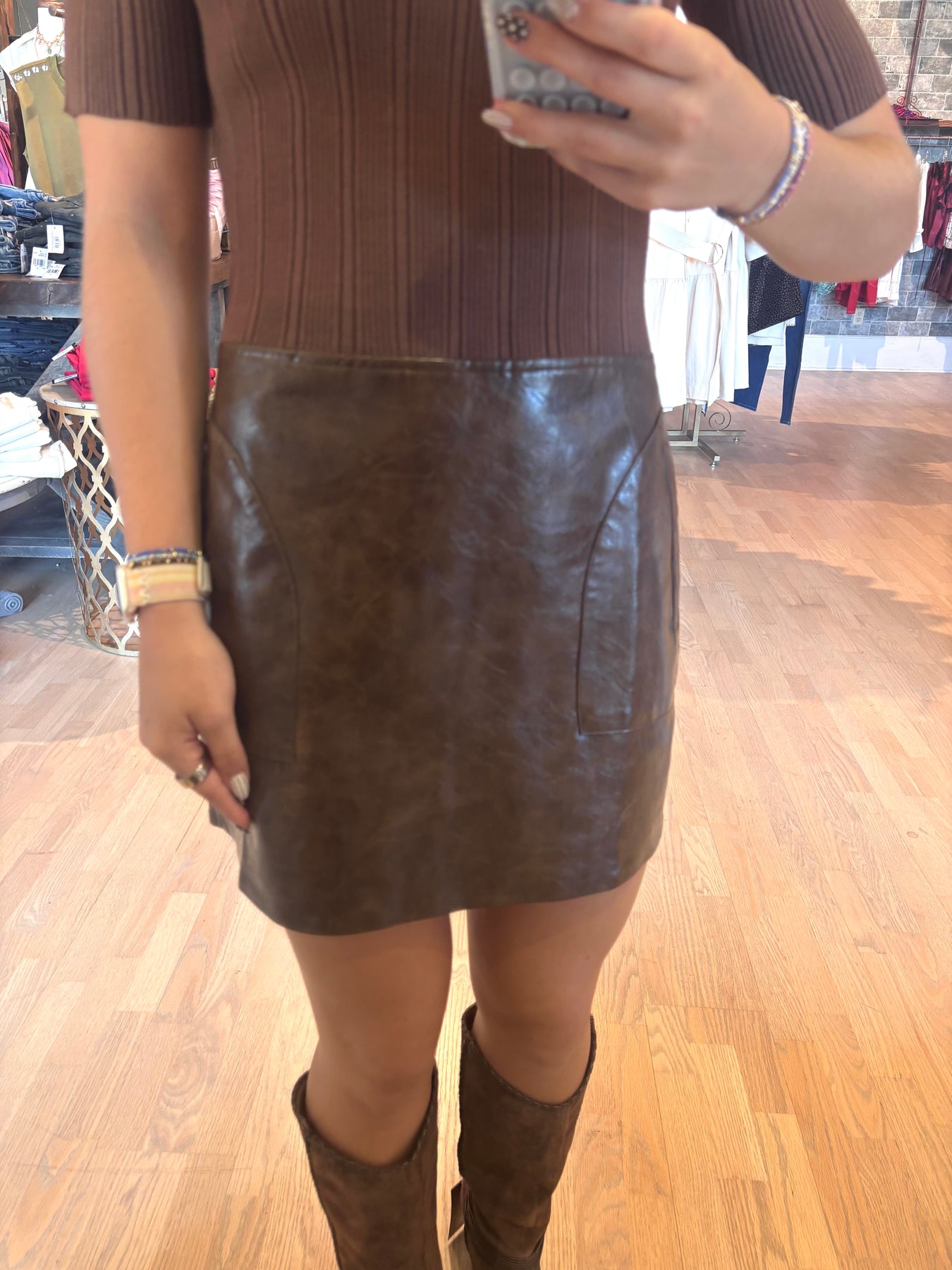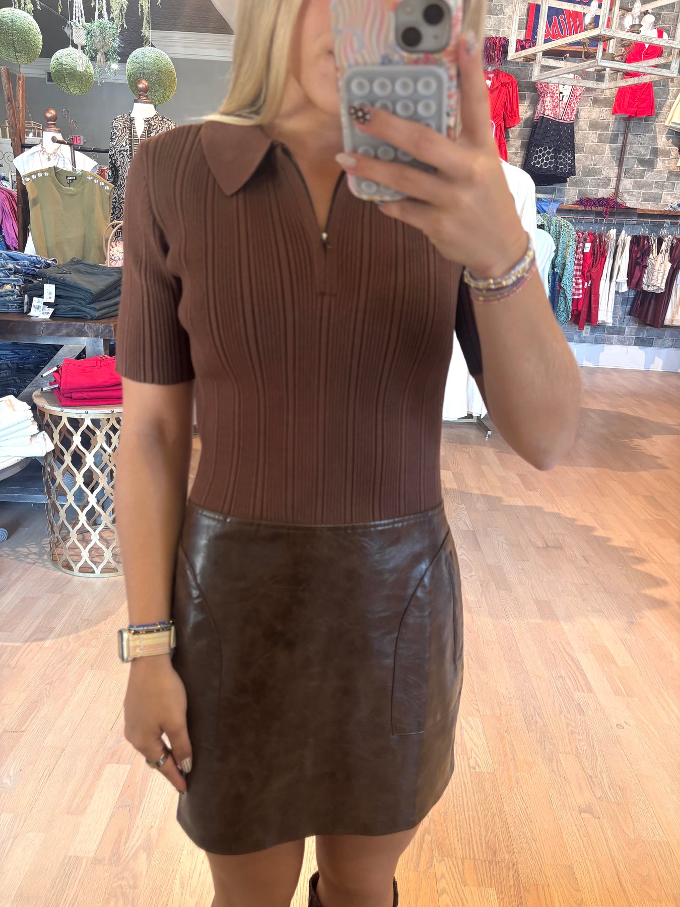 This fitted dress combines cozy knit with edgy faux leather for a striking look that stands out. Perfect for pairing with boots, it makes a bold statement on its own or layered under a jacket when the weather cools. Elevate your style effortlessly with this versatile piece.