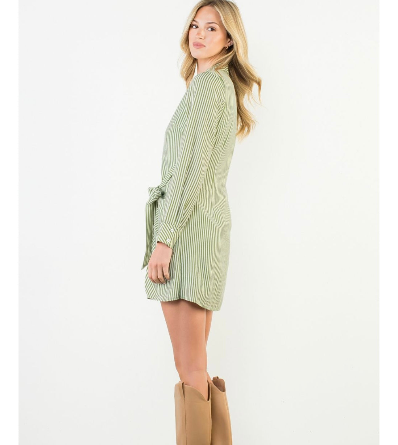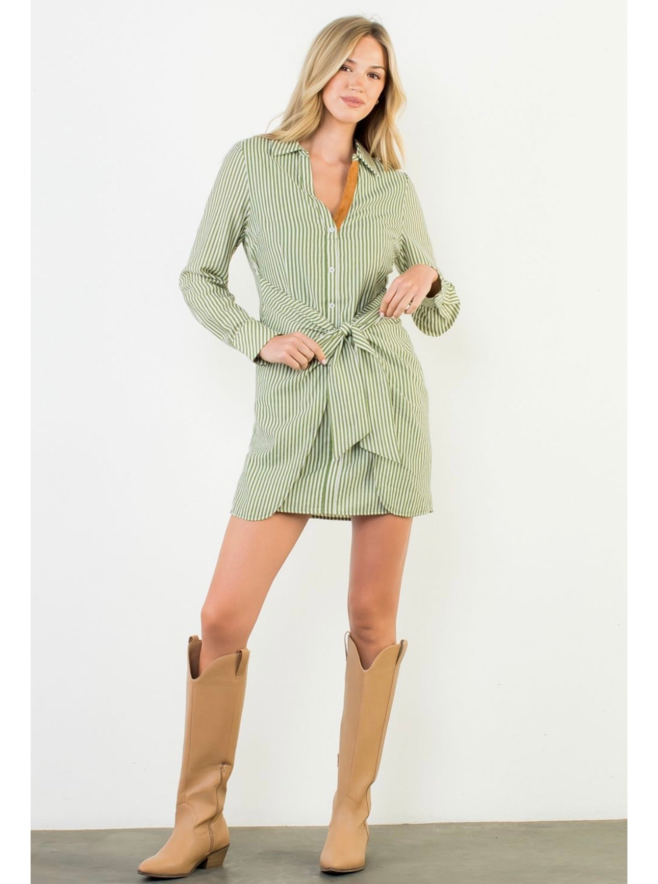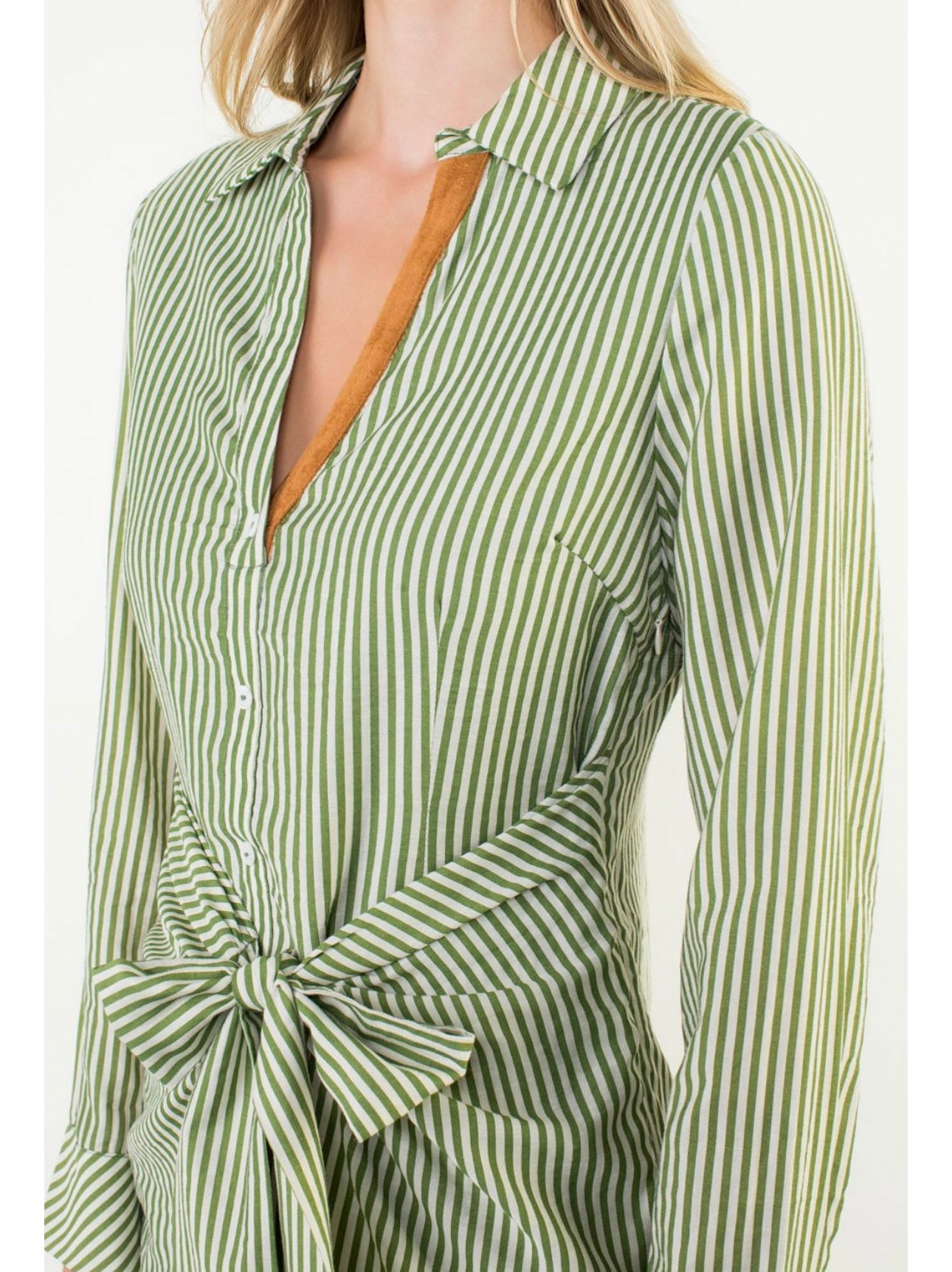 This long sleeve button-up striped dress features charming brown suede accents along the neckline, adding a unique touch to its classic design. Perfect for fall, it pairs effortlessly with sneakers or boots, blending comfort with style. Embrace cozy, casual elegance that transitions seamlessly from day to night.