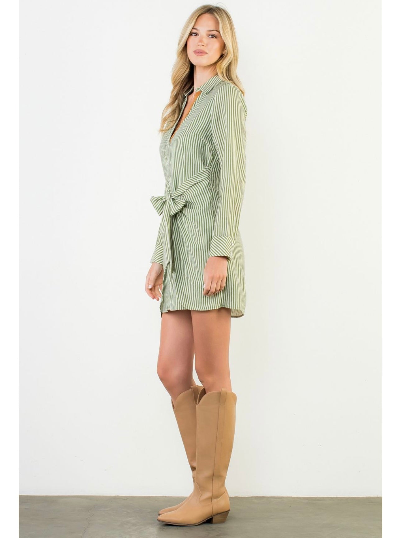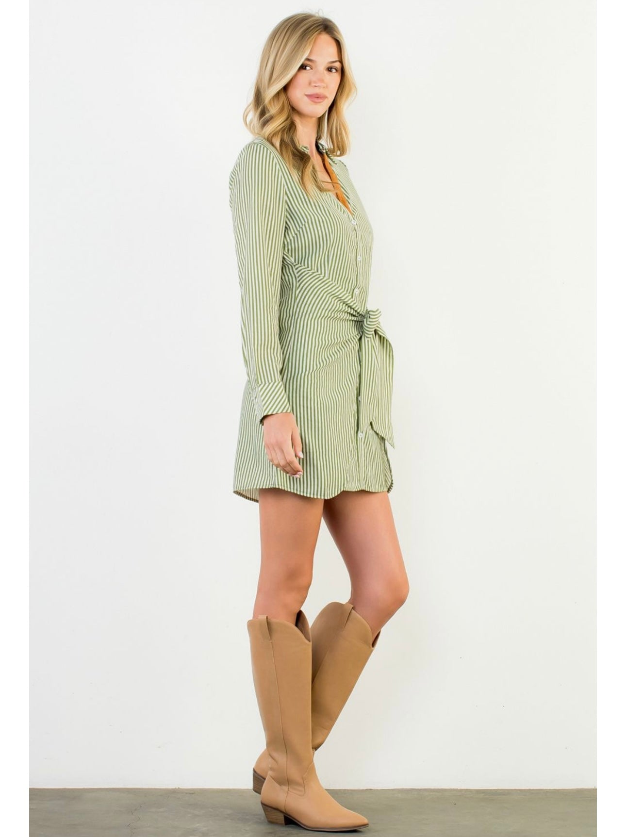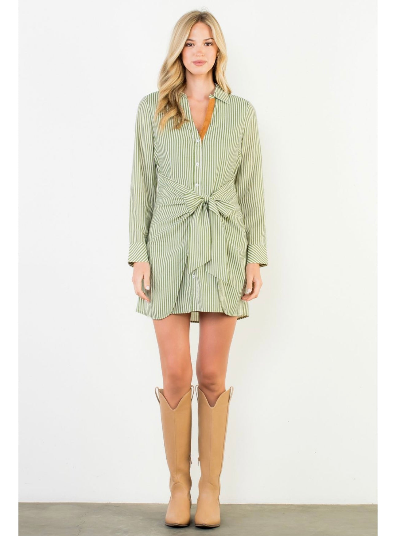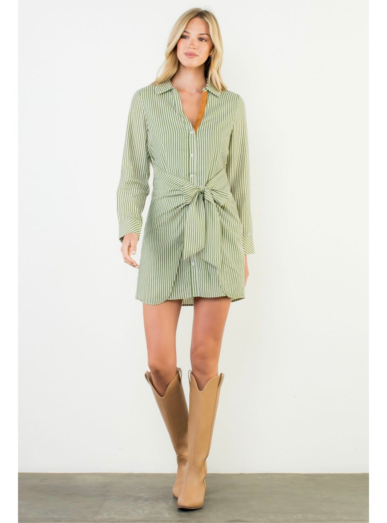 This long sleeve button-up striped dress features charming brown suede accents along the neckline, adding a unique touch to its classic design. Perfect for fall, it pairs effortlessly with sneakers or boots, blending comfort with style. Embrace cozy, casual elegance that transitions seamlessly from day to night.