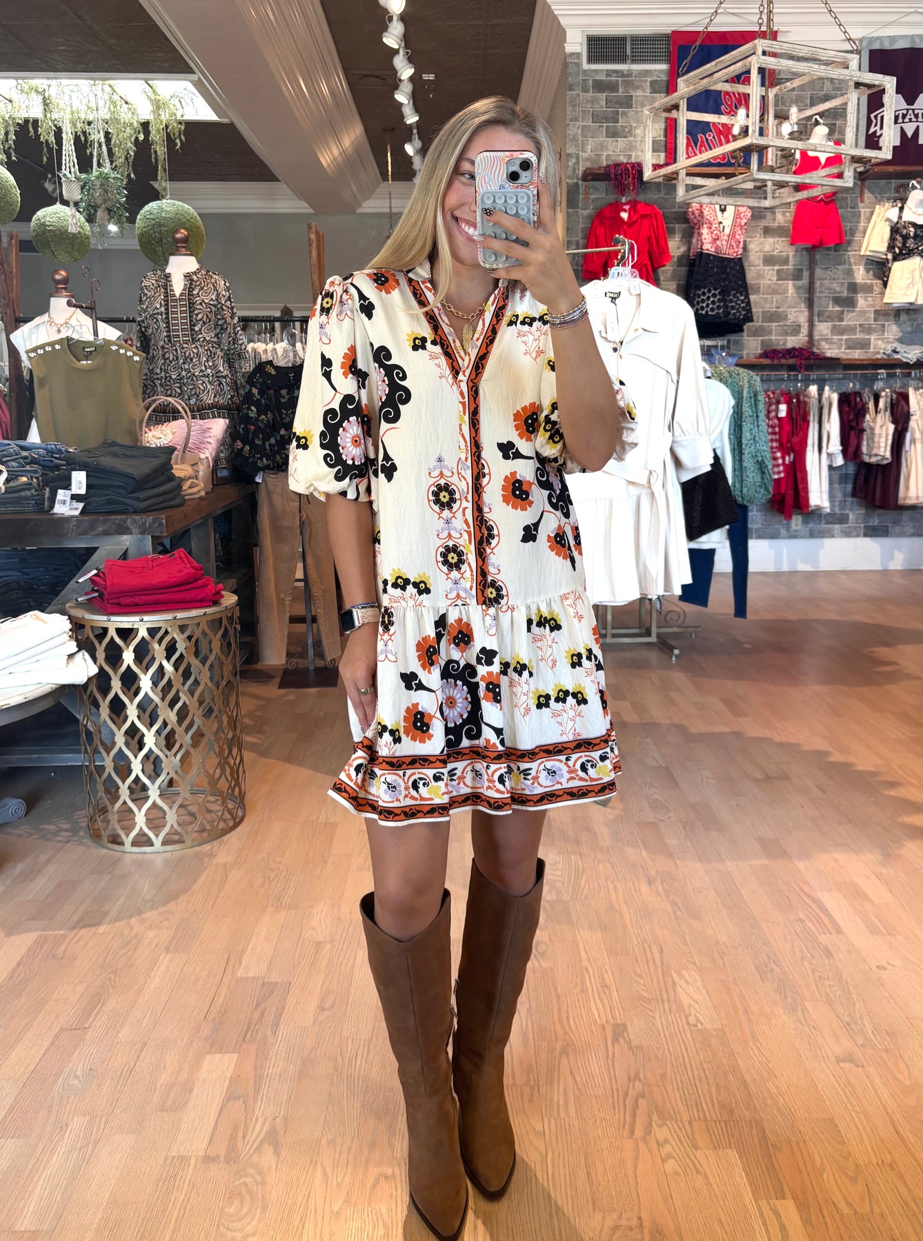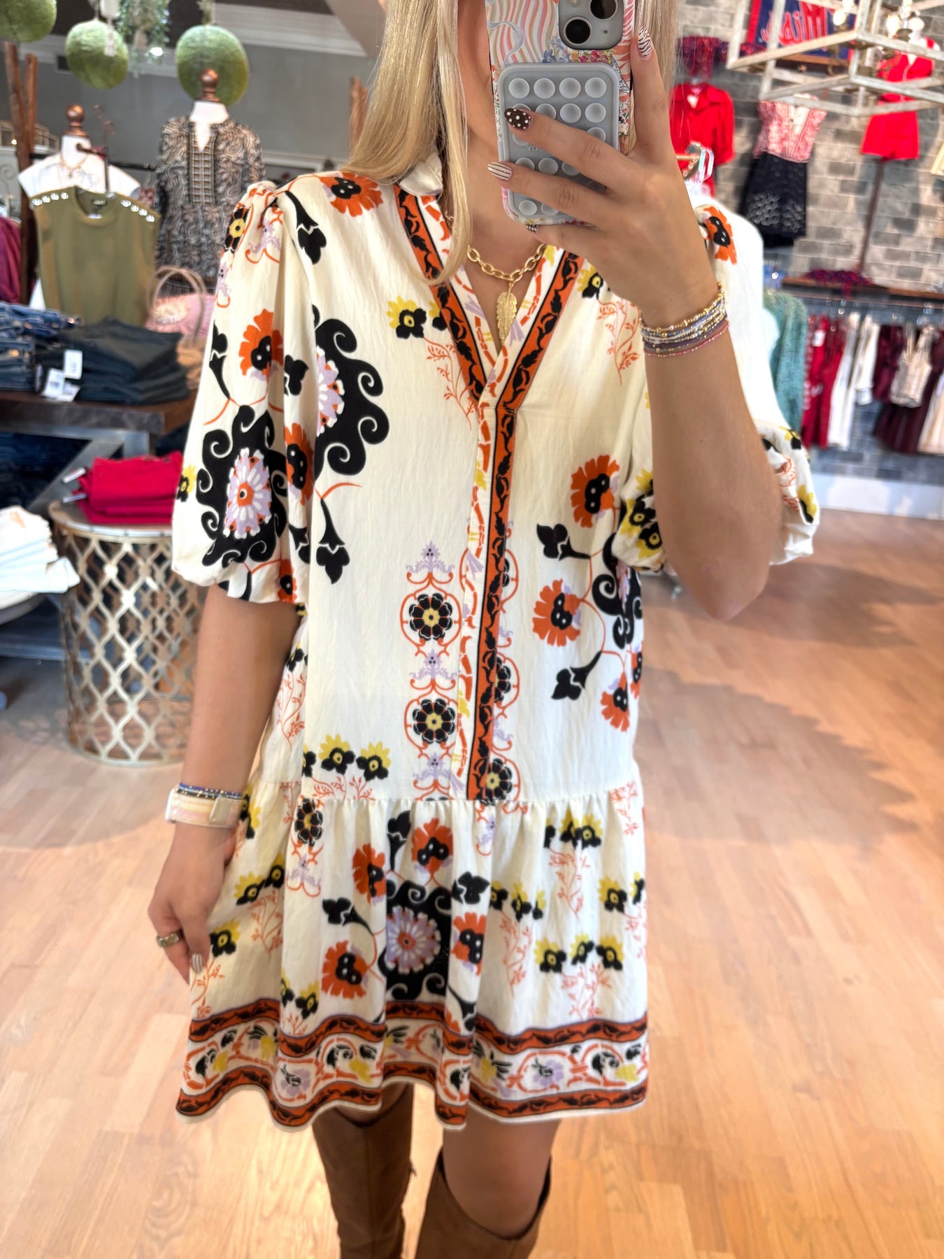 Embrace the season in this oversized Puff Sleeve Floral Dress, bursting with vibrant Fall colors and a playful print. Perfectly pairing with your favorite boots, it’s your go-to dress for effortless style and cozy comfort all autumn long. Elevate your Fall wardrobe with a look that’s both eye-catching and easy to wear.
