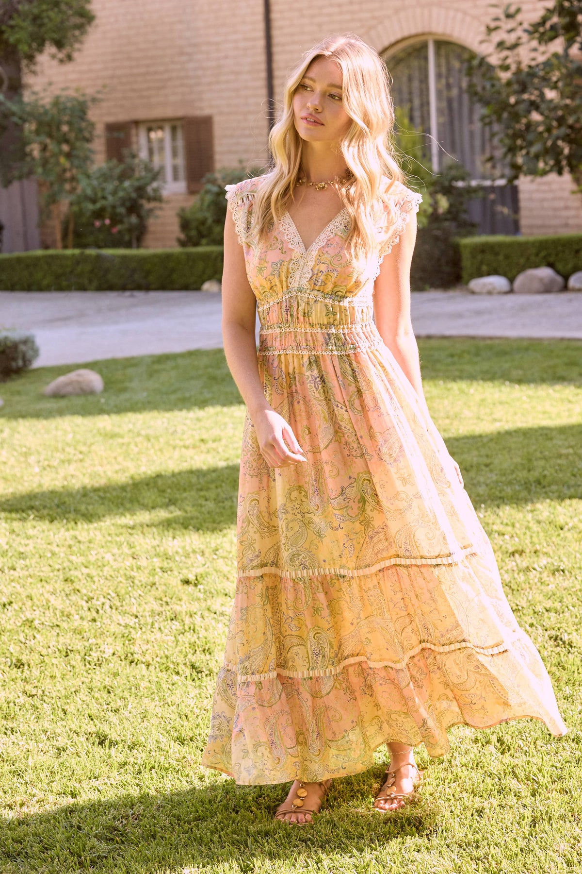 Printed Lace-Trim Maxi Dress Flowy and feminine, this printed maxi dress features delicate lace trim that adds a romantic, vintage-inspired touch. Designed with a lightweight feel and an easy, flattering silhouette, it moves beautifully with every step. Perfect for warm-weather occasions, this dress transitions effortlessly from daytime outings to evening gatherings. Style it with sandals for a relaxed look or dress it up with heels and accessories for a more elevated finish. printed maxi dress, lace trim dress, feminine maxi dress, boho maxi dress, summer maxi dress, romantic long dress