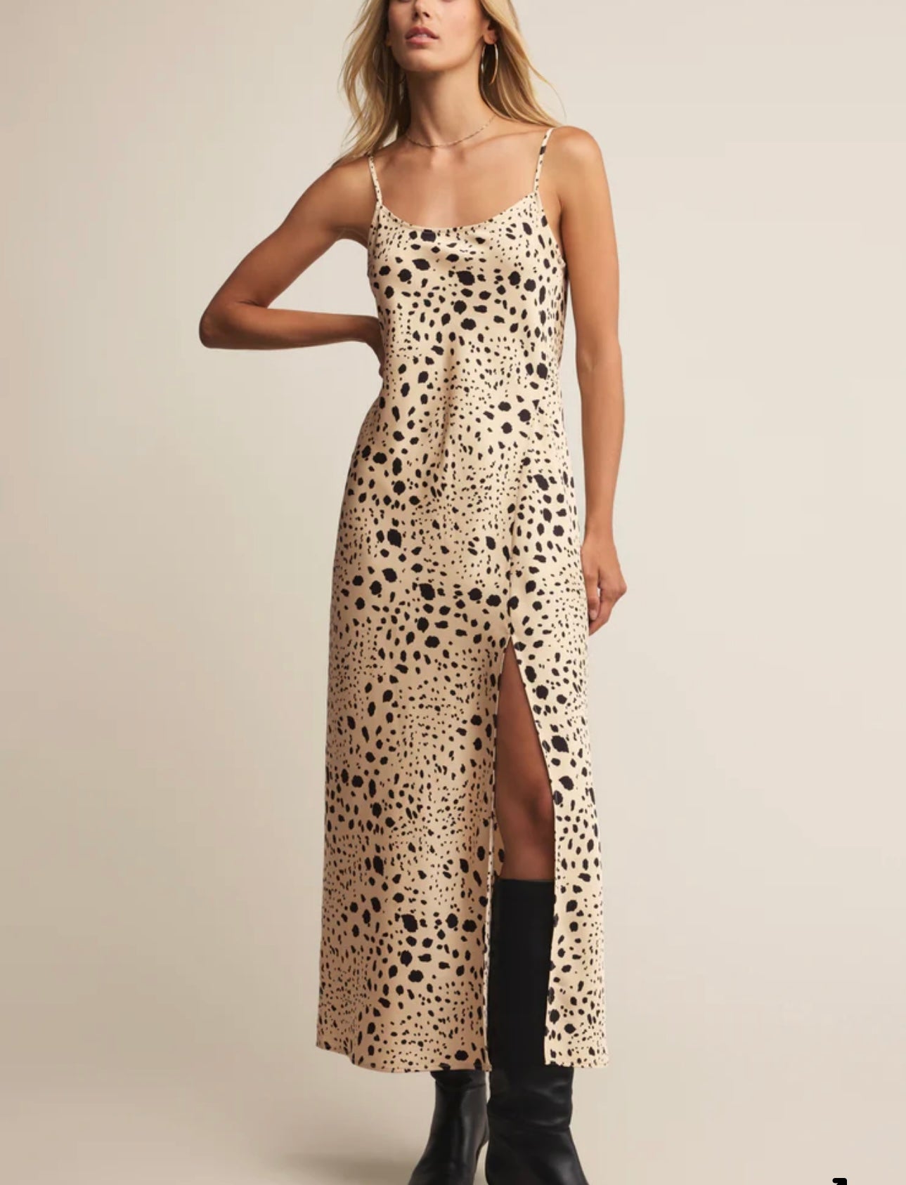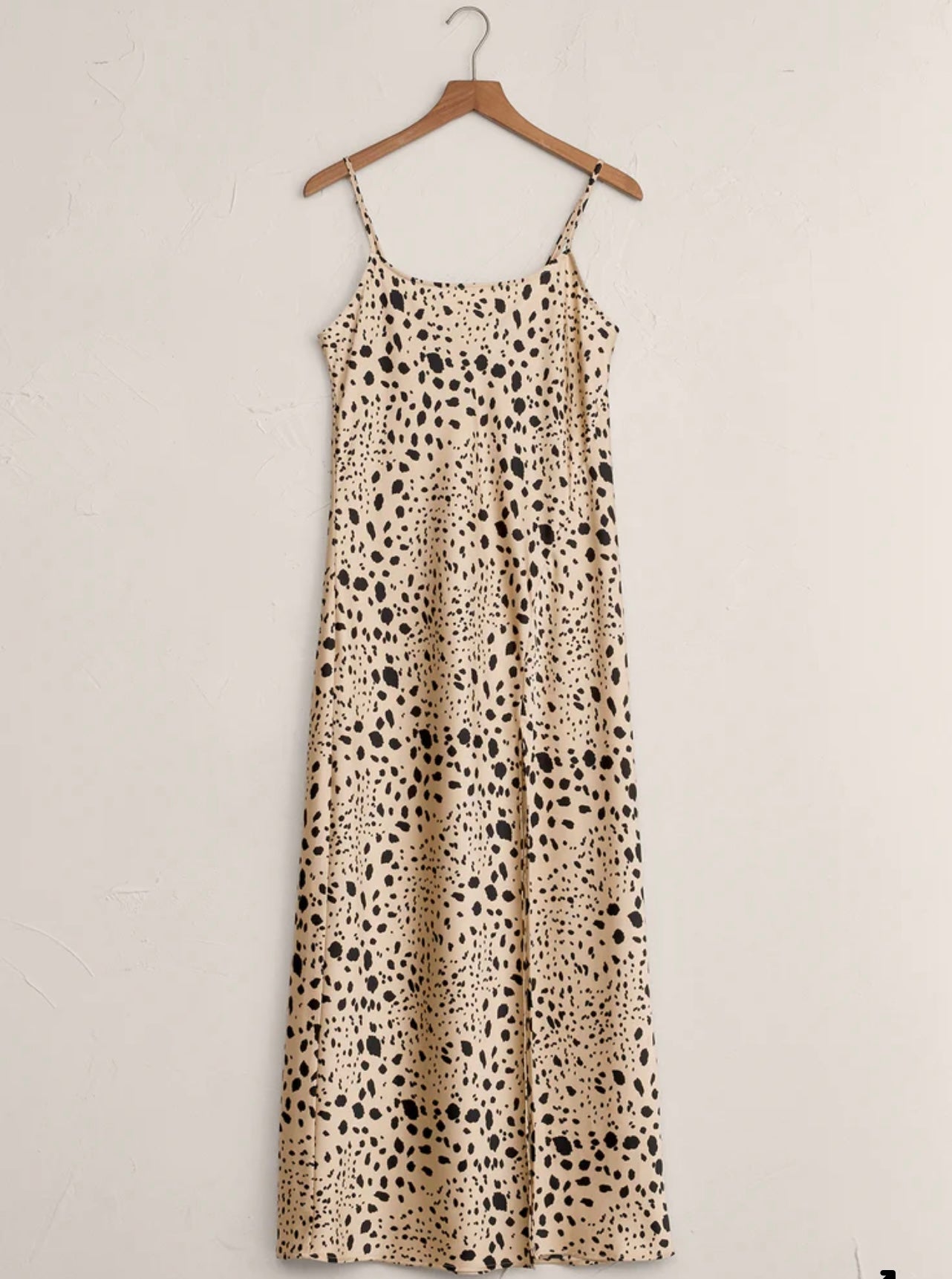 Cut in luxe satin with a flowing midi length, this printed dress balances elegance with ease. Adjustable straps make it wearable from day to night.