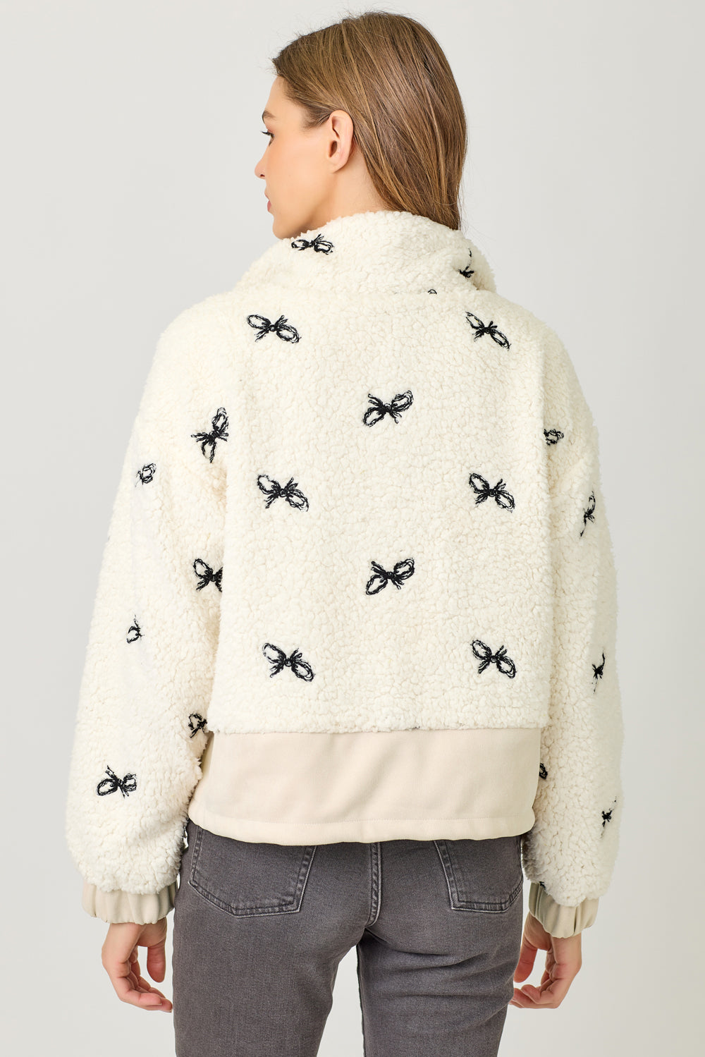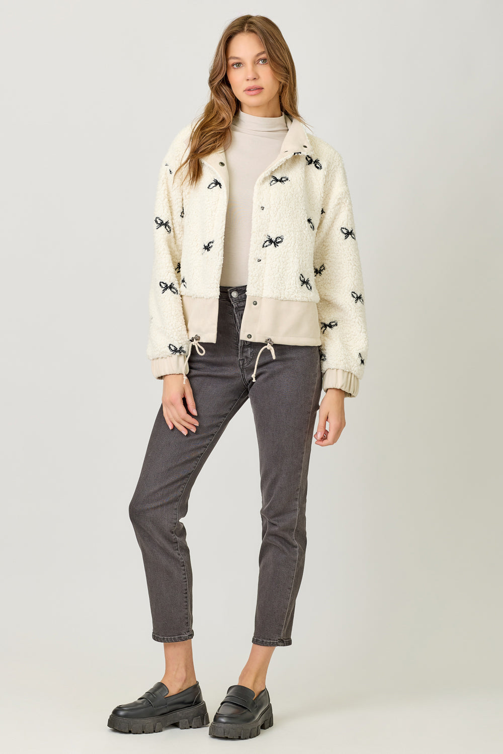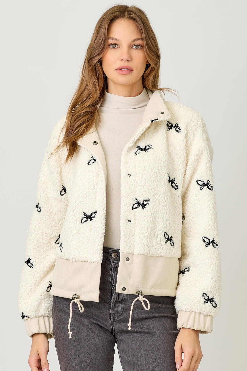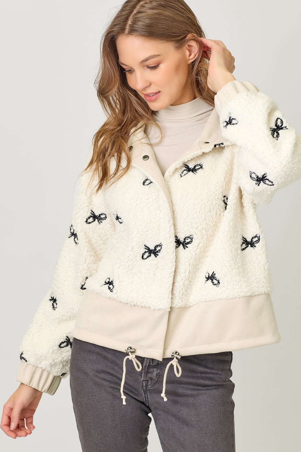 Experience warmth and style with the Bow Embroidery Mixed Jacket, featuring delicate bow embroidery for a charming touch. Hidden snap buttons provide a sleek, polished look while offering easy closure. The adjustable drawstring bottom lets you customize the fit for comfort and versatility, making this jacket both fashionable and functional for any occasion.