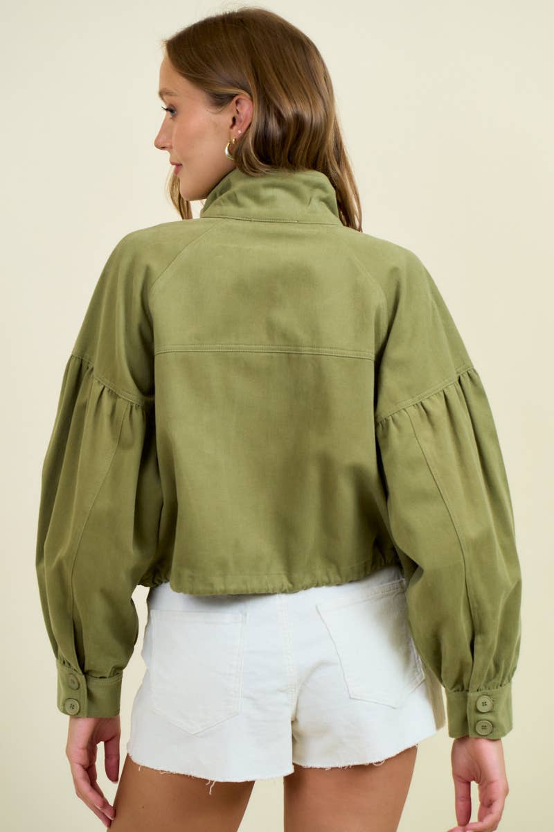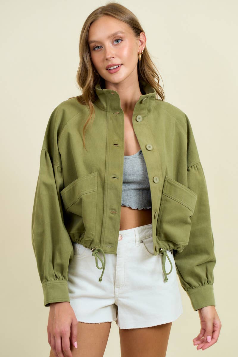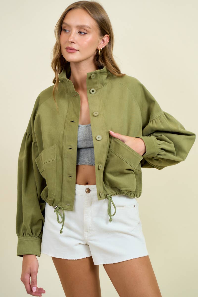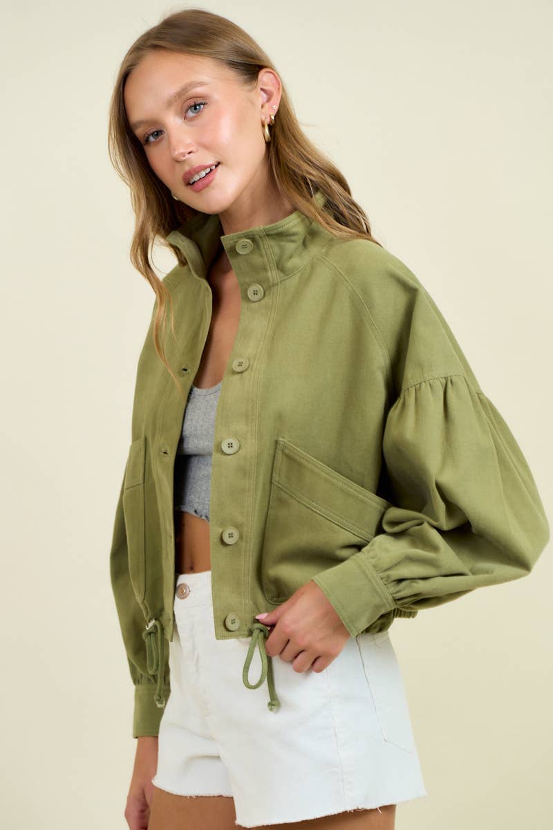BLOUSON TWILL UTILITY JACKET - Blouson-style silhouette with a cropped, boxy cut for a modern look - Features a stand collar and button-front closure for versatile styling - Raglan sleeves with wide, gathered cuffs and button detail add volume and unique flair - Large front patch pockets for practical utility and style - Adjustable drawstring hem for a customizable fit STYLE MEASUREMENTS (SIZE SMALL) - Total Length 22" - Shoulder 25" - Bust 21 3/4" - Sleeve Length 28 1/2" 100%COTTON MODEL IS 5'10" | BUST 34" | WAIST 24" | HIPS 35" WEARING SIZE S