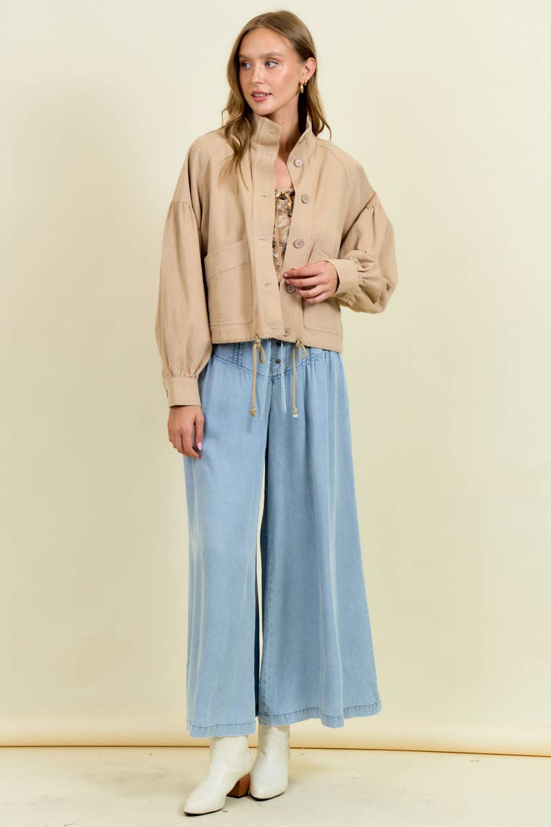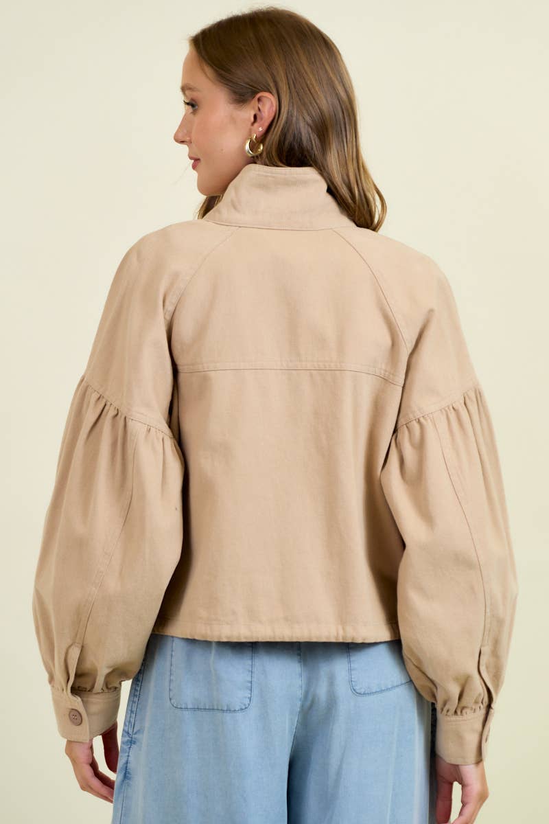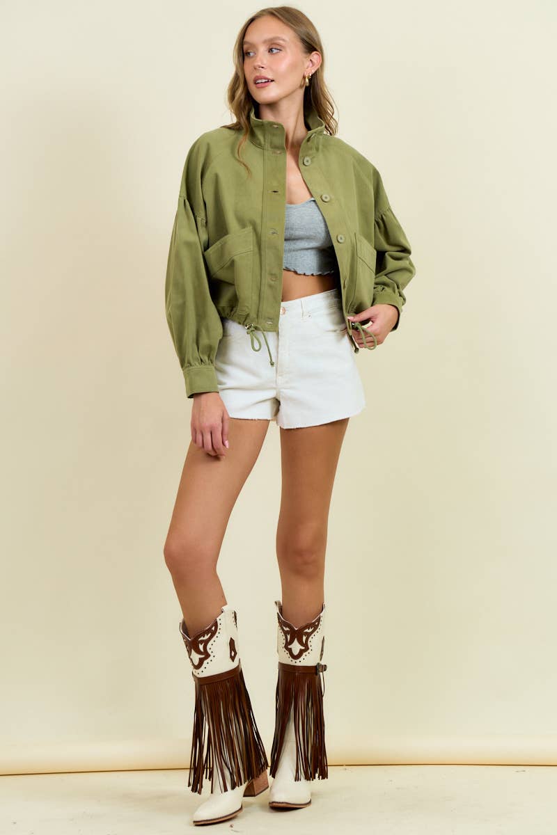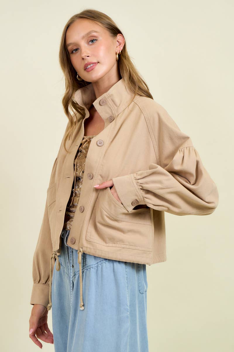 BLOUSON TWILL UTILITY JACKET - Blouson-style silhouette with a cropped, boxy cut for a modern look - Features a stand collar and button-front closure for versatile styling - Raglan sleeves with wide, gathered cuffs and button detail add volume and unique flair - Large front patch pockets for practical utility and style - Adjustable drawstring hem for a customizable fit STYLE MEASUREMENTS (SIZE SMALL) - Total Length 22" - Shoulder 25" - Bust 21 3/4" - Sleeve Length 28 1/2" 100%COTTON MODEL IS 5'10" | BUST 34" | WAIST 24" | HIPS 35" WEARING SIZE S