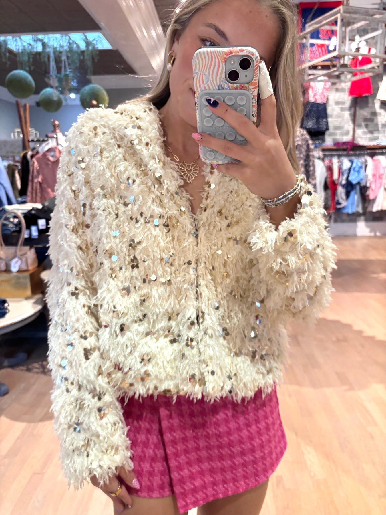 Elevate your holiday style with the Faux Fur Sequin Coat, the ideal layer over a dressy dress or to instantly glam up your jeans. This statement piece combines luxurious texture with dazzling sequins, making it perfect for festive occasions or nights out. Its eye-catching design ensures you stand out effortlessly while staying cozy and chic.