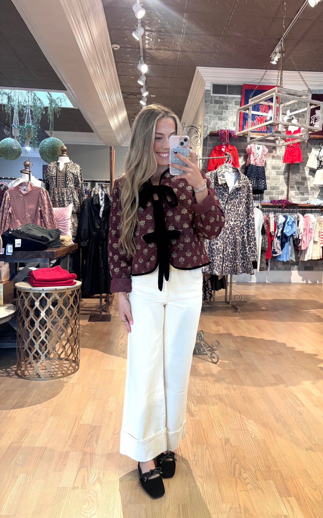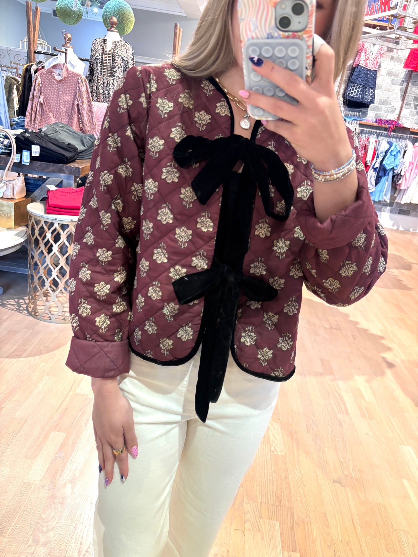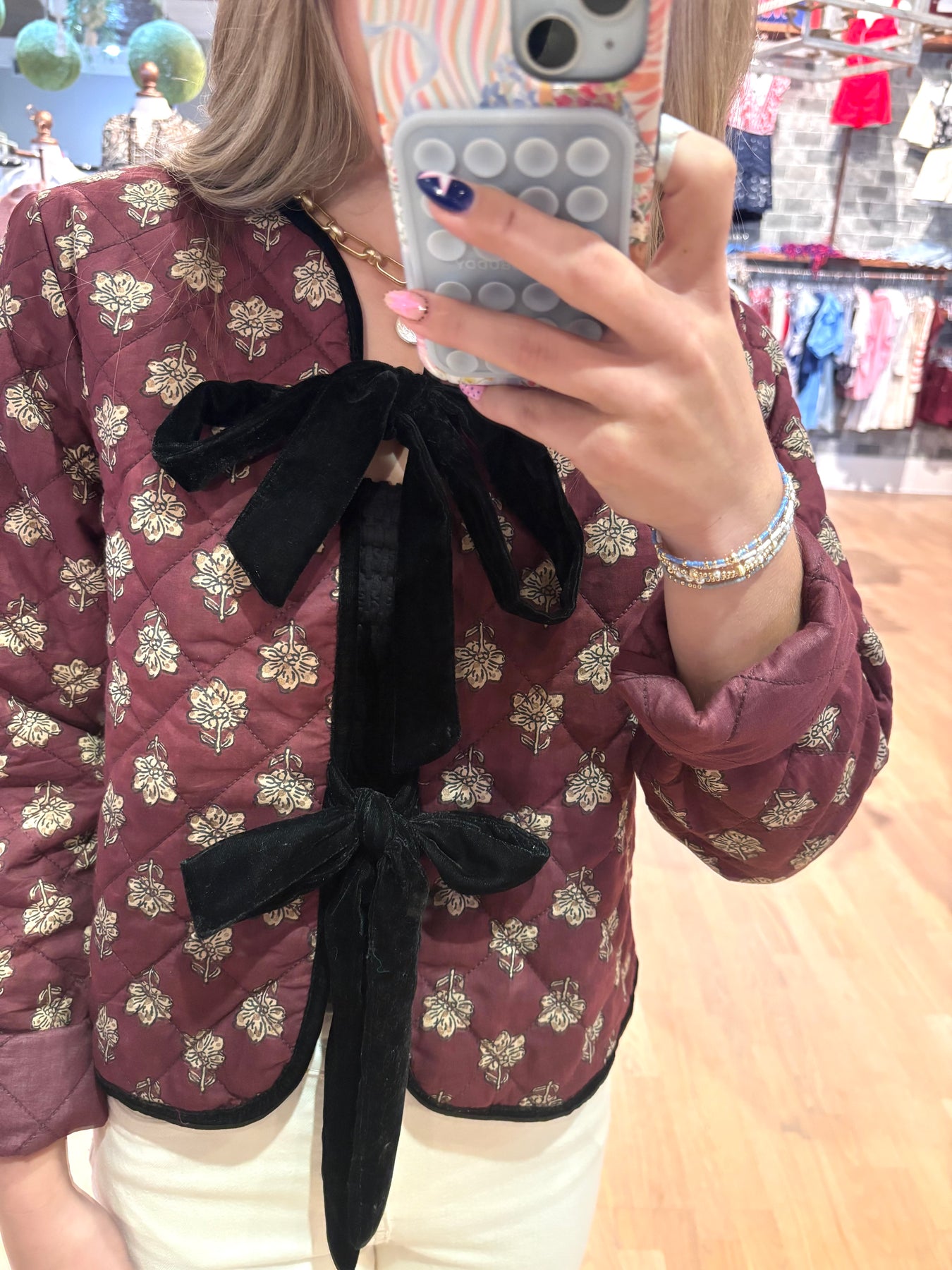 Elevate your wardrobe with this Printed Quilted Jacket, featuring a unique fun print and a luxurious velvet tie front detail. Its versatile design lets you effortlessly dress it up for a chic look or dress it down for casual comfort. Perfect for adding a stylish touch to any outfit while staying cozy and comfortable.