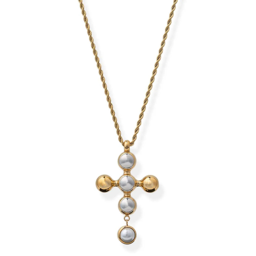 Our stylish Cielo Cross Necklace is made with an Italian vintage style mixed metal tone cross and Italian rope chain. This luxe modern statement piece adds a touch of sophistication and peace to any outfit. Its durable and water resistant plating ensures long-lasting wear.