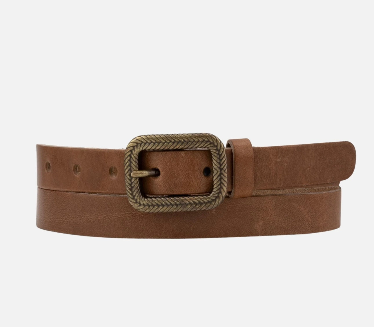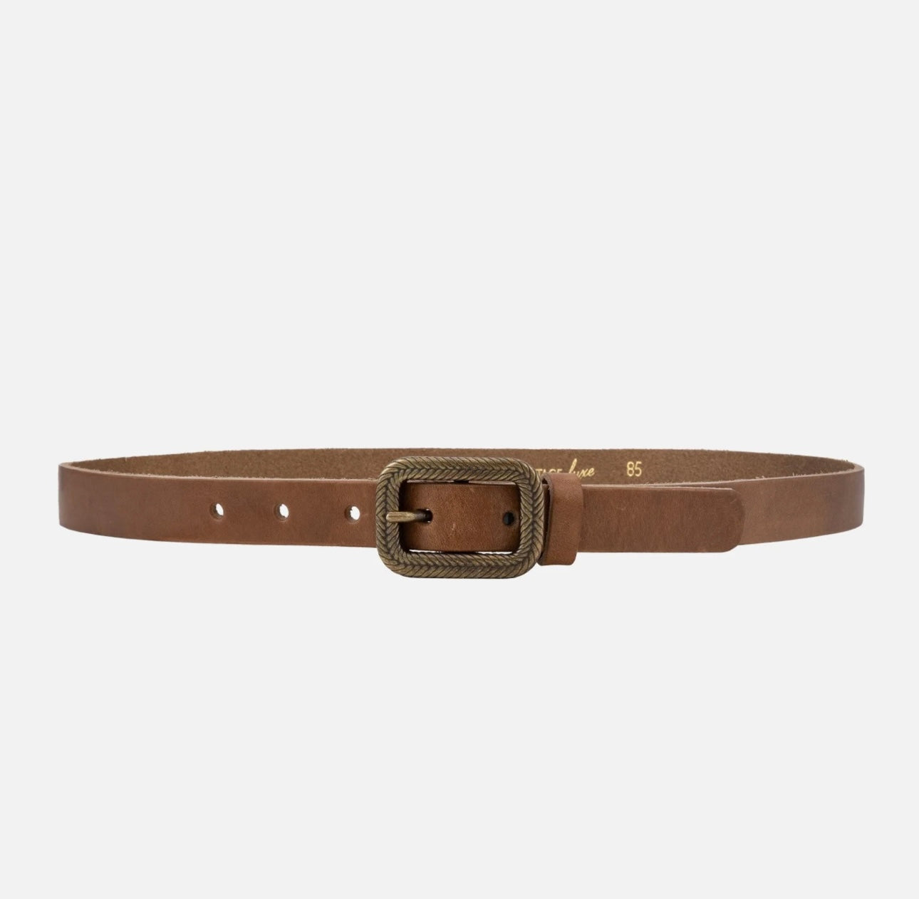 Introducing Chelsy, our skinny leather belt with a polished strap and antique gold rectangular buckle. This versatile accessory effortlessly blends modernity with vintage details, complementing dresses and jeans alike. It's the perfect finishing touch for any occasion.