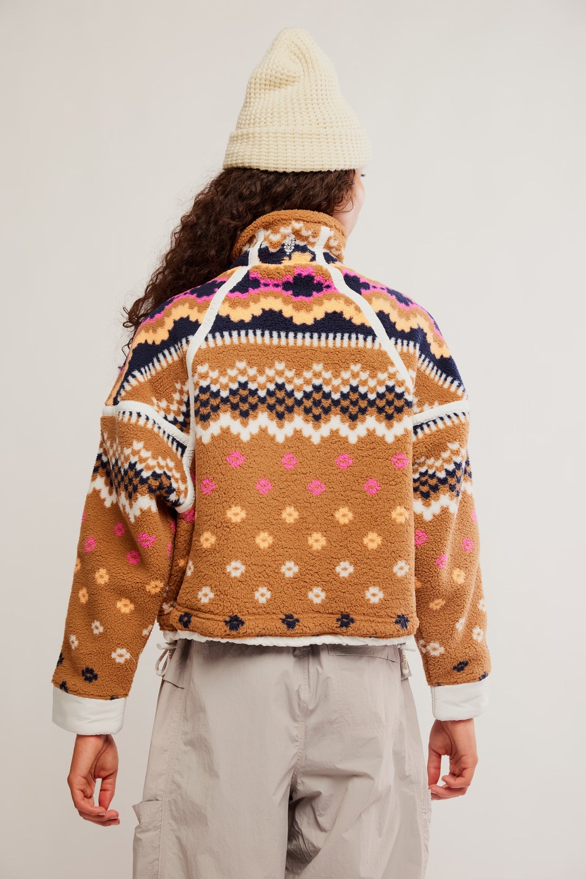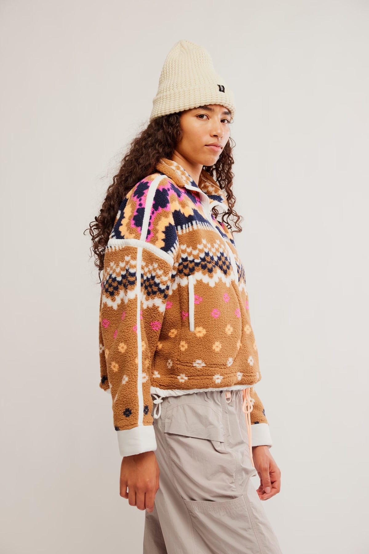 Your favorite cozy fleece, now in a bold new print. Relaxed-fit pullover offers a half-zip closure and high neckline with contrast seams throughout and an adjustable hemline.