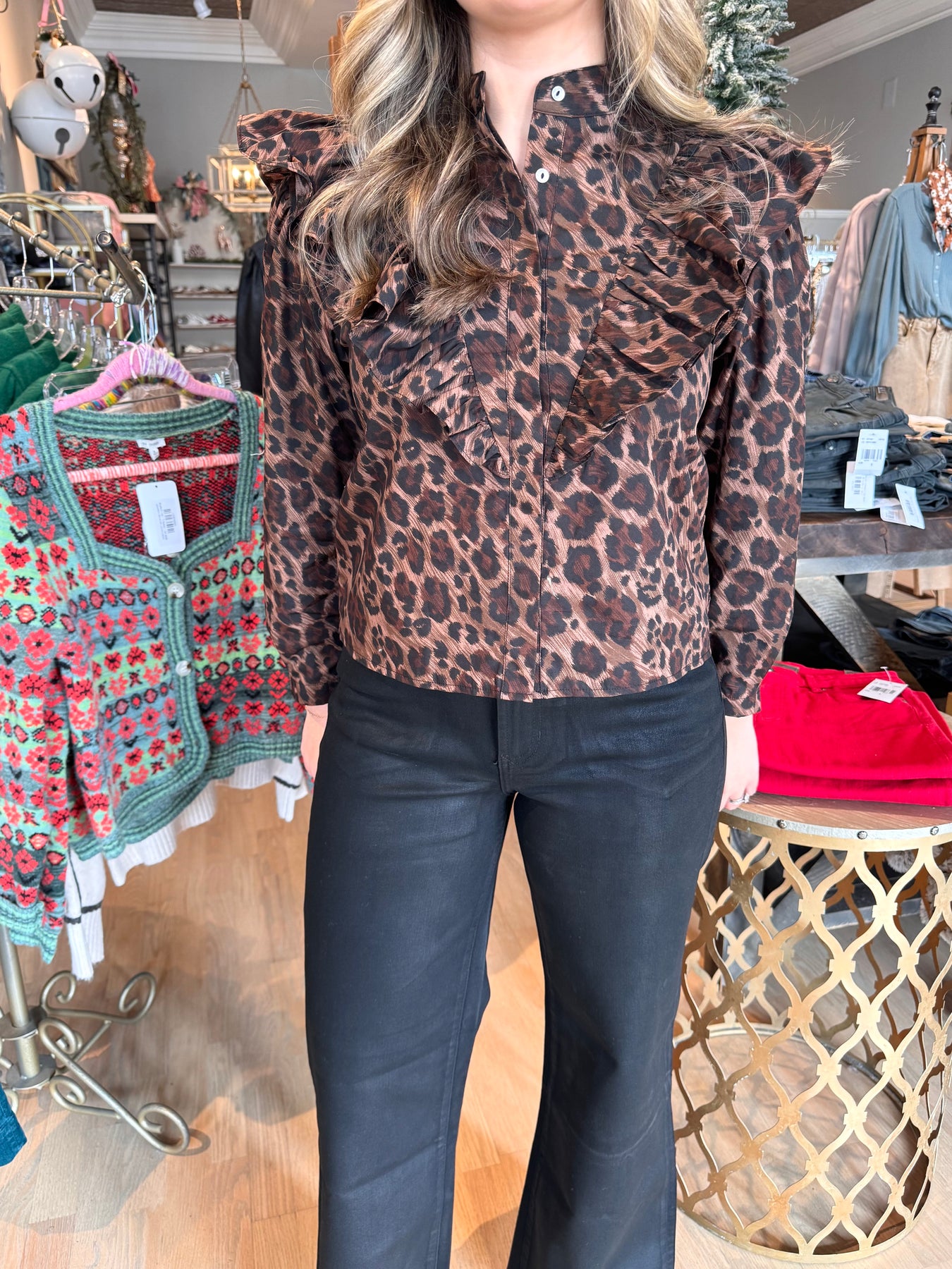 Make a statement this winter with the Karlie Leopard Ruffle Button Up Top. This bold leopard print piece is the perfect layering essential that pairs effortlessly with your favorite leather pants and skirts. The charming ruffle details add feminine flair while the classic button-up silhouette keeps it versatile and chic. Whether you're dressing up for a night out or elevating your everyday look, this adorable top brings that coveted wild-side edge to your seasonal wardrobe.