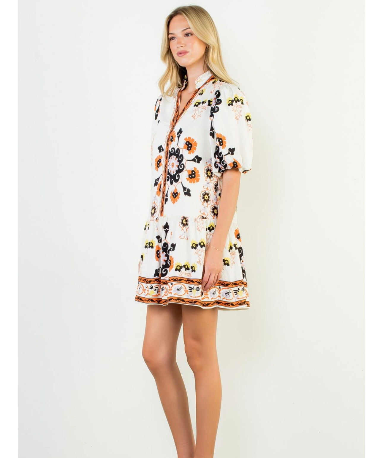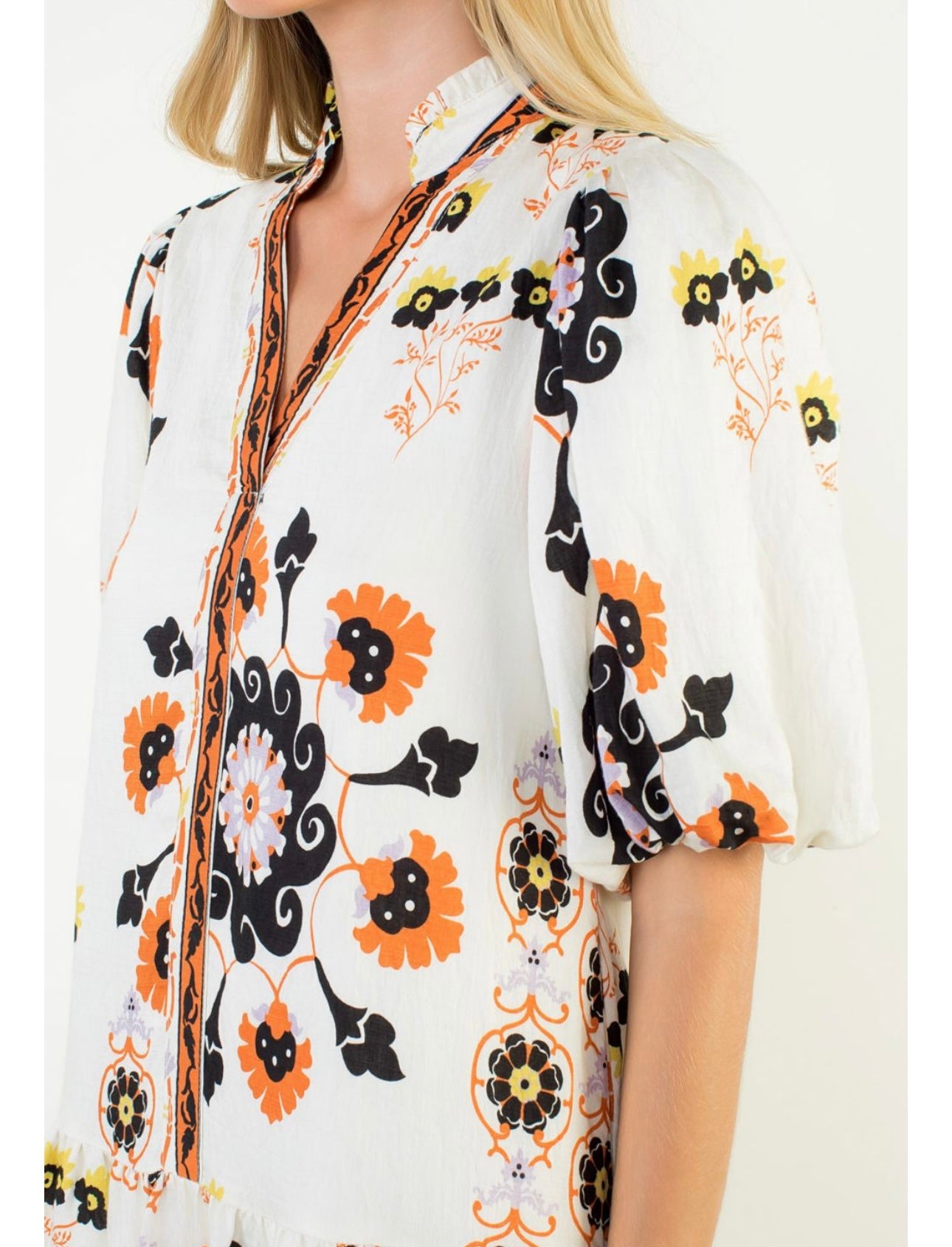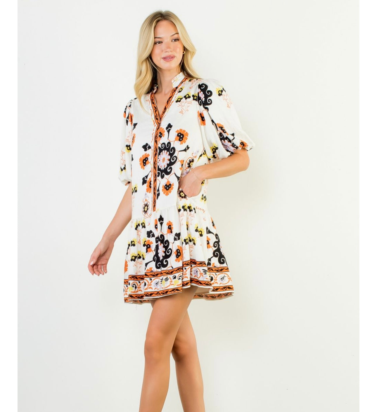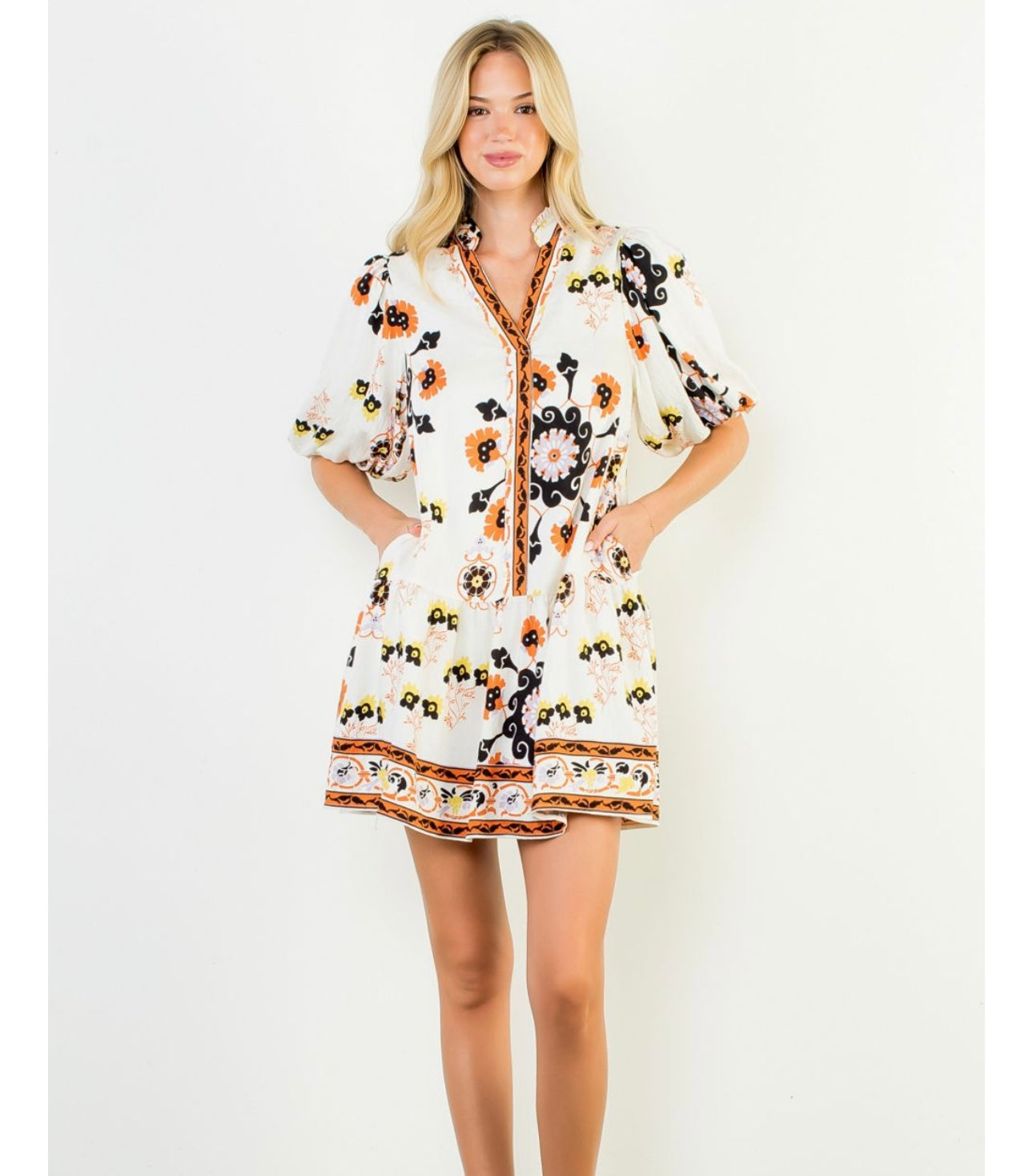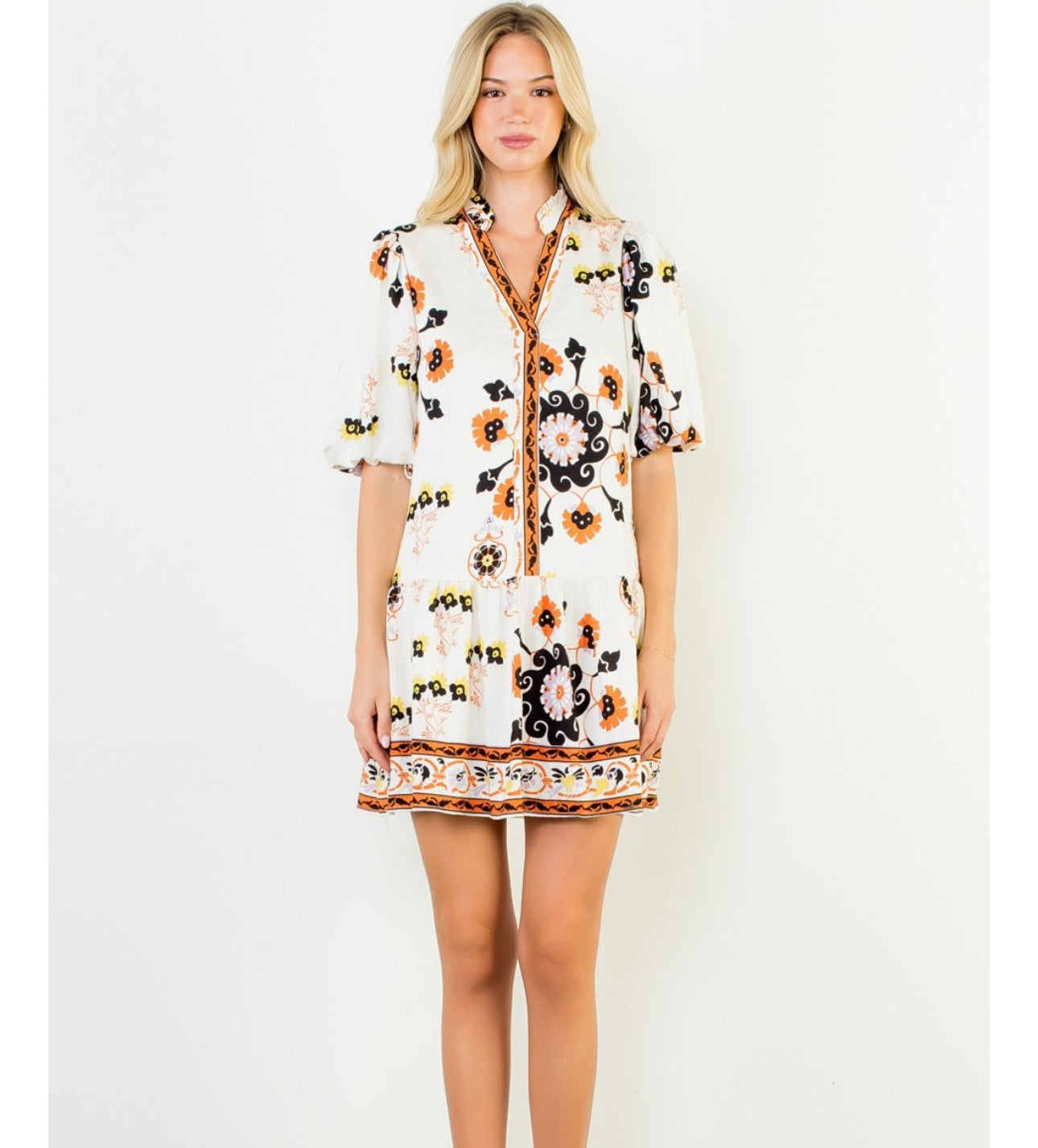 Embrace the season in this oversized Puff Sleeve Floral Dress, bursting with vibrant Fall colors and a playful print. Perfectly pairing with your favorite boots, it’s your go-to dress for effortless style and cozy comfort all autumn long. Elevate your Fall wardrobe with a look that’s both eye-catching and easy to wear.