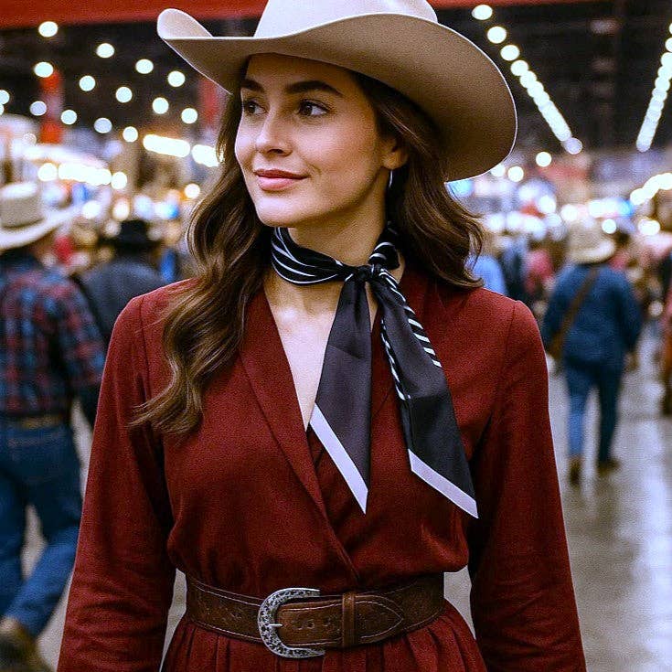 Western-Inspired Skinny Mini Scarf brings a modern twist to the traditional wild rag. Why you'll love it: * Black and white stripes * Lightweight, 100% polyester * Can be used for as a purse wrap, headband, neckerchief and more! * Express your western style, dress up any outfit * Measuring 34" x 2.5" Purse and other accessories not included.