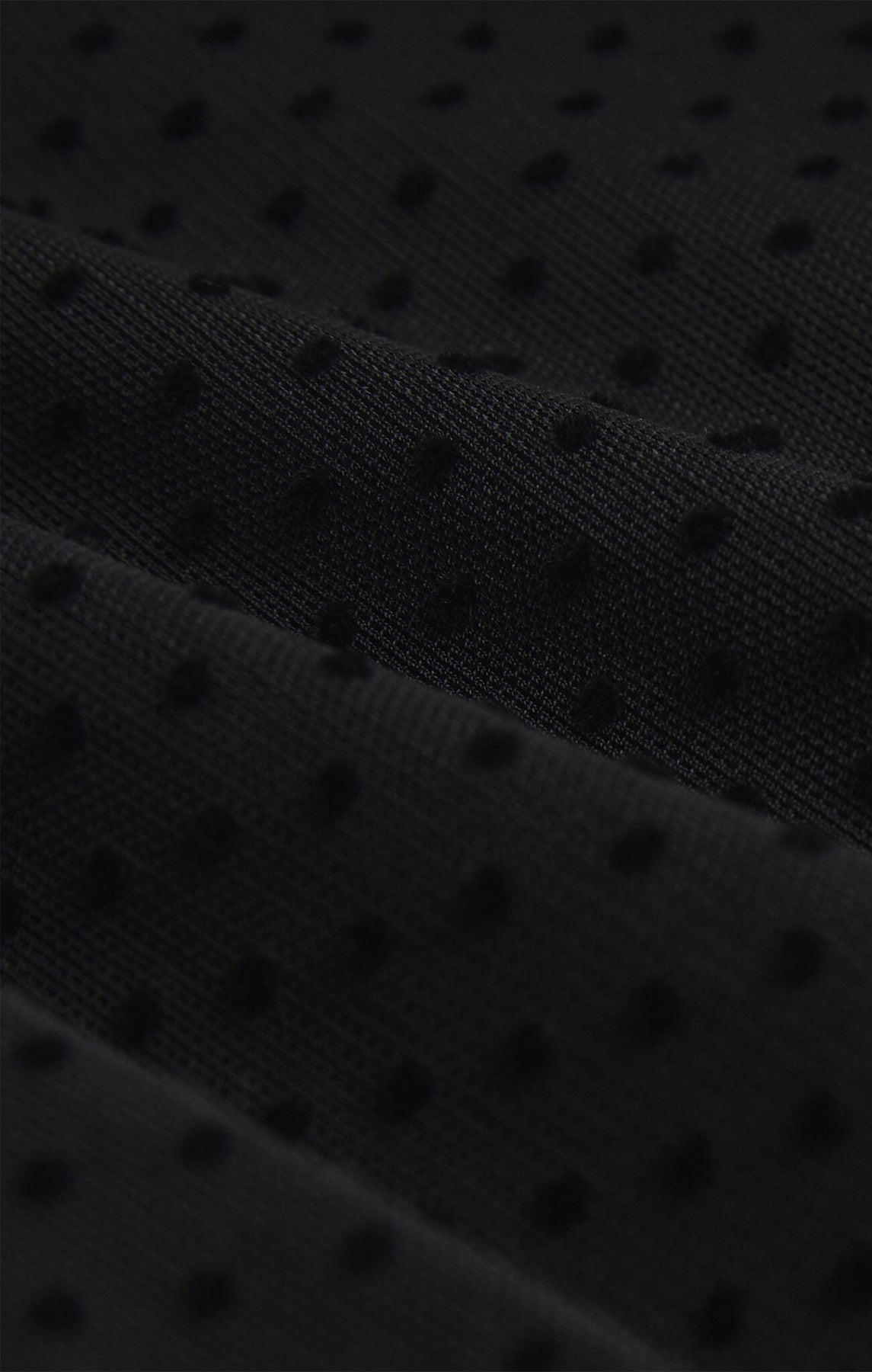 This off-shoulder top blends sheer mesh with flocked dots for an elevated, feminine look. The fitted silhouette feels lightweight and flattering, whether paired with denim or something dressier.