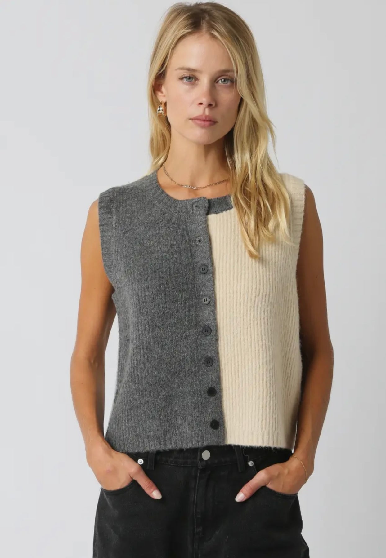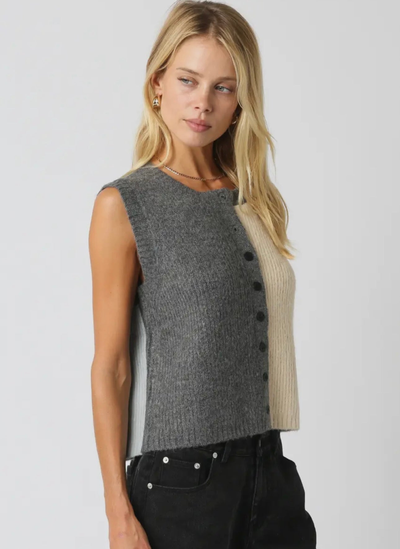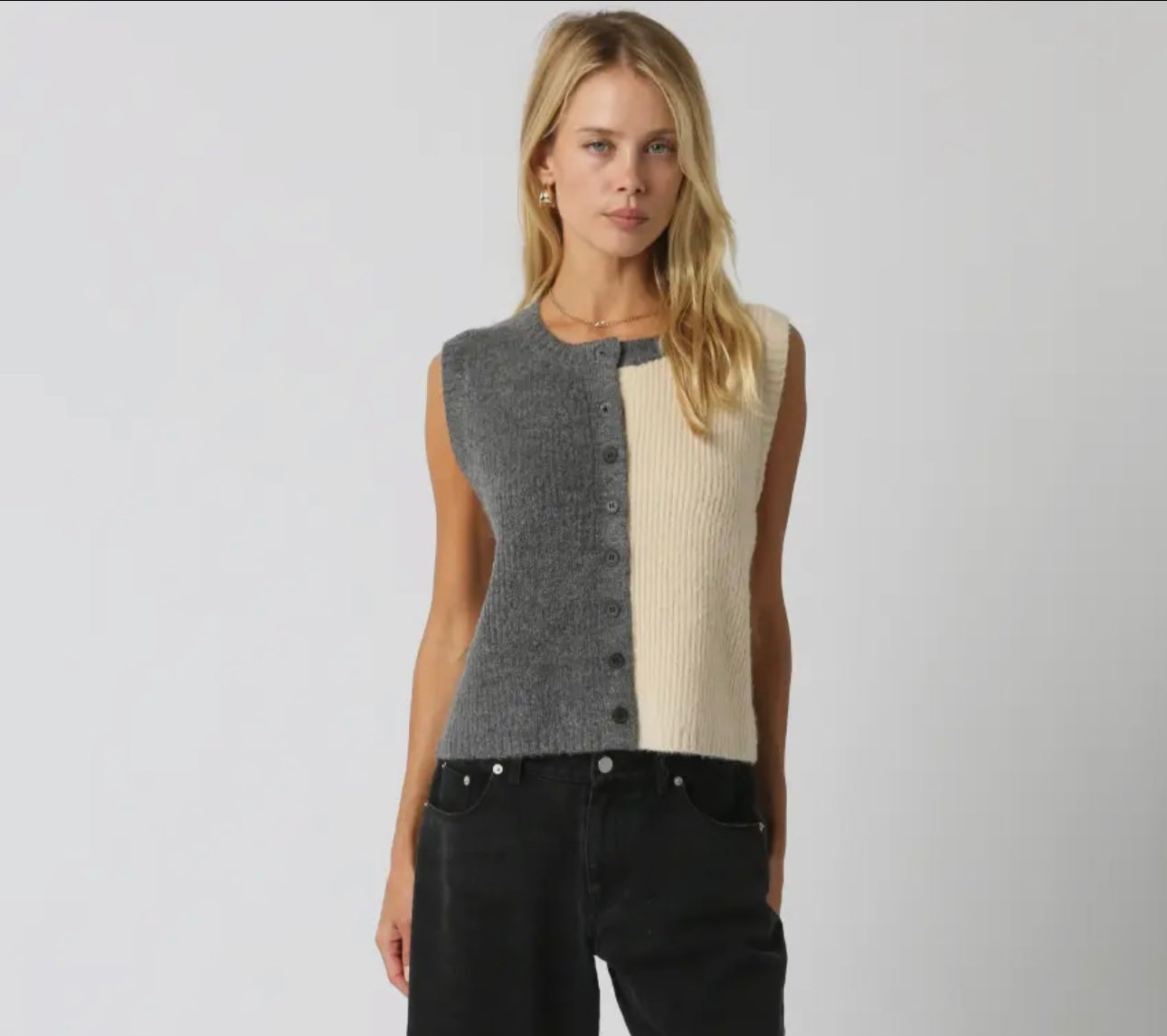 Elevate your style with this colorblock sweater vest, featuring a chic button-front design perfect for layering. Its versatile look effortlessly transitions from casual to polished, pairing beautifully with leather pants or a skirt for a trendy, put-together outfit. Add this must-have piece to your wardrobe for an easy way to boost your fashion game.