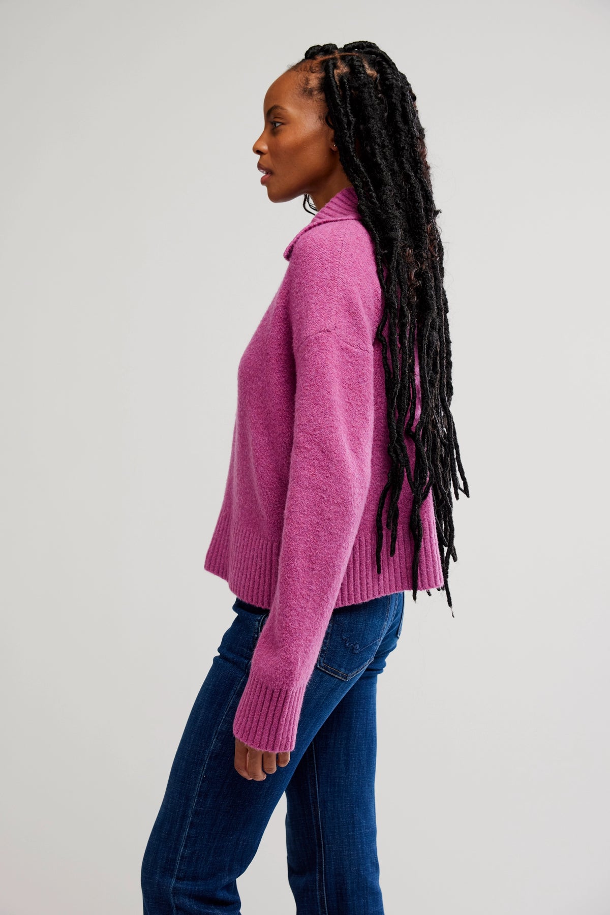 The definition of cozy, this sweater features a classic polo-inspired silhouette, a cotton-blend knit fabrication, and charming tortoise shell buttons.