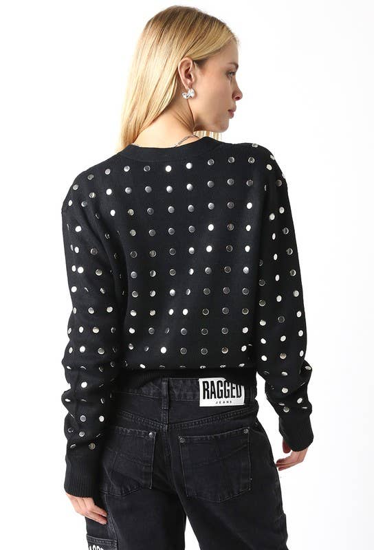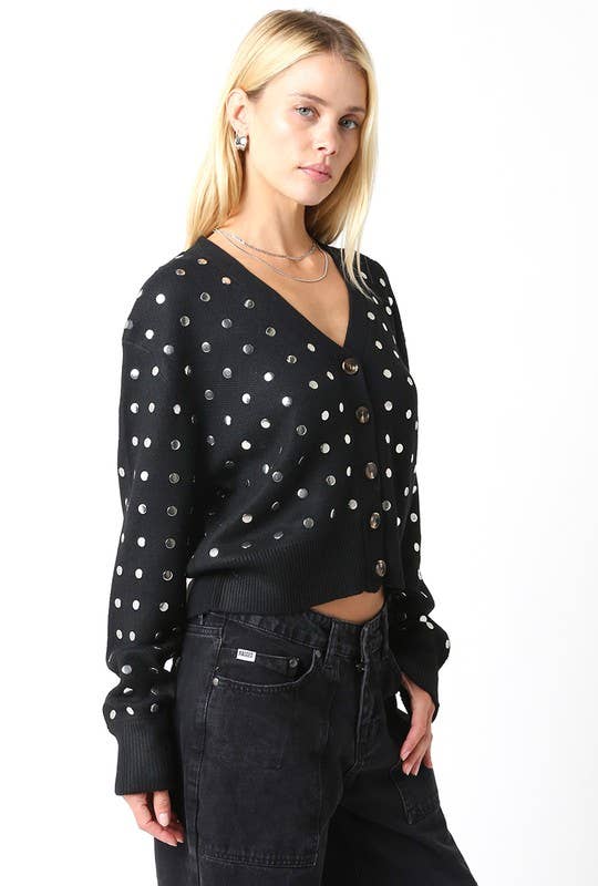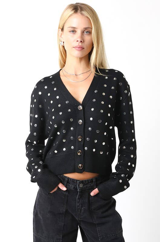 Elevate your wardrobe with our Studded Sweater, designed to combine edgy style with cozy comfort. Featuring a classic button-down front and long sleeves, this knit piece adds a bold statement to any outfit. Perfect for layering or wearing solo, it brings a fun, textured look that stands out while keeping you warm all season.