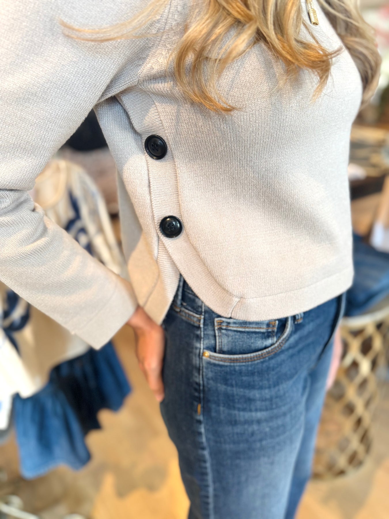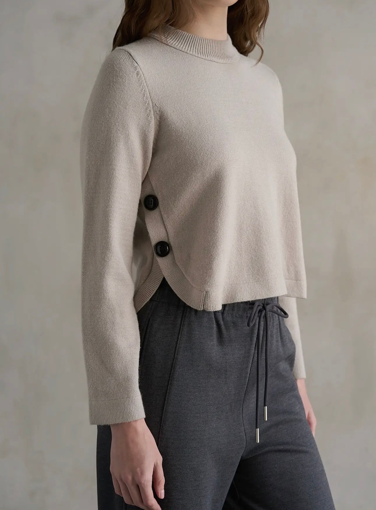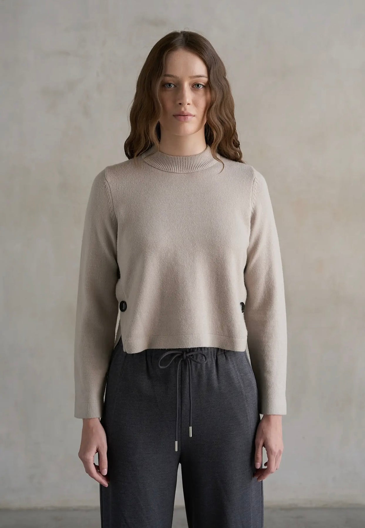 This versatile crew neck sweater offers a timeless neutral shade elevated by a playful side button detail. Perfect for adding subtle interest to your everyday wardrobe, it combines comfort with a hint of personality, making it easy to wear for any occasion while standing out just enough to catch the eye.