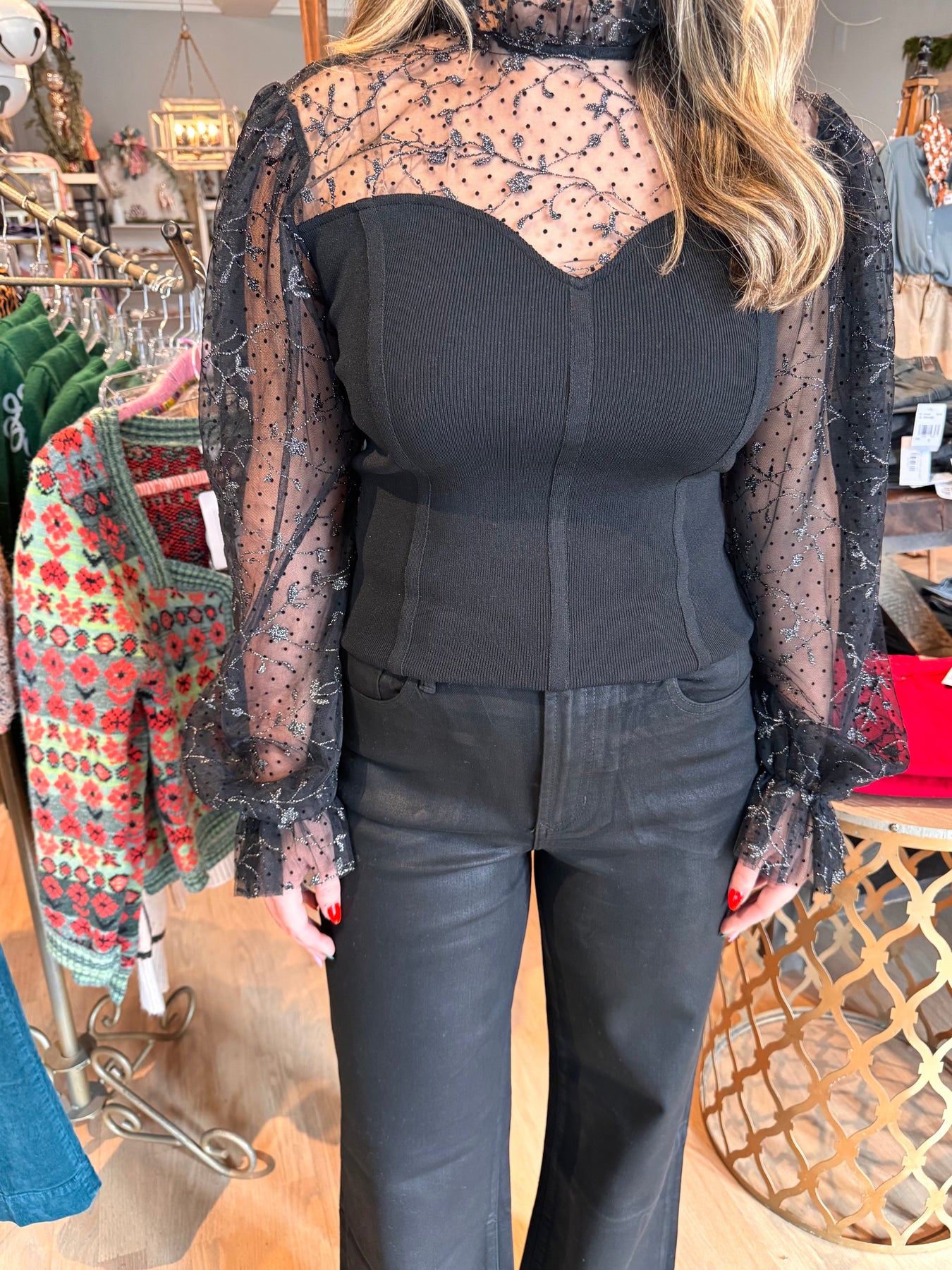 A bandage top featuring contrast, high neckline, puff long sleeve and body contouring Details Self : 50% Polyester 28% Viscose 22% Nylon Contrast : 50% Cotton 50% Polyester Lining : 100% Polyester Size & Fit - Model is 5`8" And Wearing Size Small - Measurements Taken From Size Small - Approx. Length: 21"