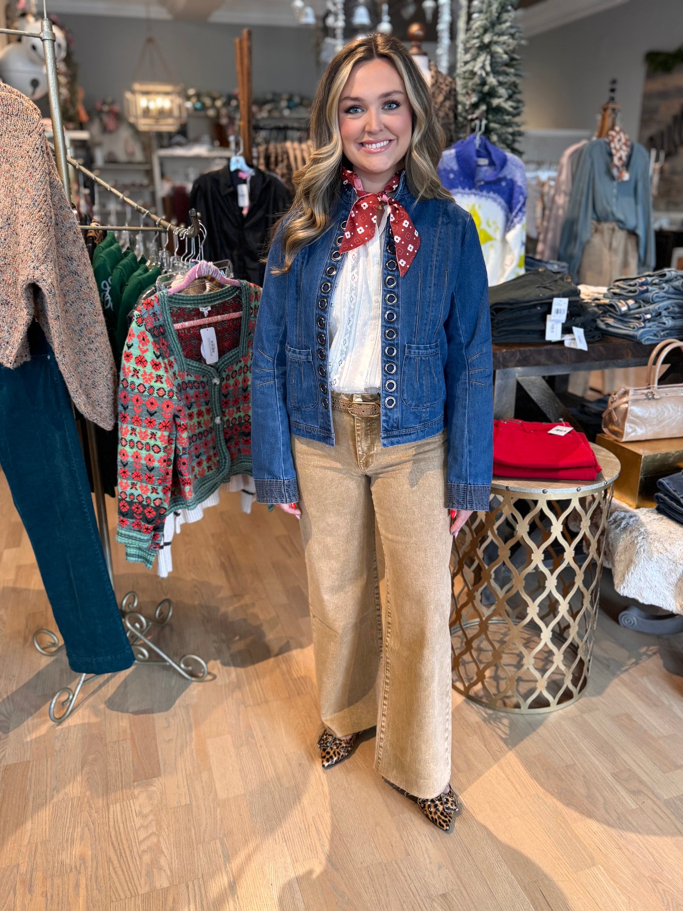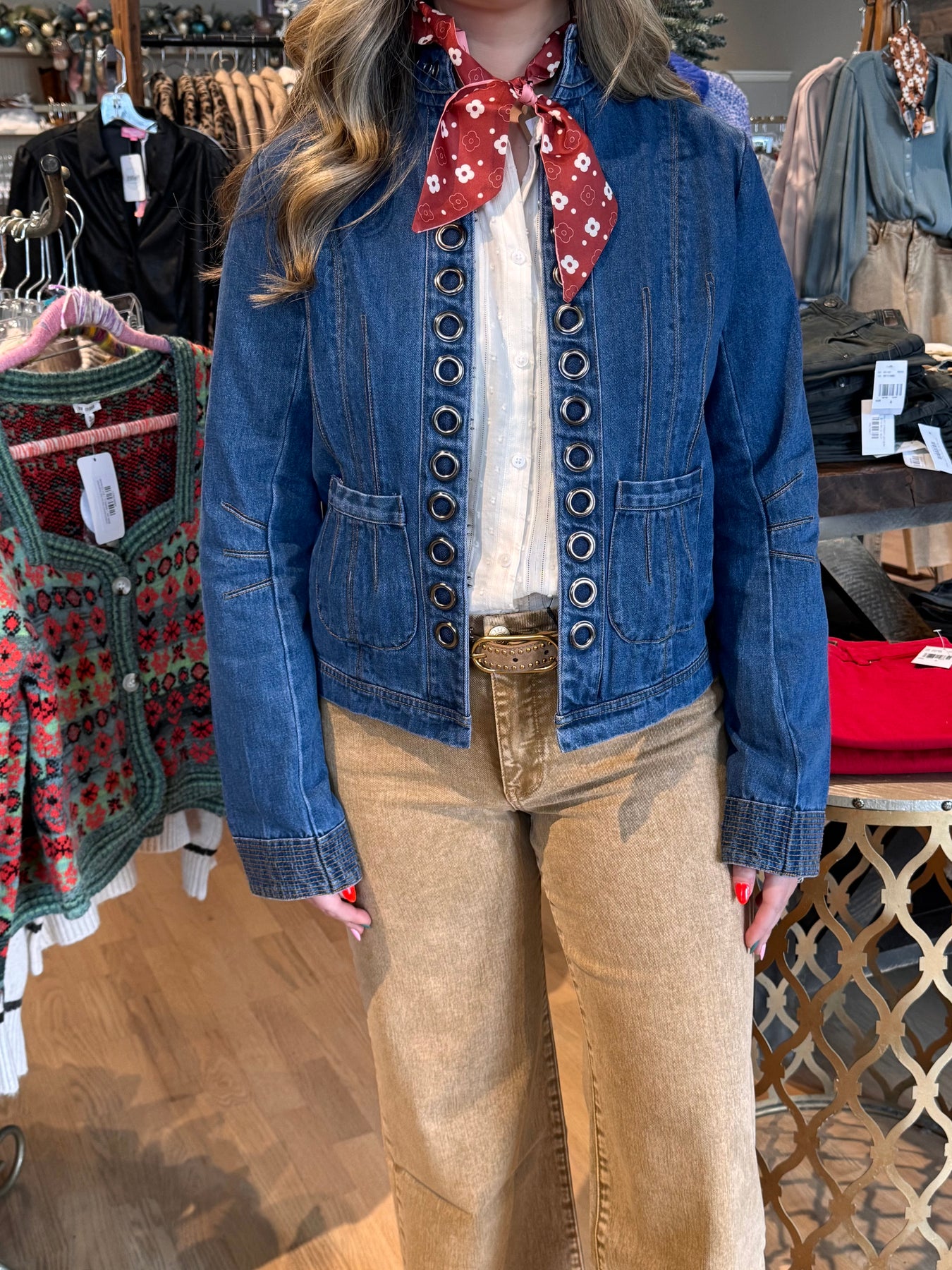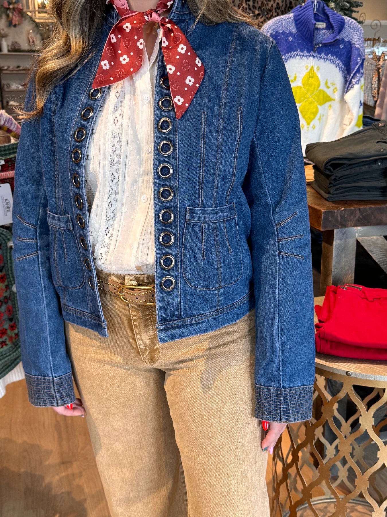 Elevate your layering game with this standout denim jacket featuring eye-catching grommet details that add an edgy, modern twist. Perfect for throwing over dresses to create unexpected contrast, this piece transforms any outfit from ordinary to fashion-forward. The grommet accents deliver that coveted "fun and different" vibe that sets you apart. Versatile enough for casual wear yet distinctive enough to make a statement, this jacket is your new go-to for effortless style with personality.