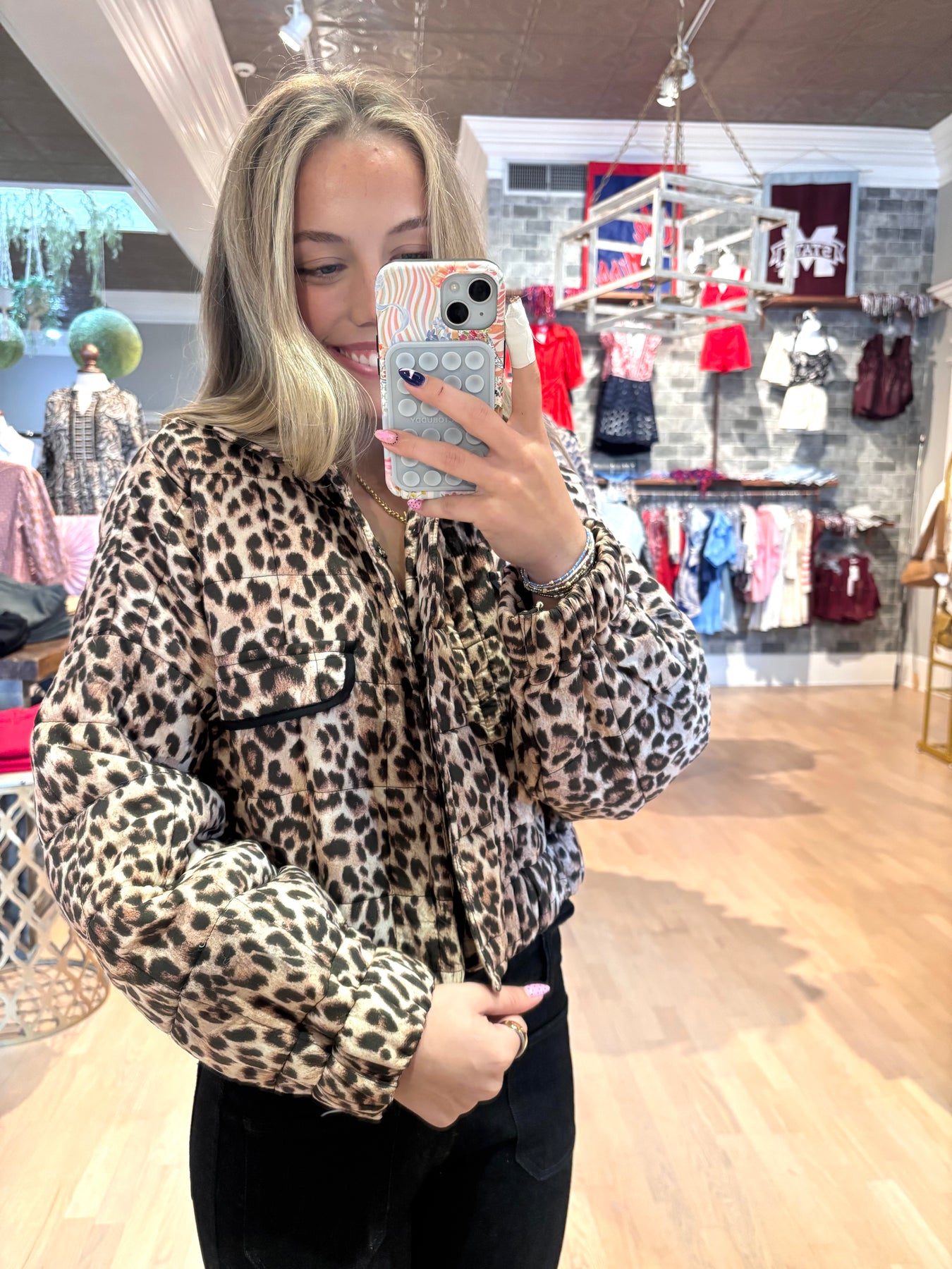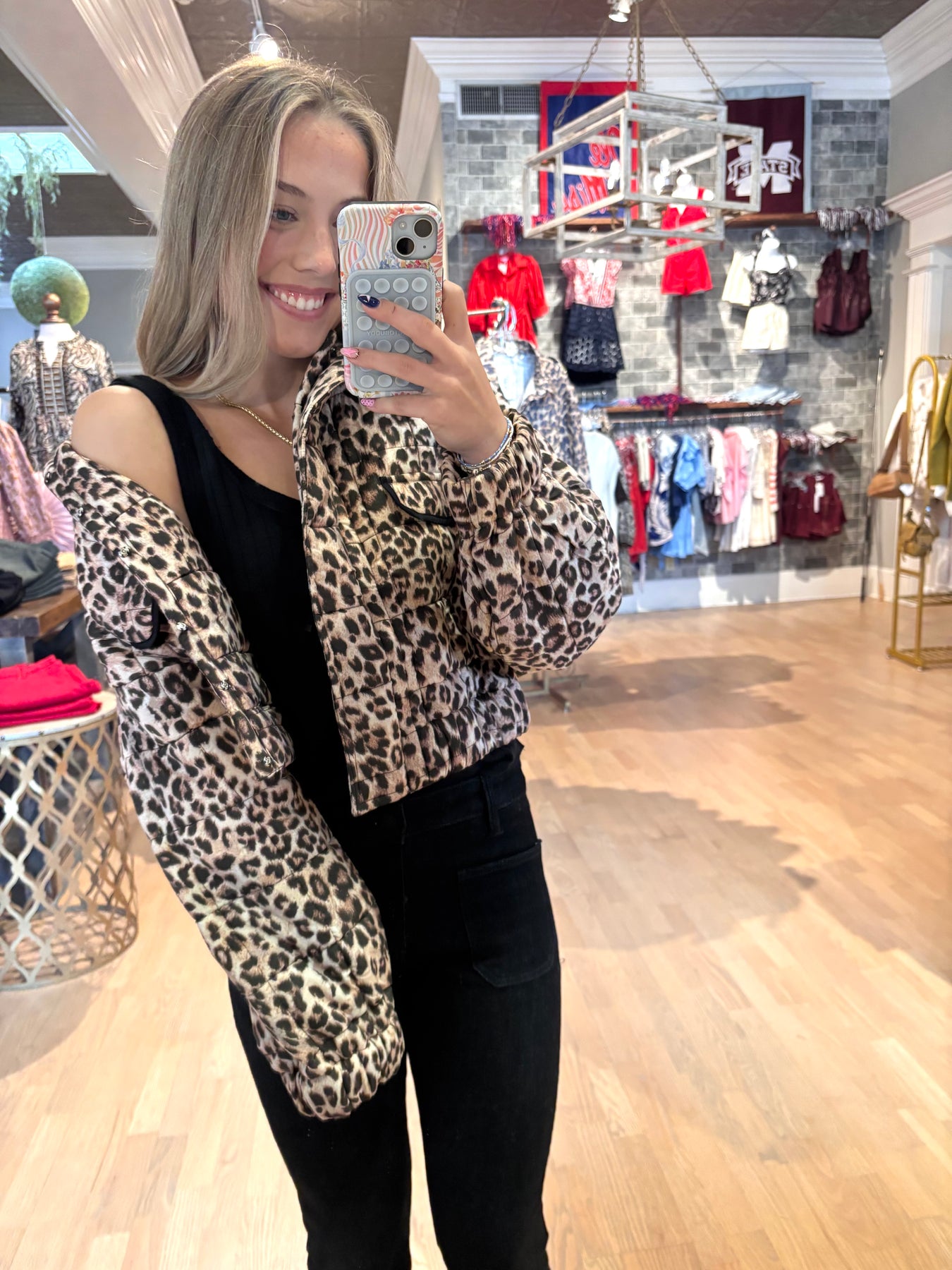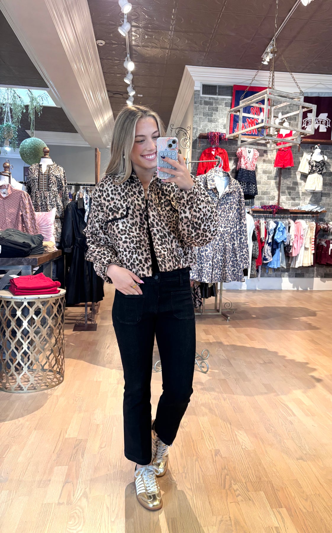 Make a bold statement with the Lissandra Jacket, featuring a trendy animal print and convenient front pockets. Its cropped design enhances your silhouette while providing practical storage, combining style and function effortlessly. Perfect for adding a wild edge to any outfit.