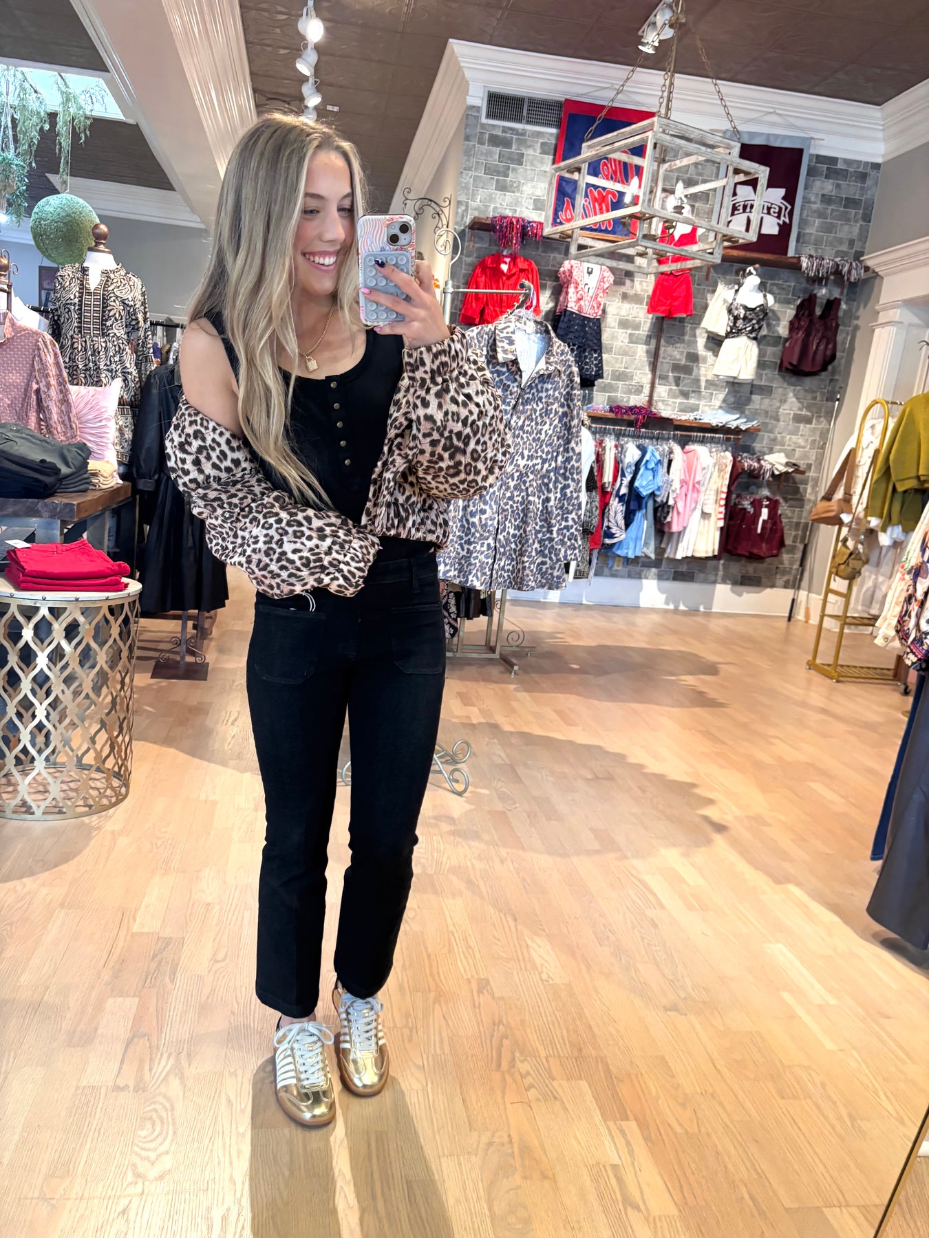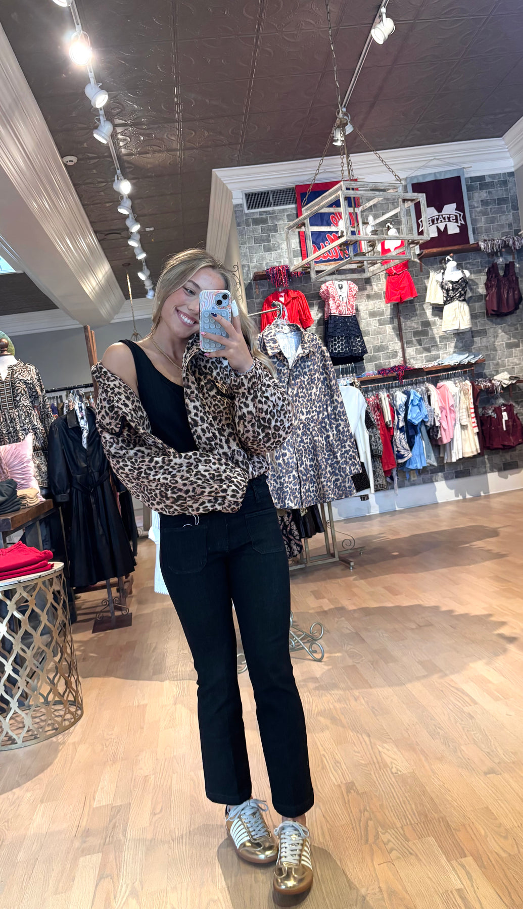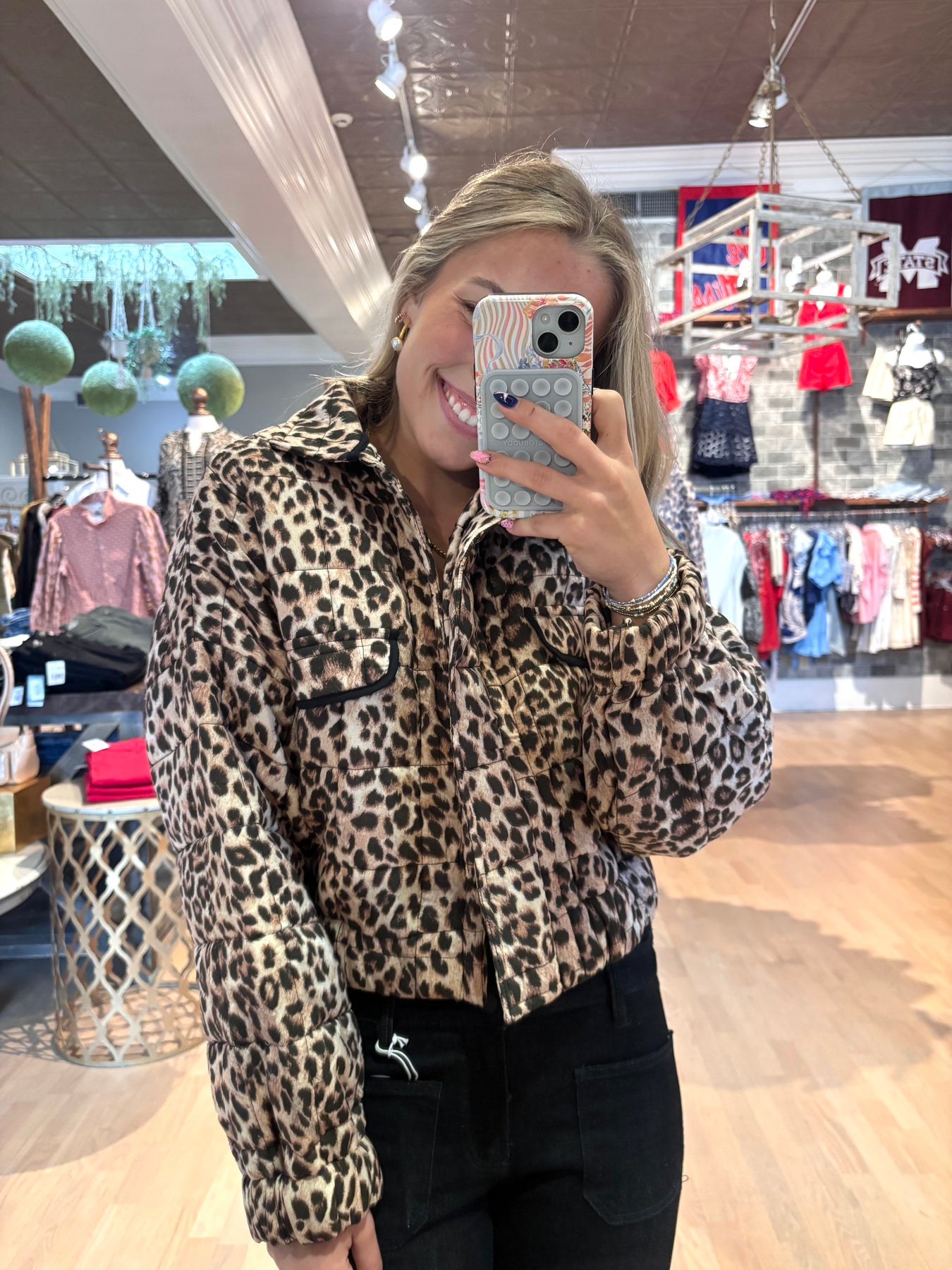 Make a bold statement with the Lissandra Jacket, featuring a trendy animal print and convenient front pockets. Its cropped design enhances your silhouette while providing practical storage, combining style and function effortlessly. Perfect for adding a wild edge to any outfit.
