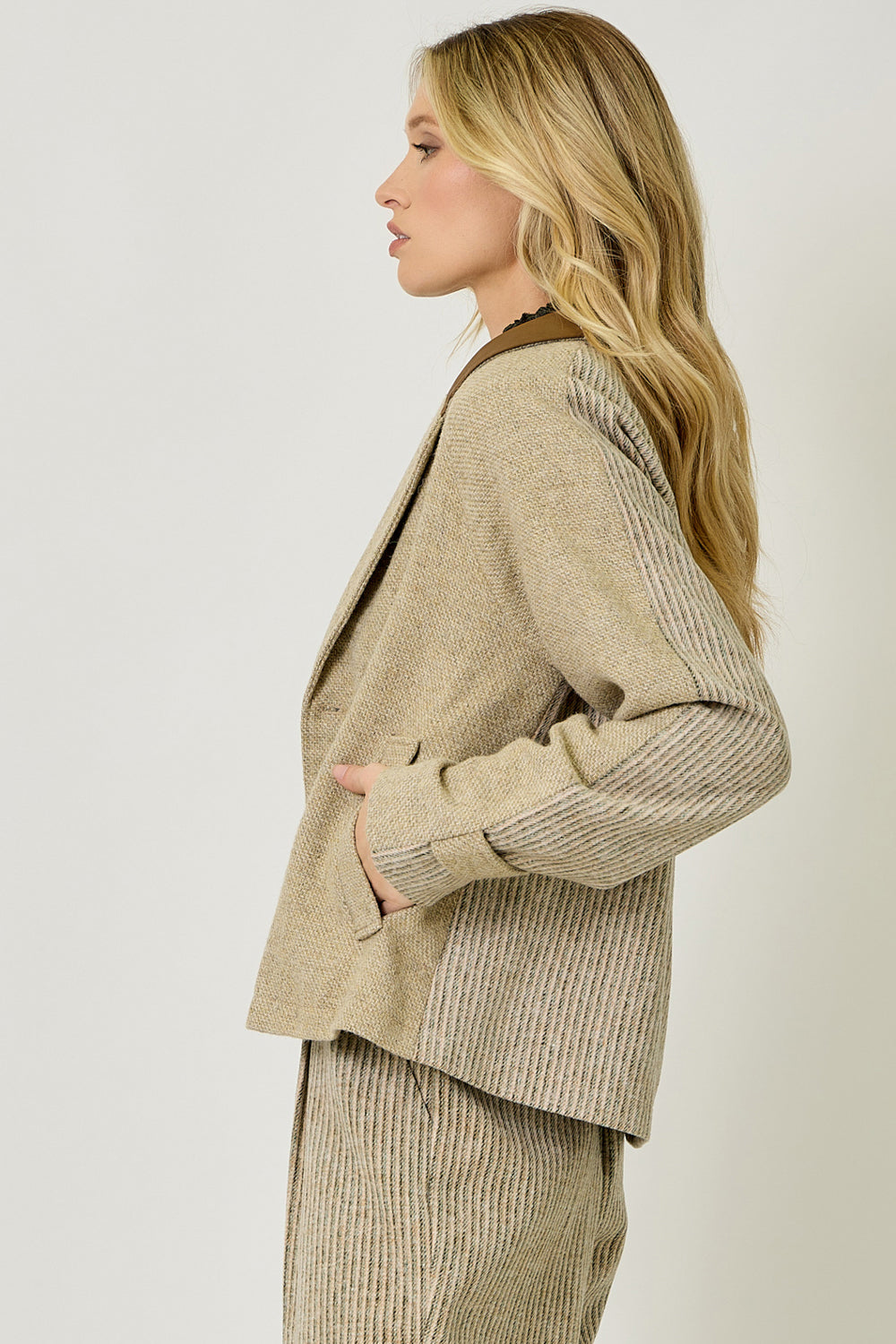 The Mixed Media Jacket offers an oversized fit that effortlessly balances comfort and style. Wear it as a statement outfit piece or throw it on as a versatile jacket to complete any look with ease. Perfect for layering, this jacket adapts to your mood and occasion, making it a must-have addition to your wardrobe.