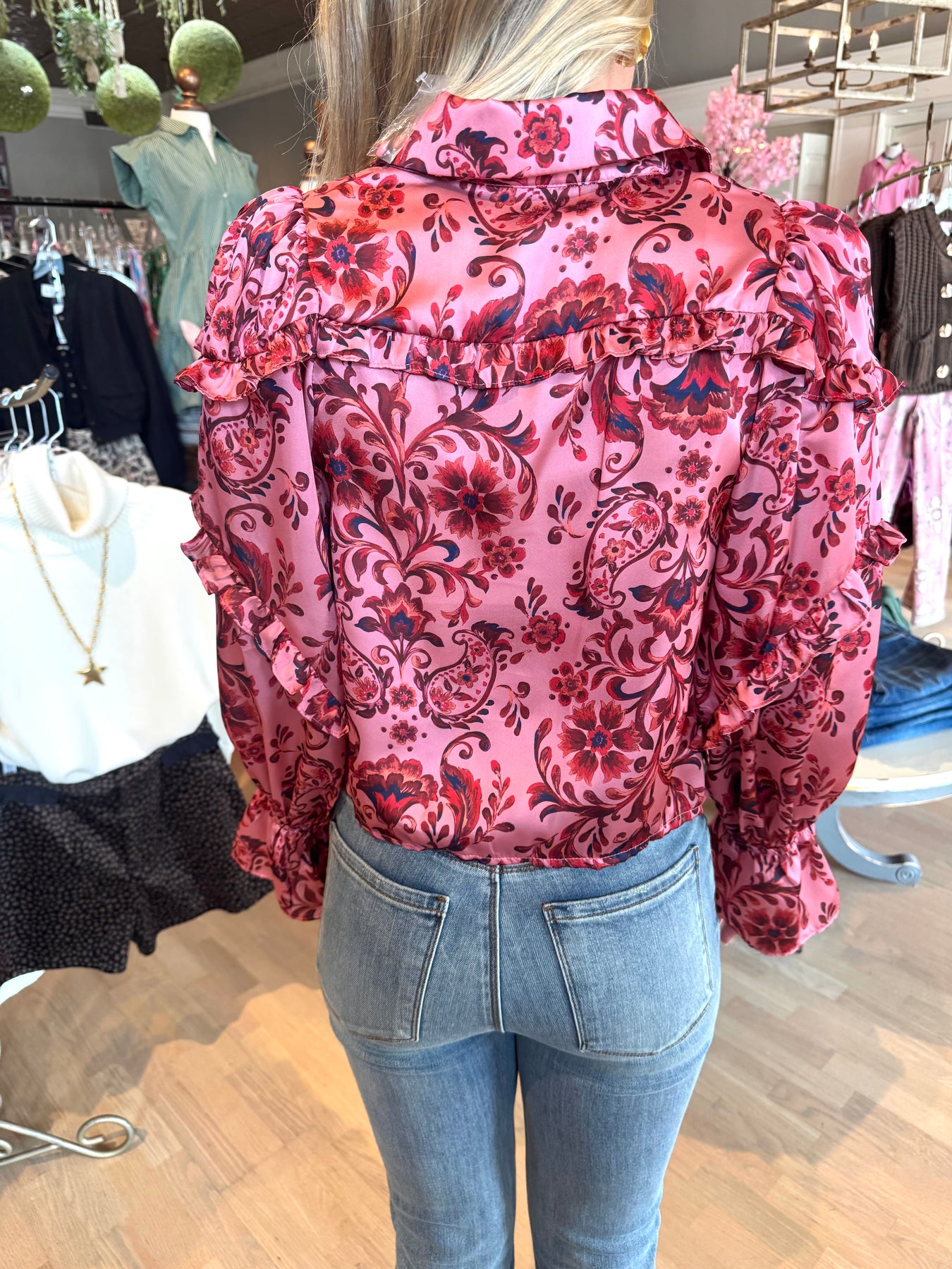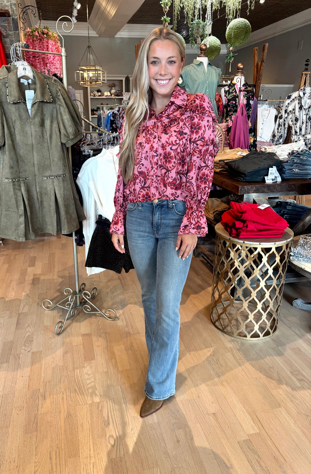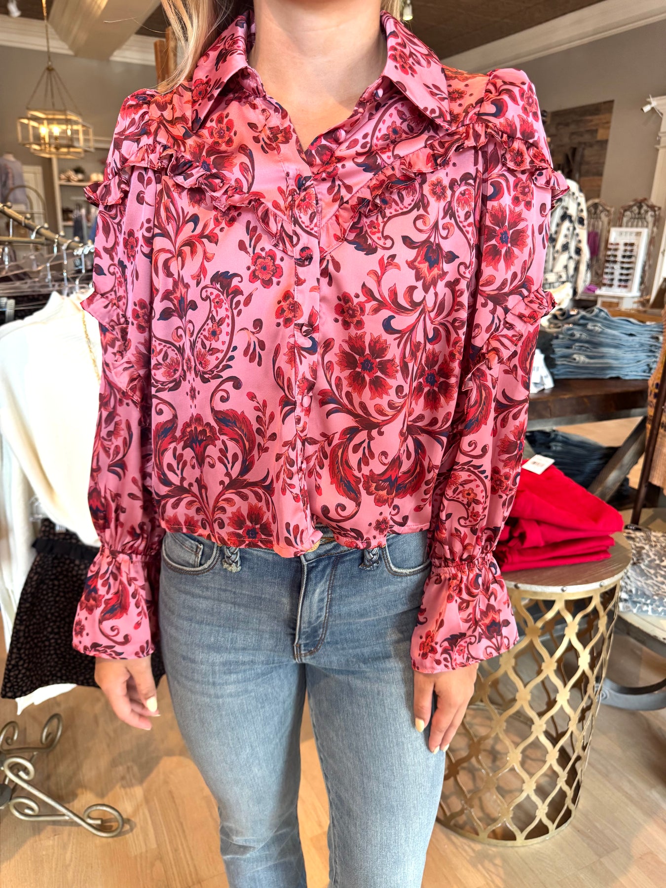 Embrace fall’s finest with this stunning print blouse in vibrant reds and berry tones. Its delicate, feminine design effortlessly elevates your look, whether dressed up for a special occasion or styled casually for everyday charm. This versatile top brings warmth and beauty to your seasonal wardrobe.
