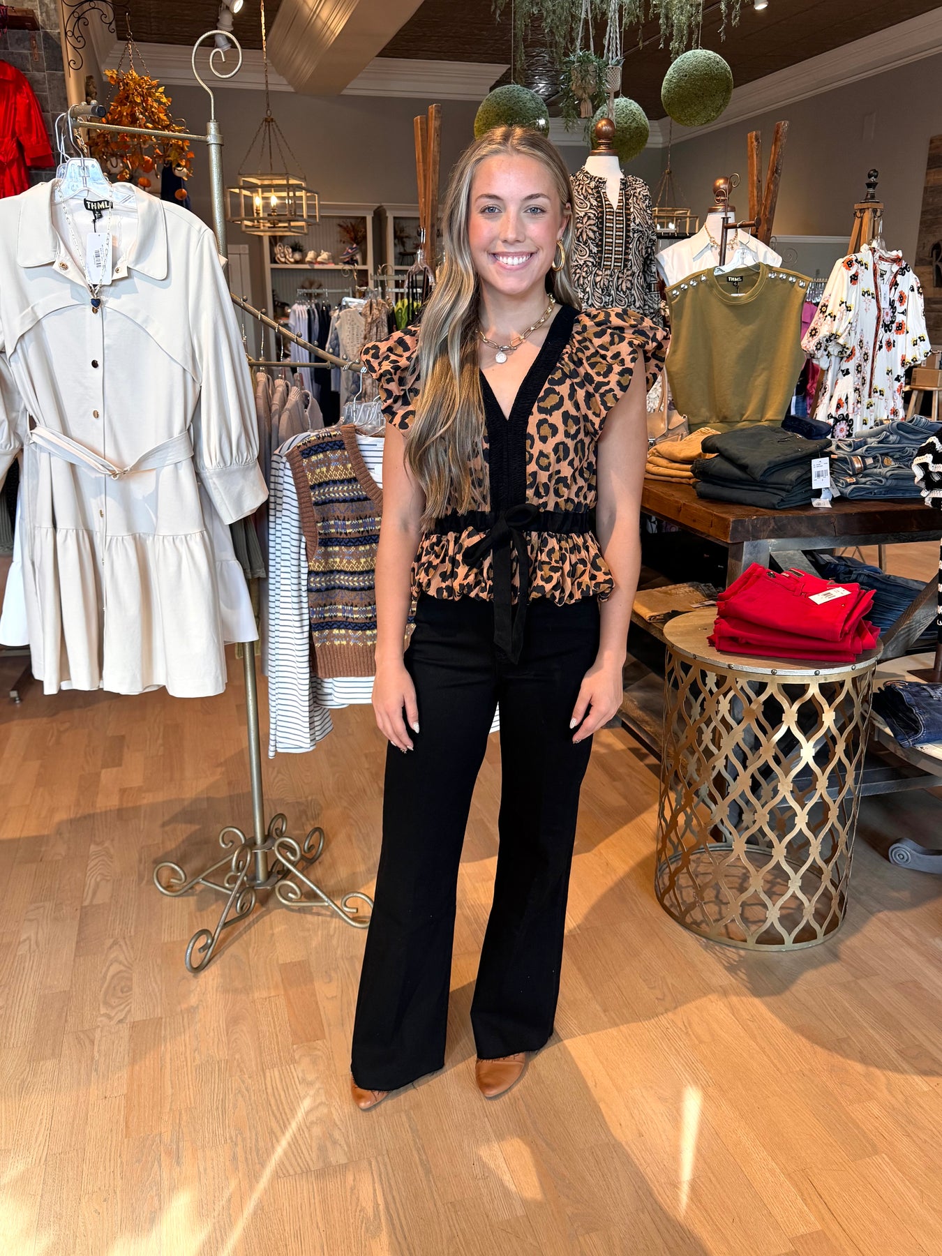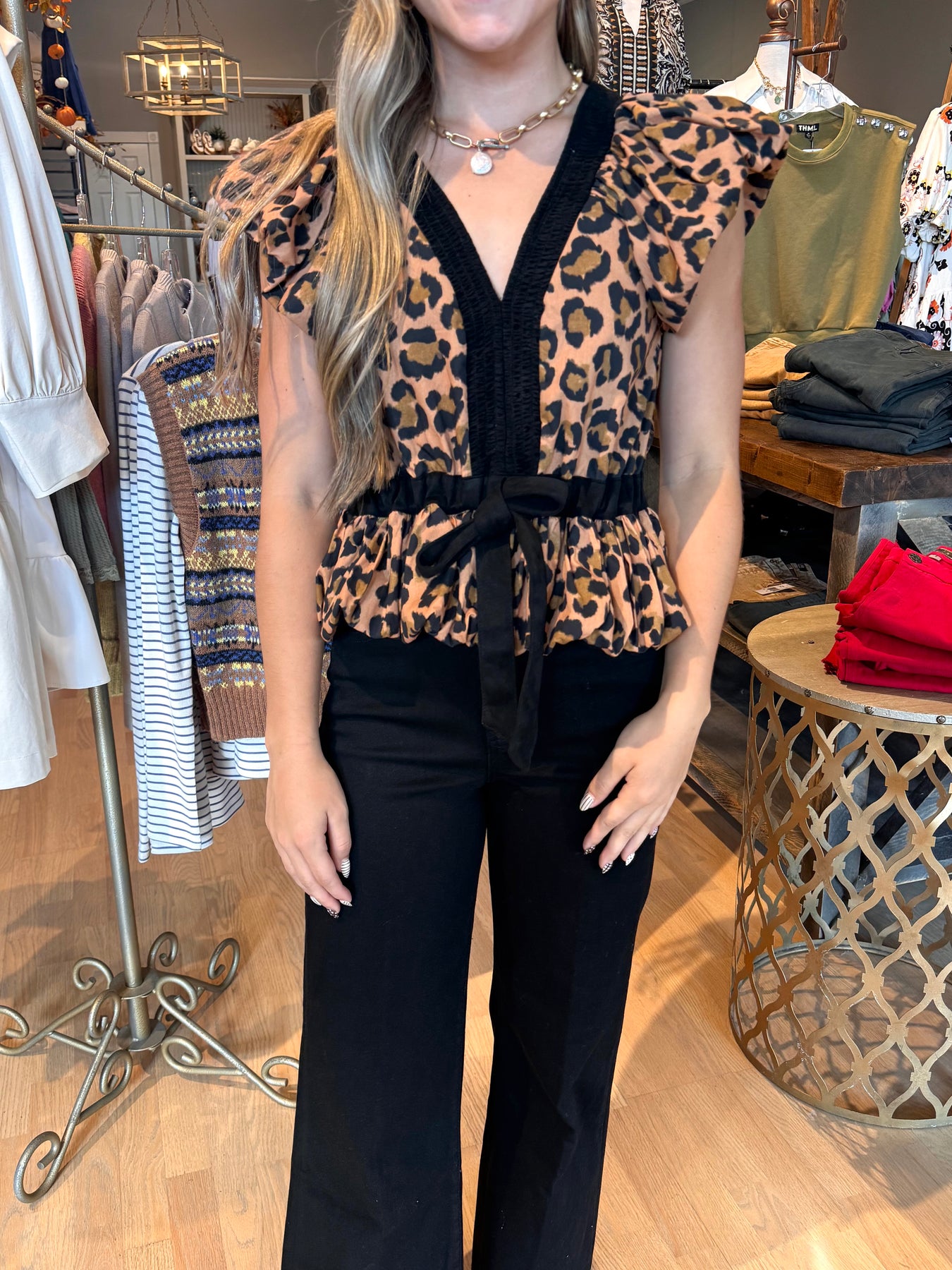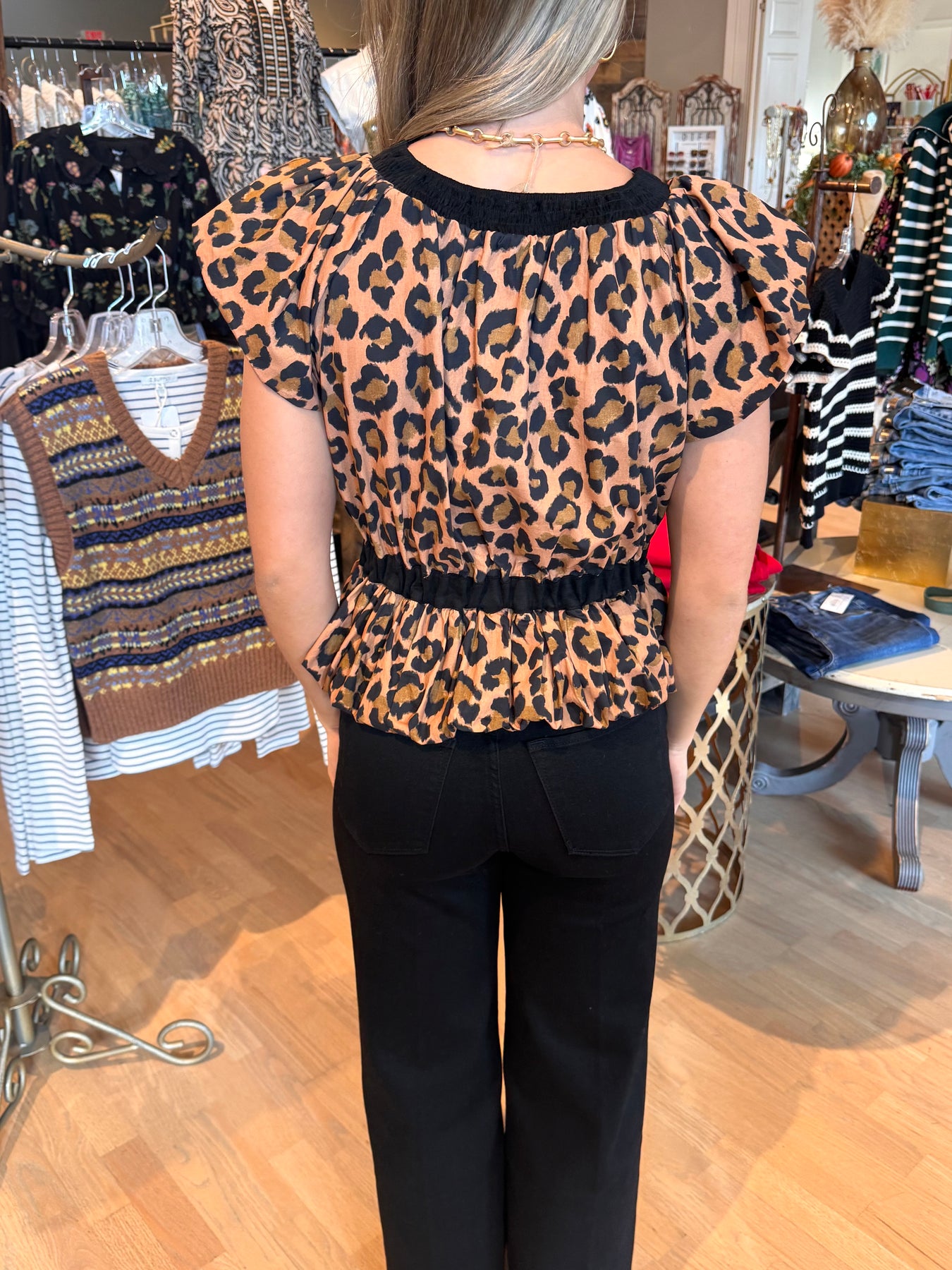 This puff sleeve cheetah print top brings playful elegance to your wardrobe. Its flattering silhouette works perfectly on its own, under a blazer for a polished look, or layered over a fitted long sleeve tee for added style and warmth. Versatile and chic, it effortlessly enhances any outfit while showcasing a bold, trendy pattern.