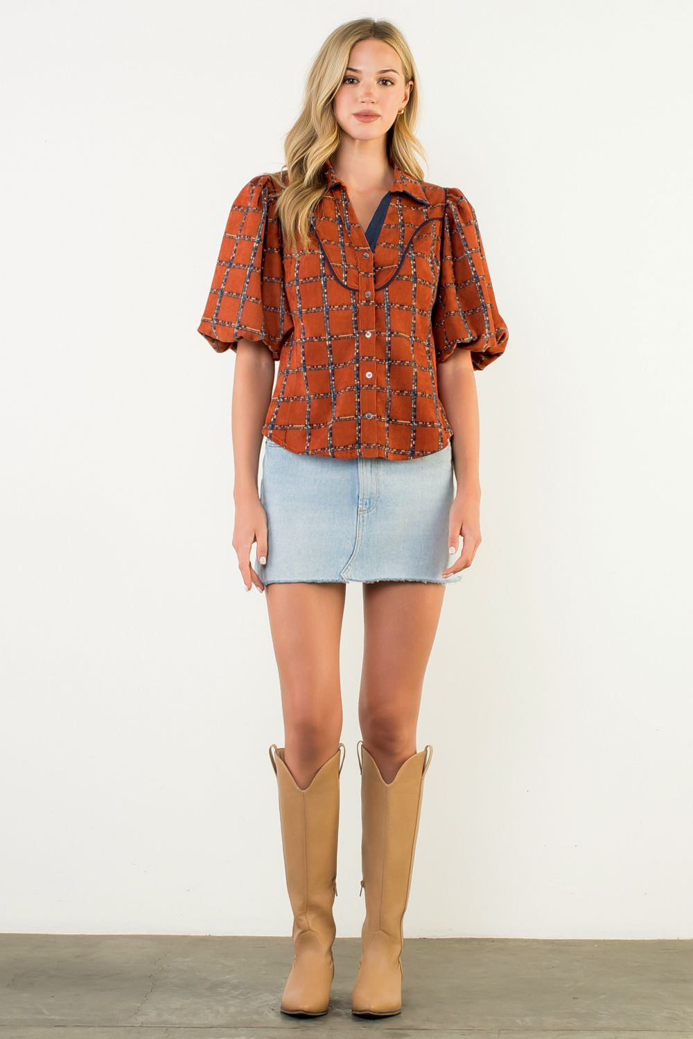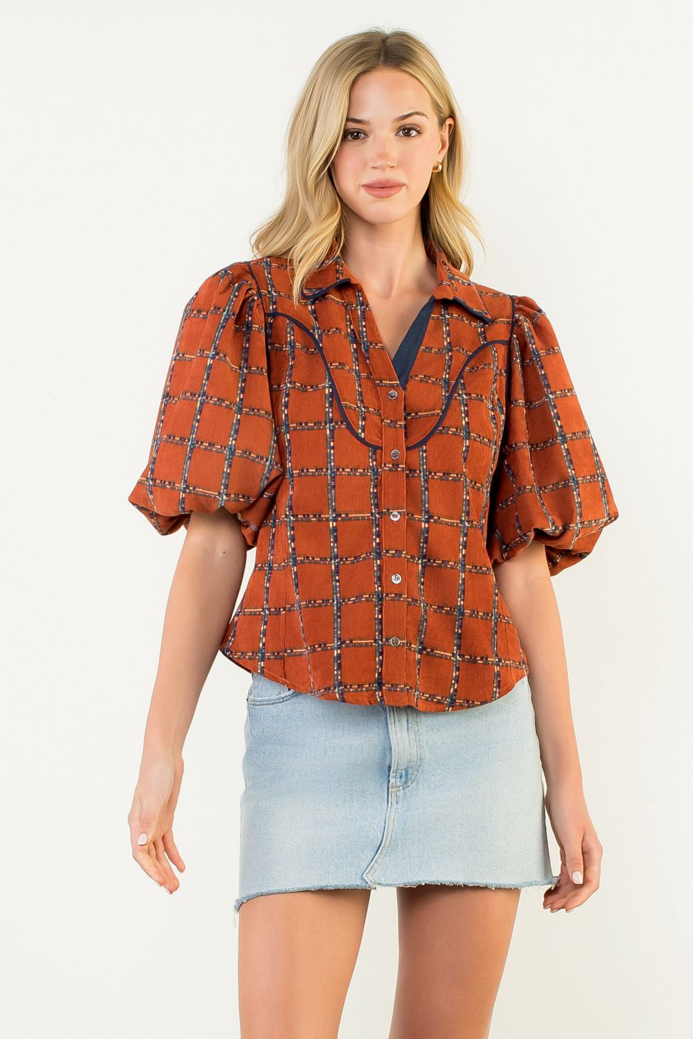 Embrace vibrant style with this Puff Sleeve Plaid Corduroy Top. Its rich cord plaid pattern adds warmth and character, while the puff sleeves create a playful, feminine silhouette. Perfectly paired with dark denim and chic loafers, this top effortlessly elevates your everyday look with a touch of vintage charm and modern flair.