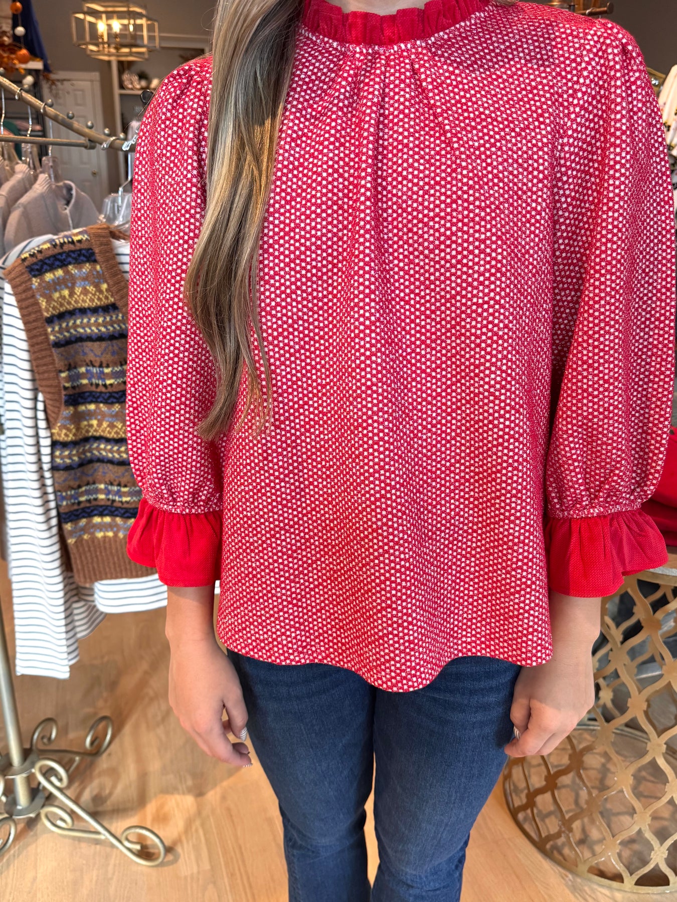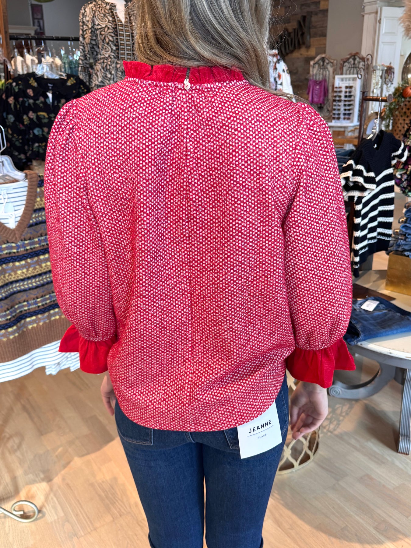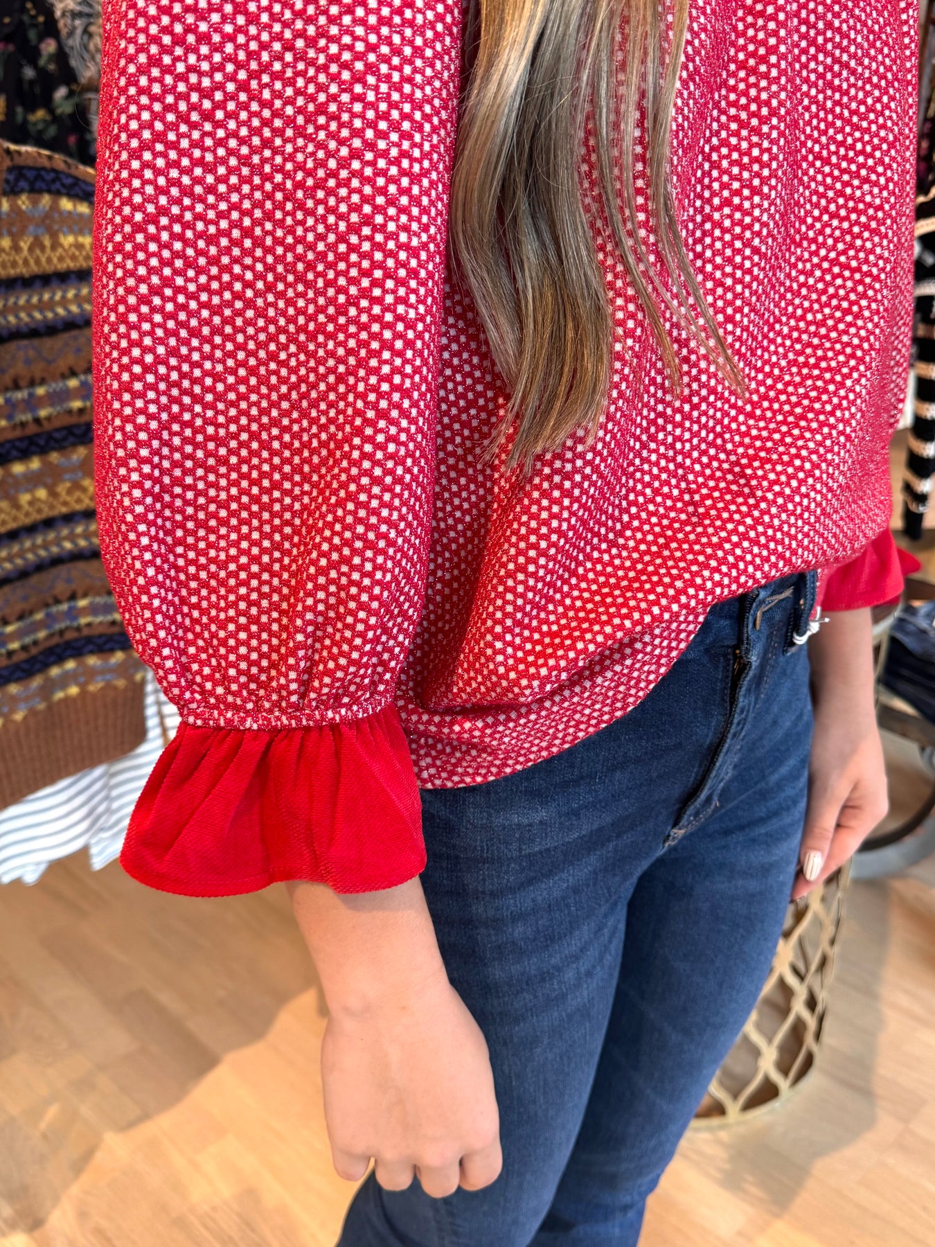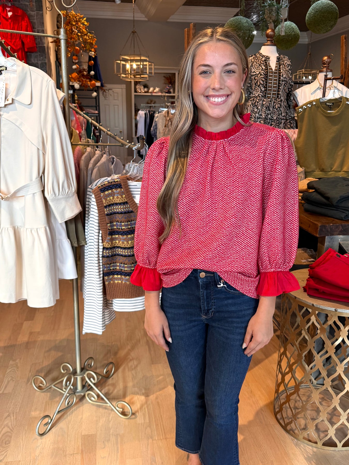 This vibrant red top brings energy to any outfit with its playful ruffle detailing and subtle shimmer. Crafted from textured, speckled knit fabric, it offers both style and a unique tactile feel. Perfect for making a statement, it adds a touch of fun and sparkle to your wardrobe while keeping comfort in mind.