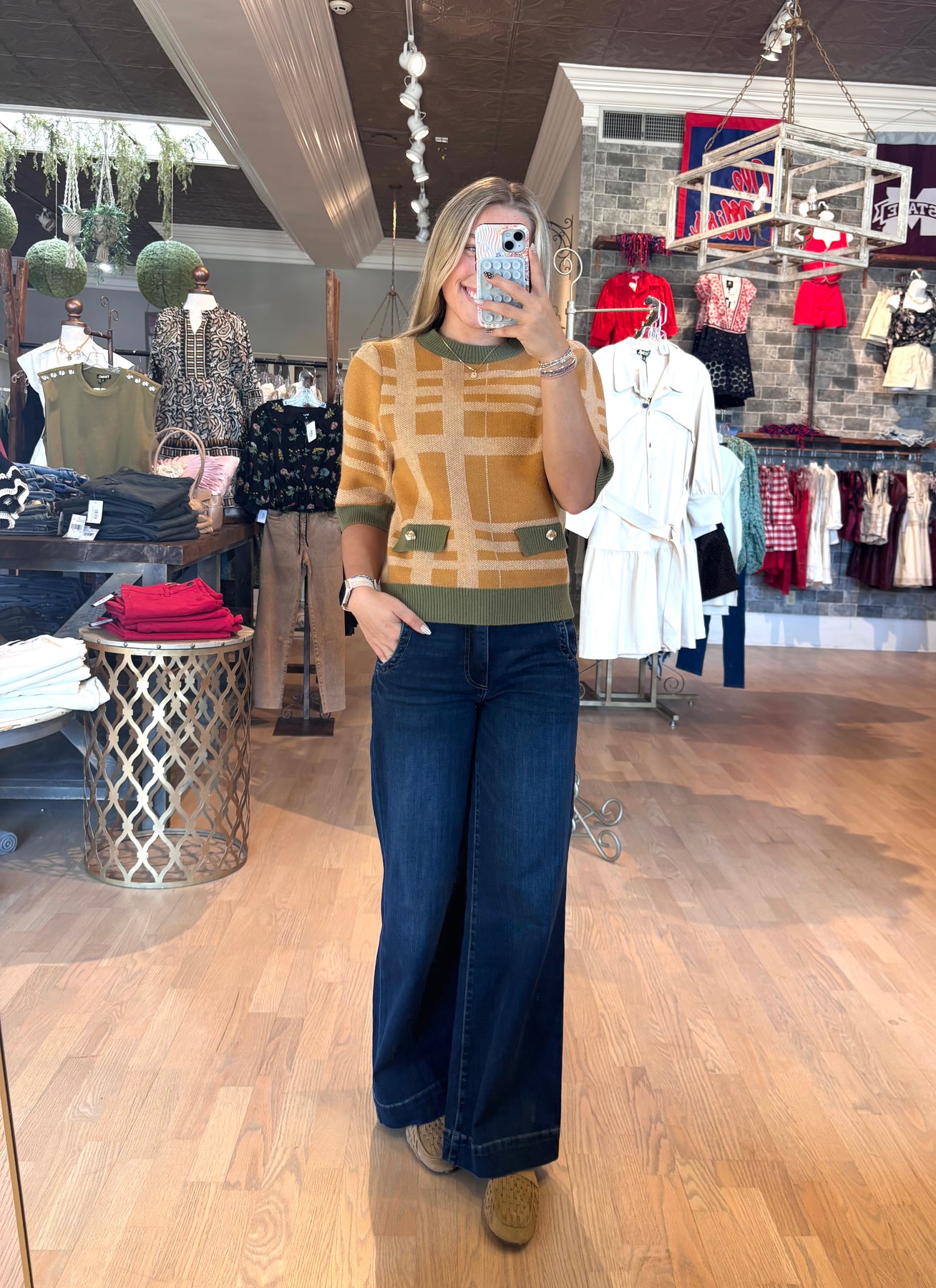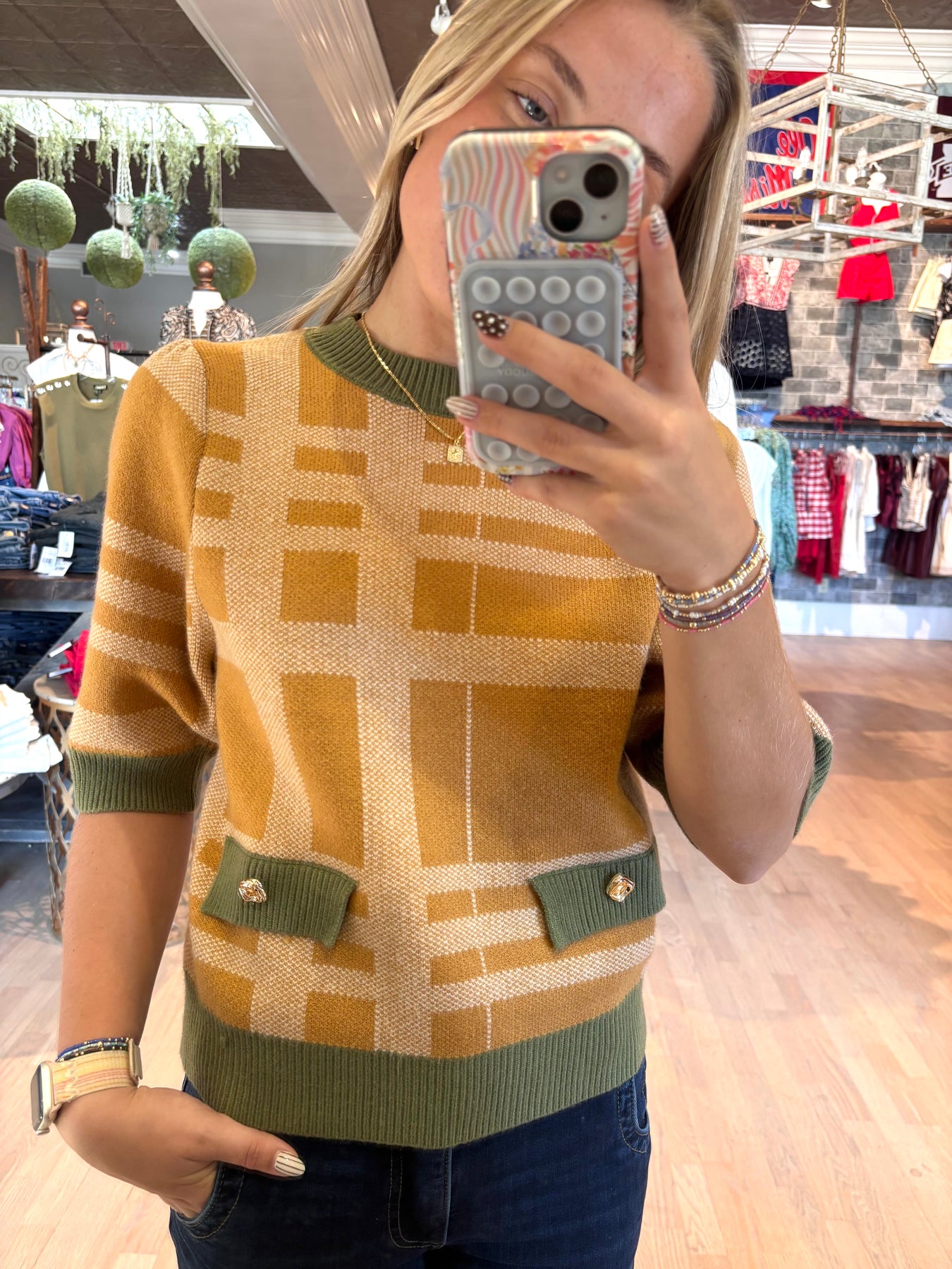Celebrate the richness of Fall with this short sleeve sweater top, featuring the season’s most beautiful colors. Its unique pattern detail adds a stylish touch, making it perfect to pair with olive pants or jeans for an effortlessly cute look. Elevate your wardrobe with this versatile piece designed to keep you comfortable and fashionable throughout the season.
