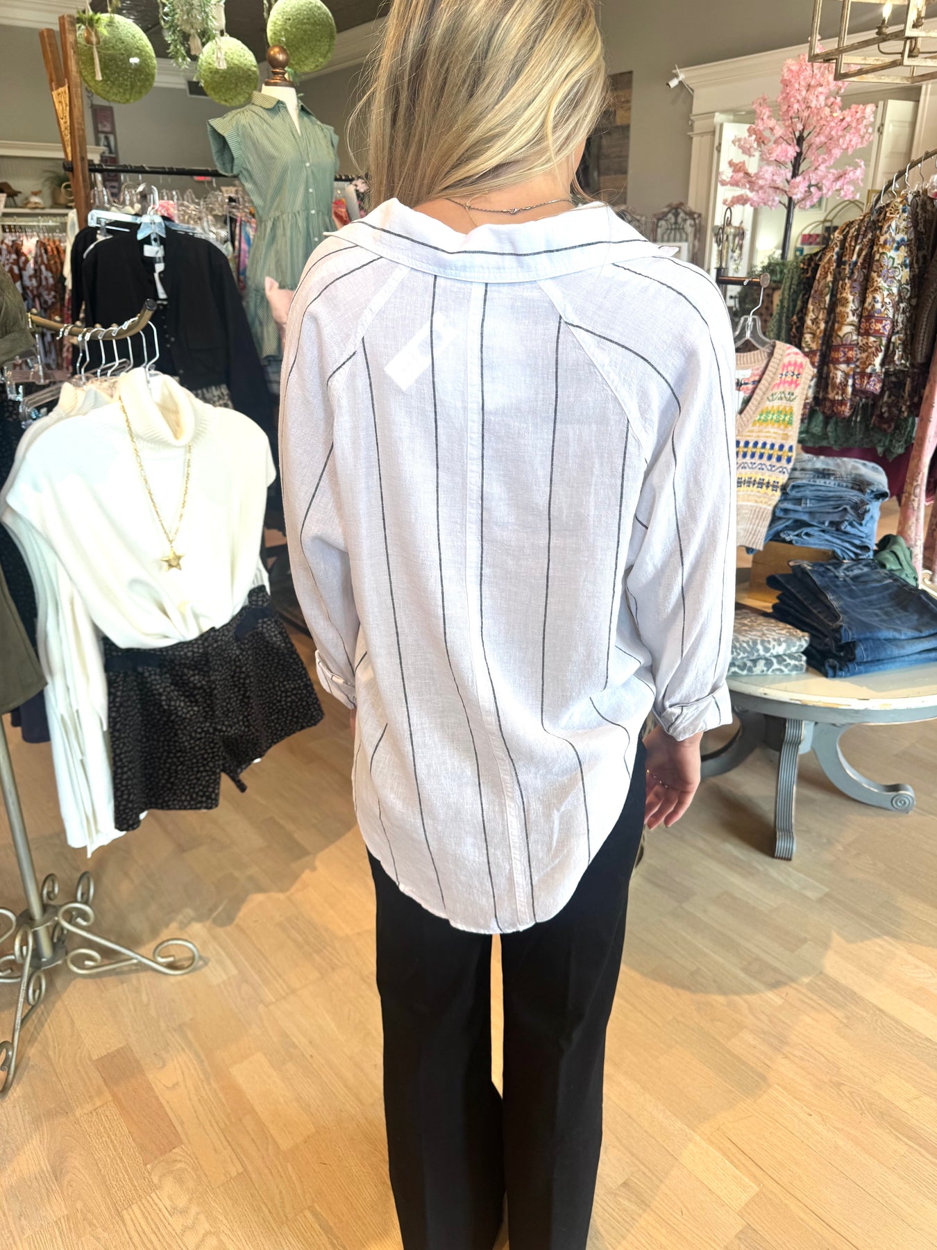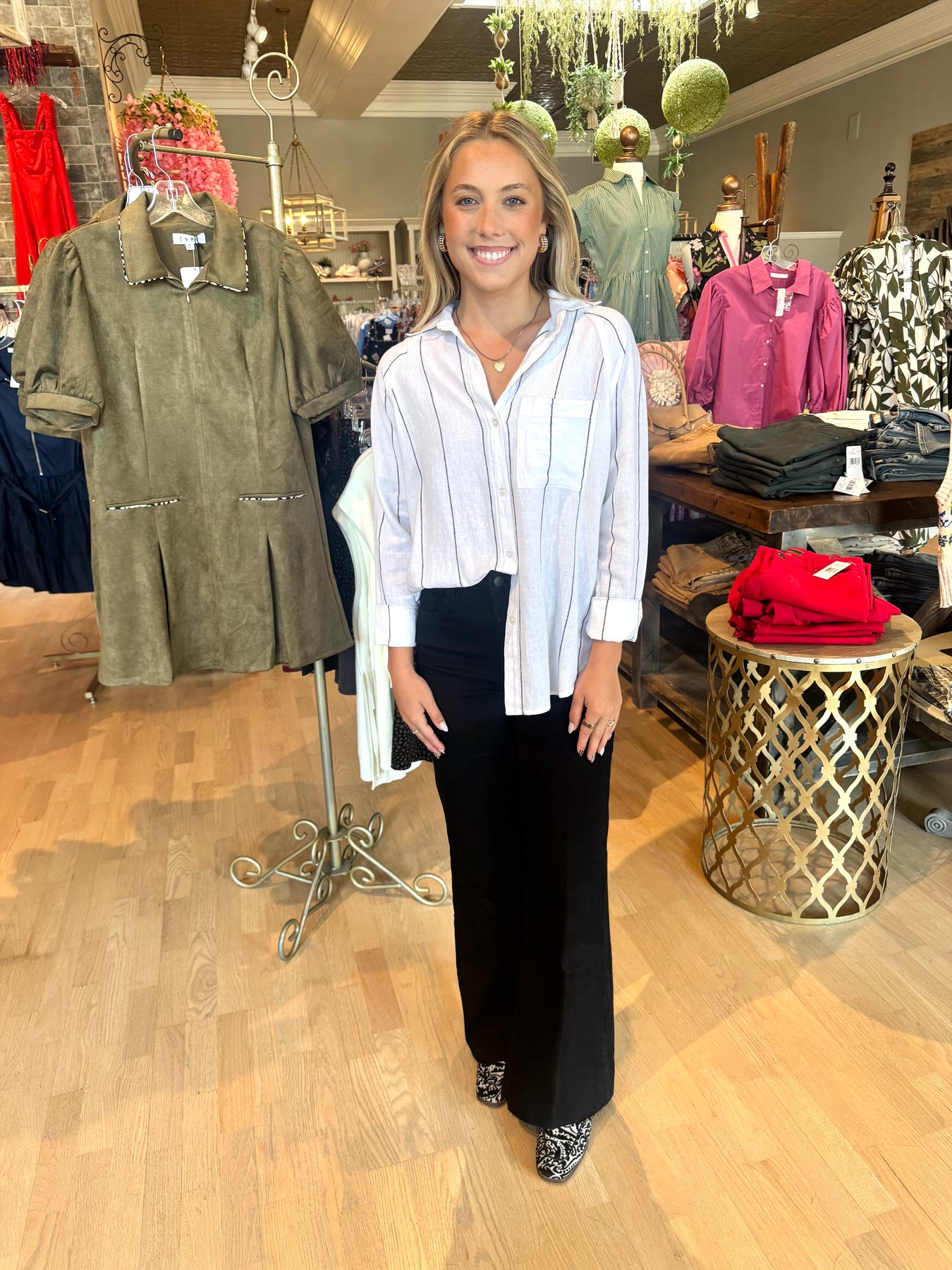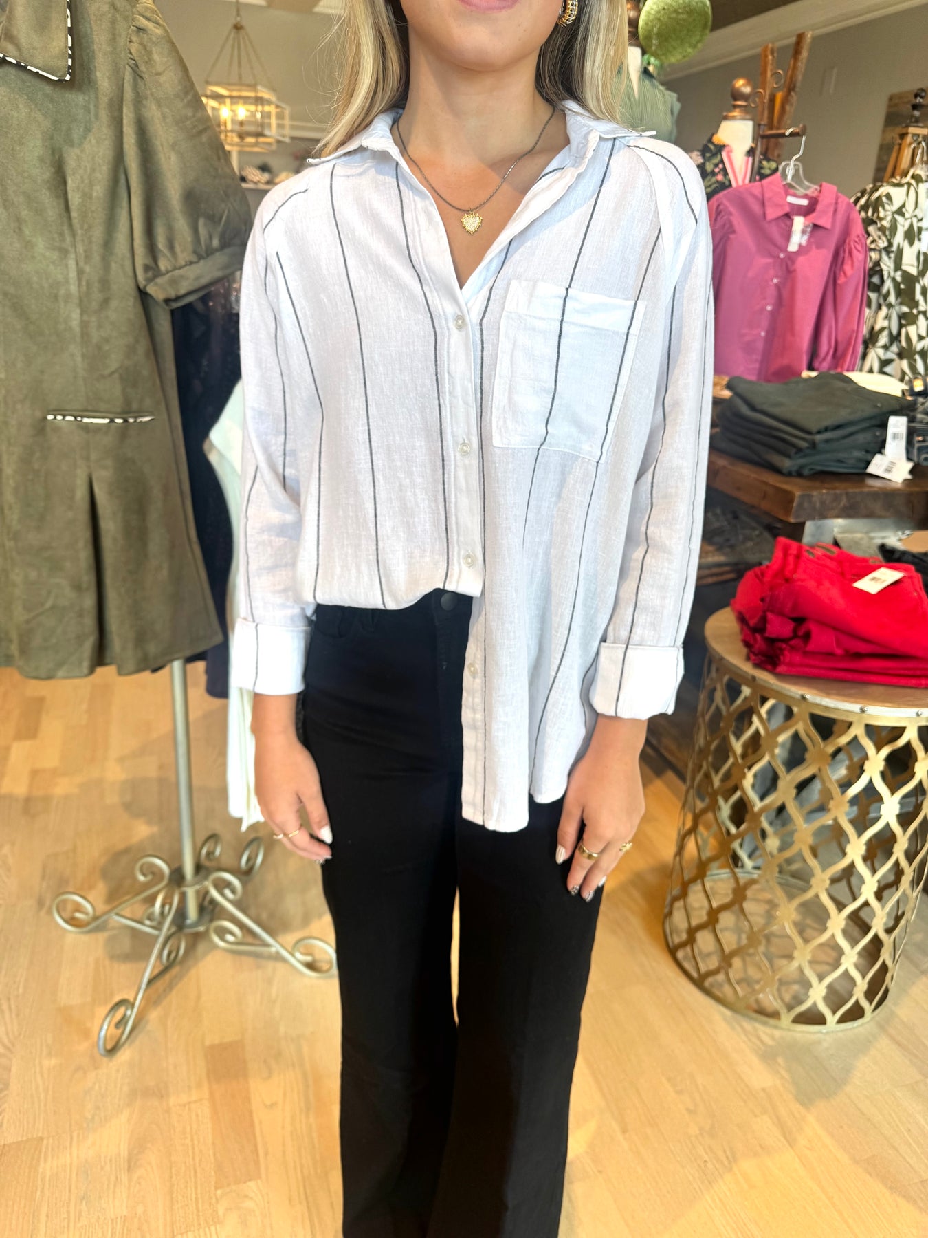 Elevate your wardrobe with THE PERFECT LINE TOP, an oversized button-down shirt featuring timeless pinstripes. Its long sleeves and relaxed fit offer effortless style and comfortable layering for any season. Whether dressed up or down, this versatile shirt adds a sharp, polished edge to your look while ensuring all-day ease. A must-have staple that redefines casual sophistication.