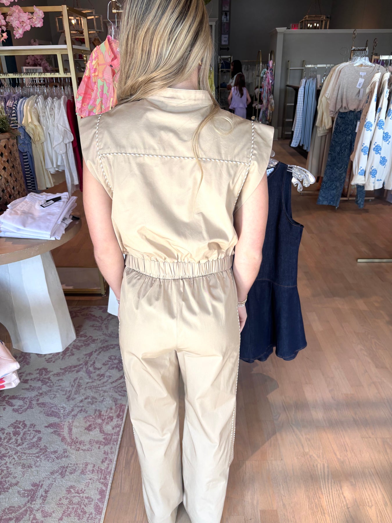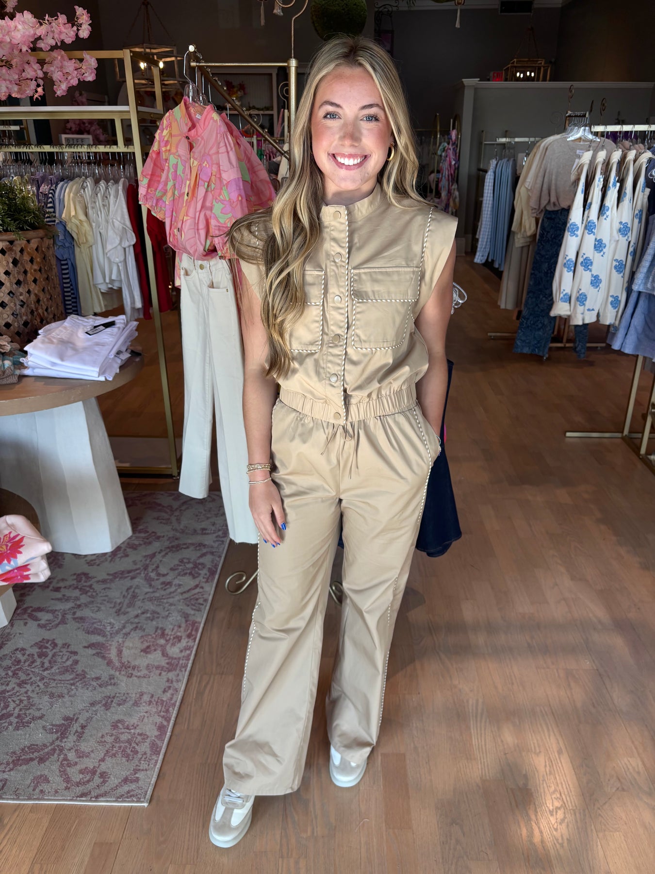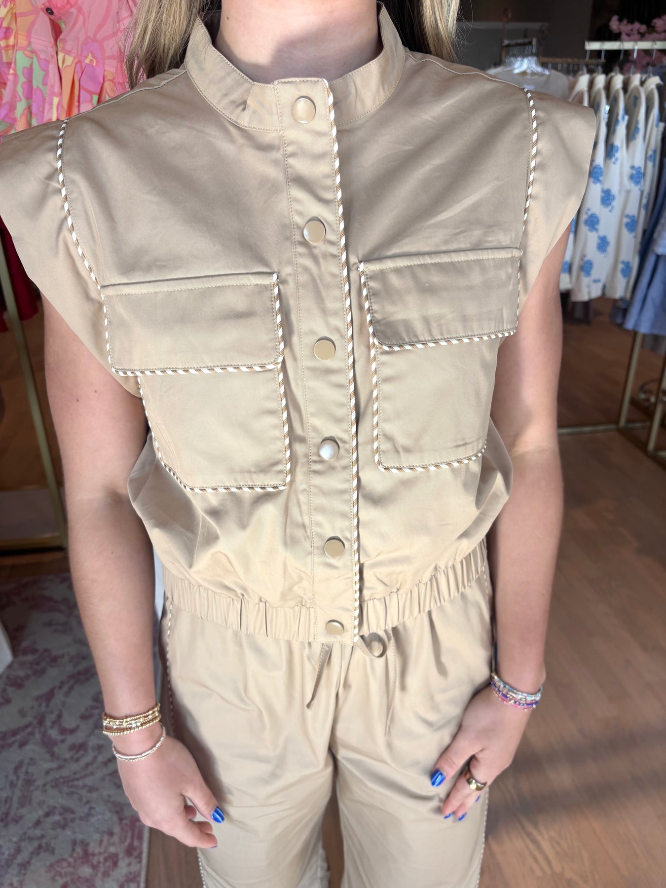 The cutest vest to elevate any travel wardrobe! This contrast piping detail poplin jacket features sharp tailoring and a polished look that works beautifully as a standalone piece or paired with matching pants for a coordinated set. Perfect for airport days, weekend getaways, or any occasion where you want to look put-together without trying too hard. The timeless taupe, ivory, and tan colorway pairs effortlessly with your existing basics.