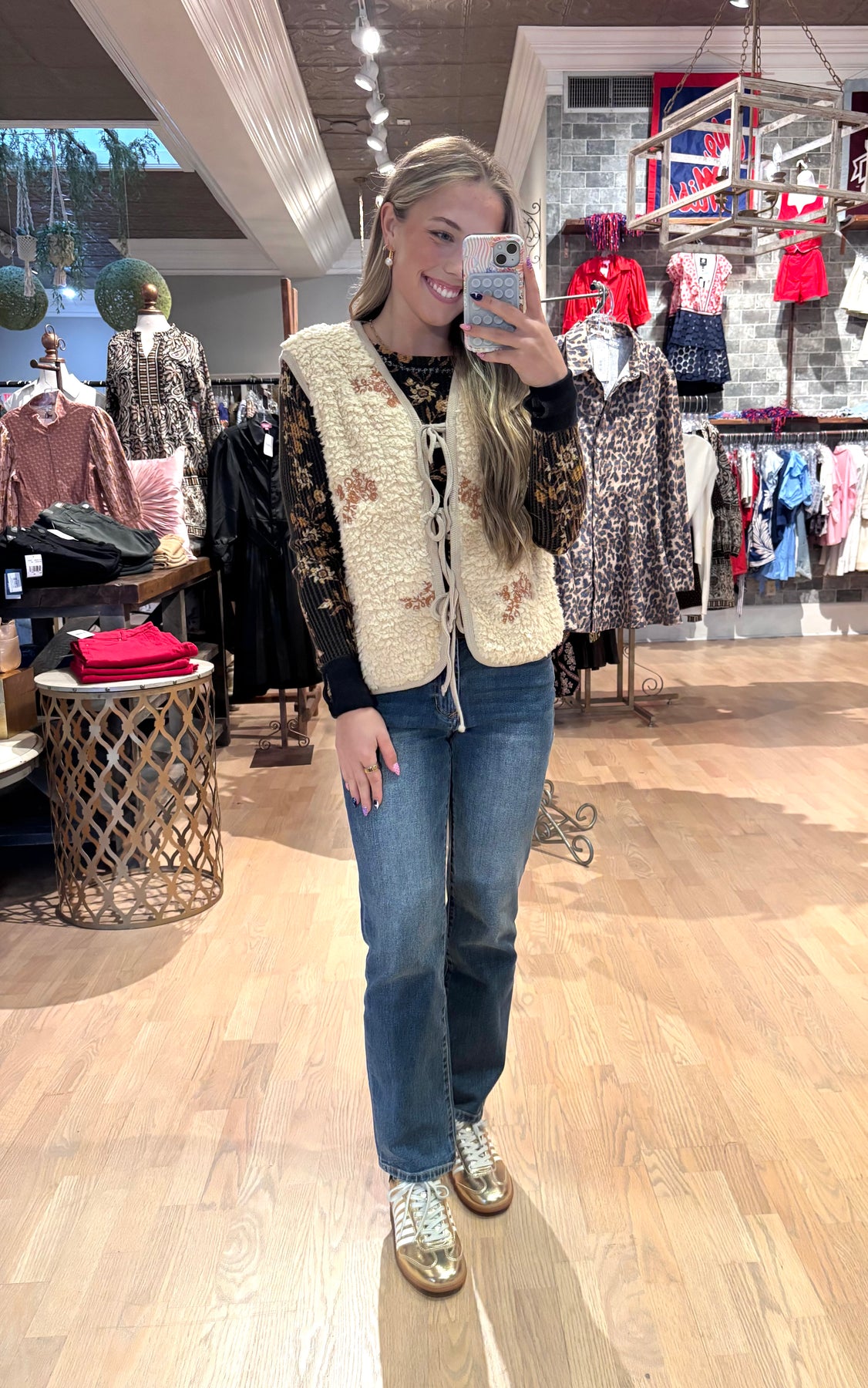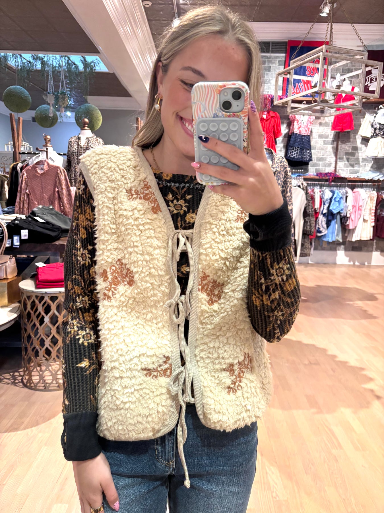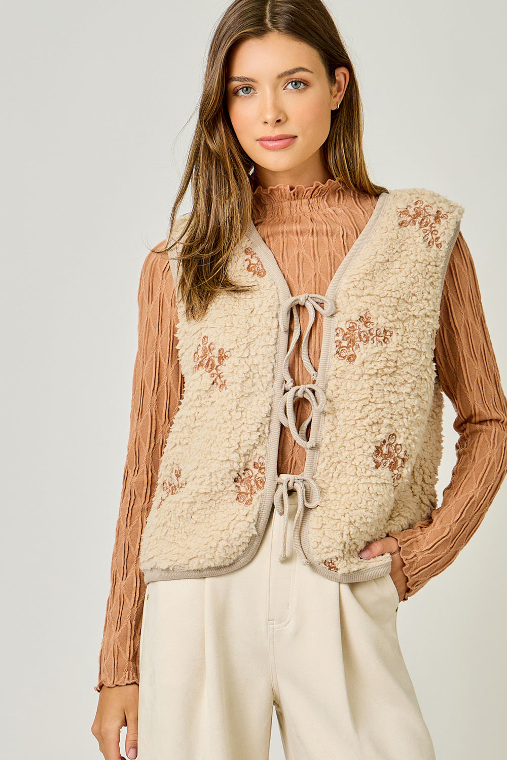 Elevate your layering game with the Embroidered Teddy Fur Vest, featuring intricate embroidery detail and a charming ribbon tie at the front. Its flattering v-neckline makes it an effortless match for any solid or printed long sleeve tee, adding warmth and style to your outfit. Perfect for cozy days when you want to stand out with subtle, elegant details.
