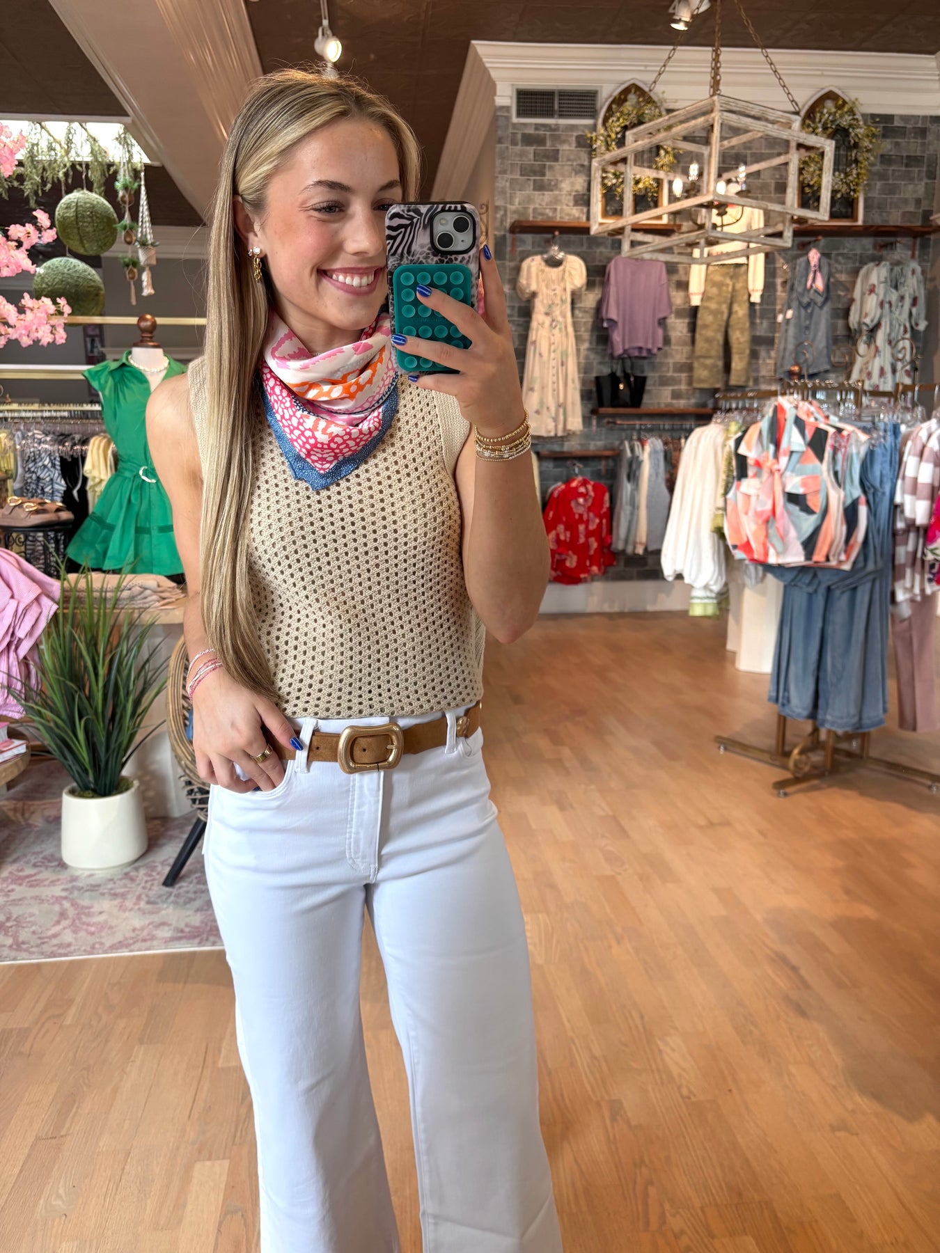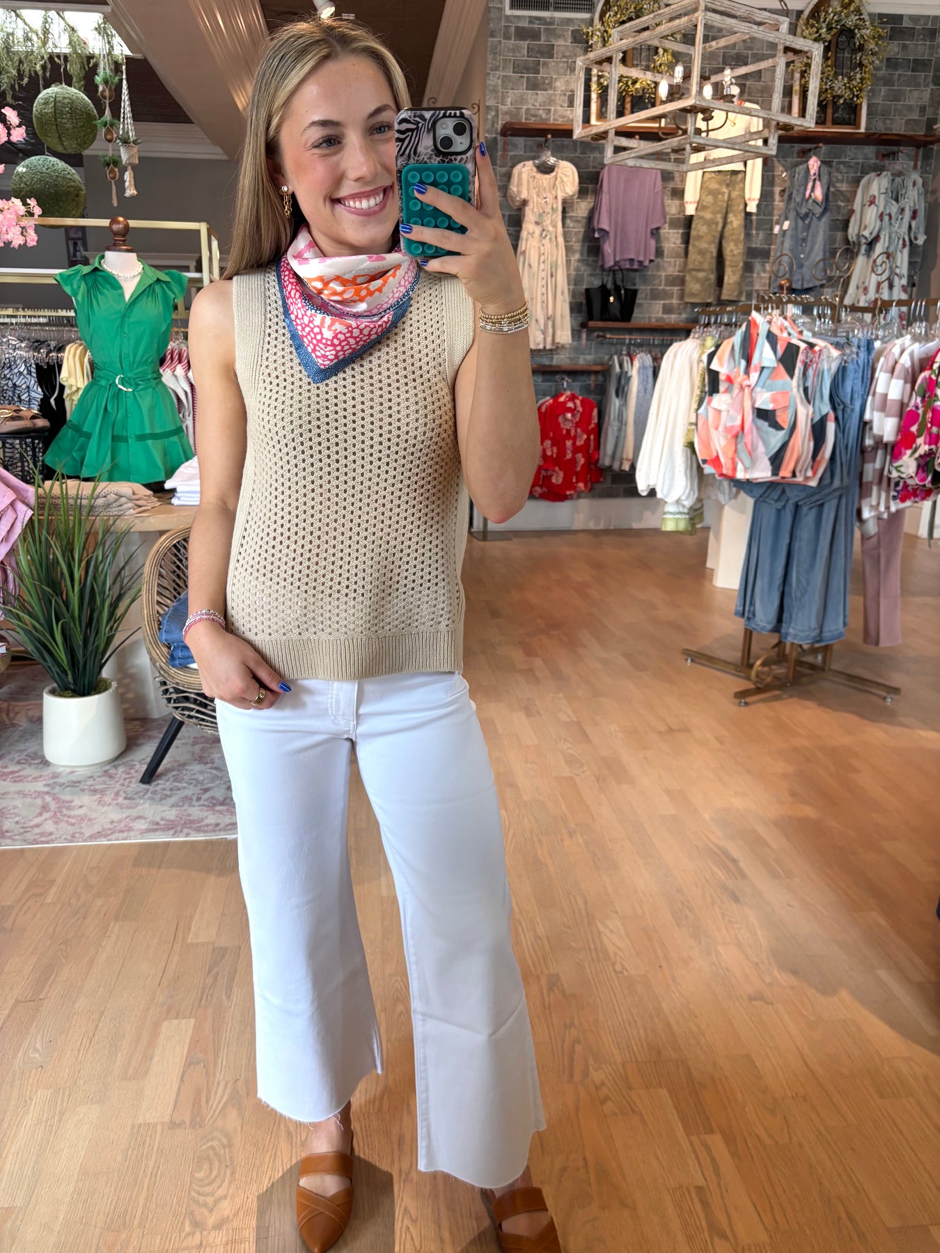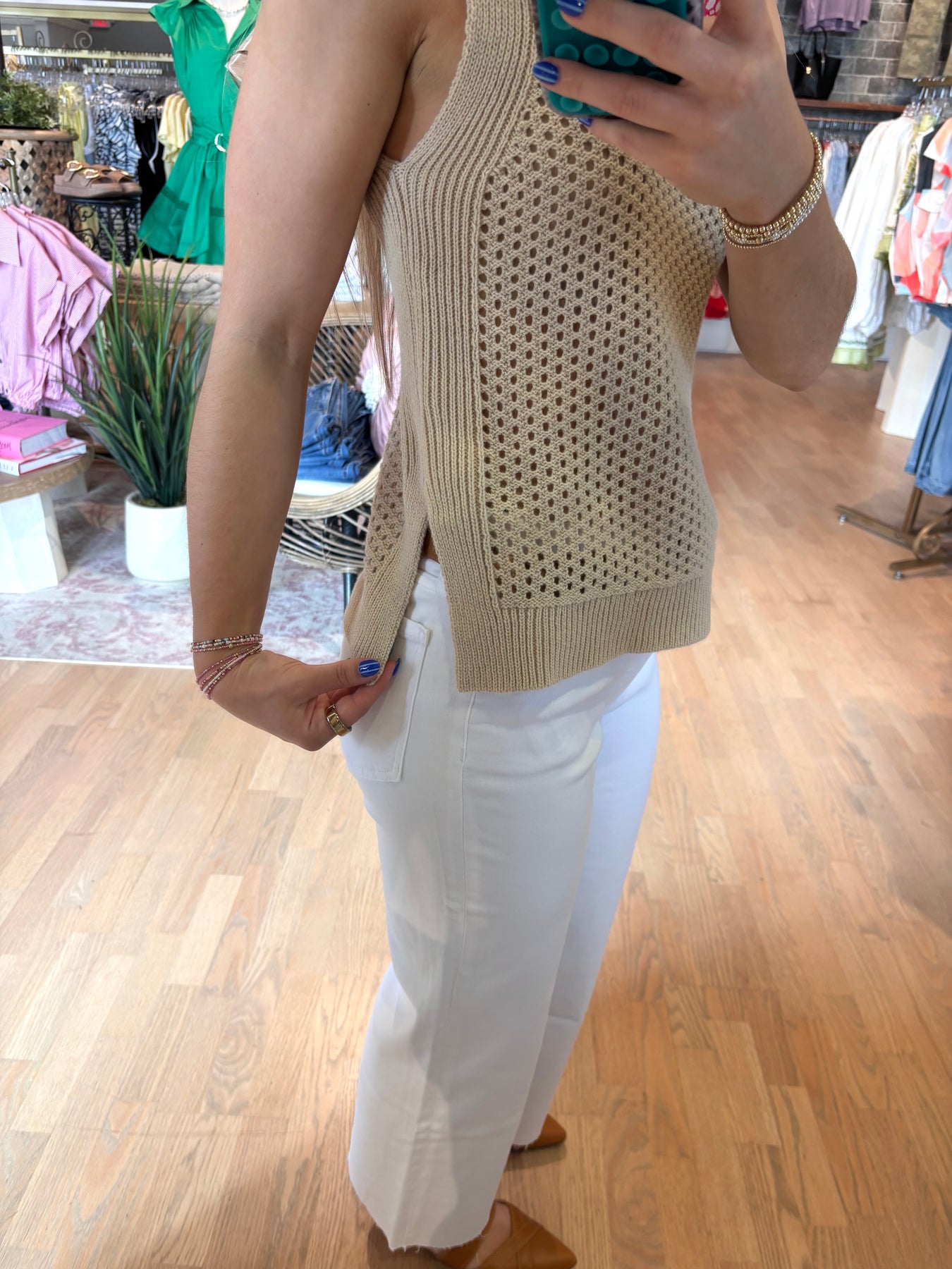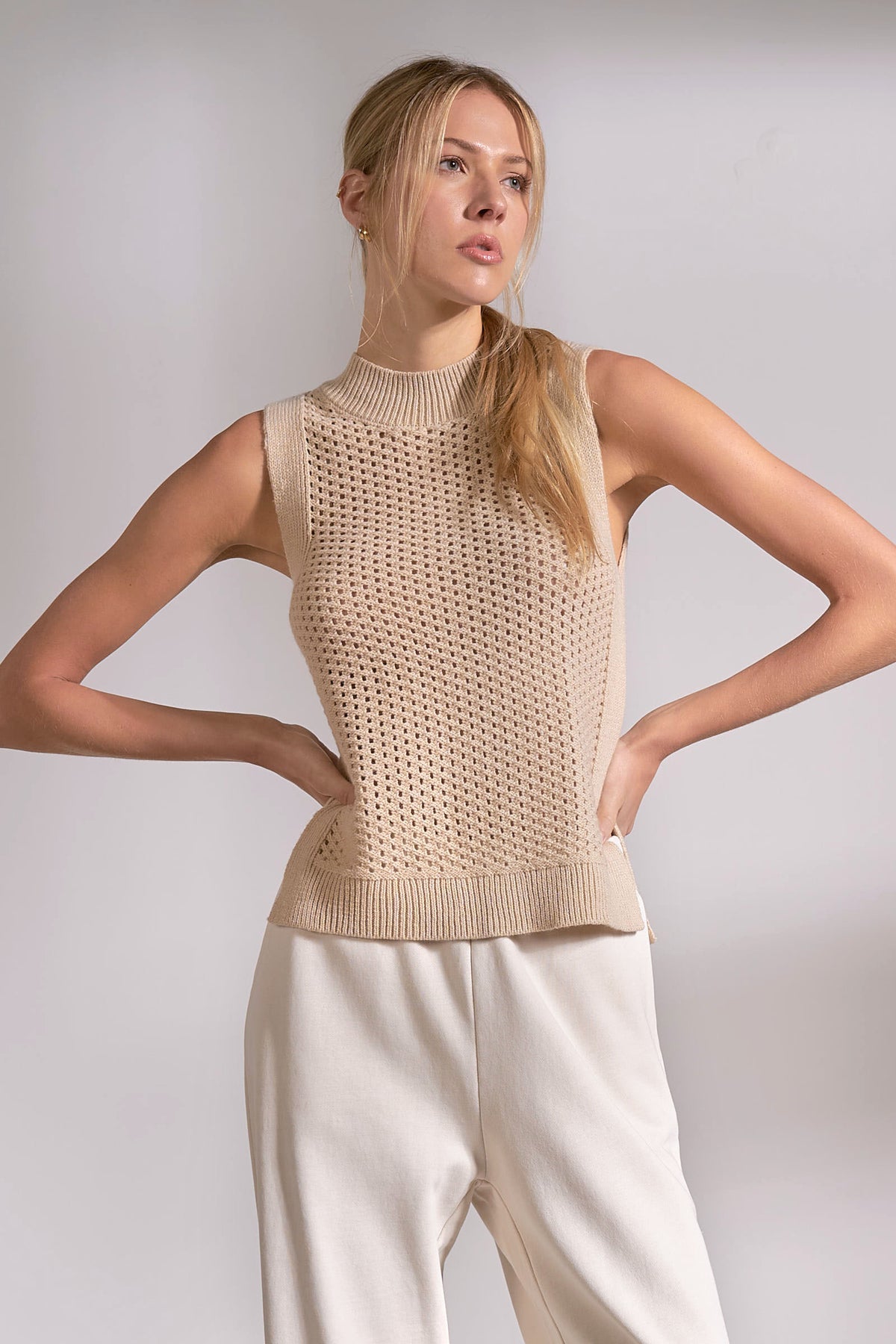 Embrace spring's hottest trend with this sleeveless open weave neutral vest—the perfect layering piece for effortless sophistication. Its breathable, textured design pairs beautifully with white skorts, crisp white jeans, or any neutral in your wardrobe, creating endless versatile looks. Whether you're dressing up or keeping it casual, this vest adds dimension and polish to every outfit while keeping you cool and comfortable. A modern essential that works as hard as you do.