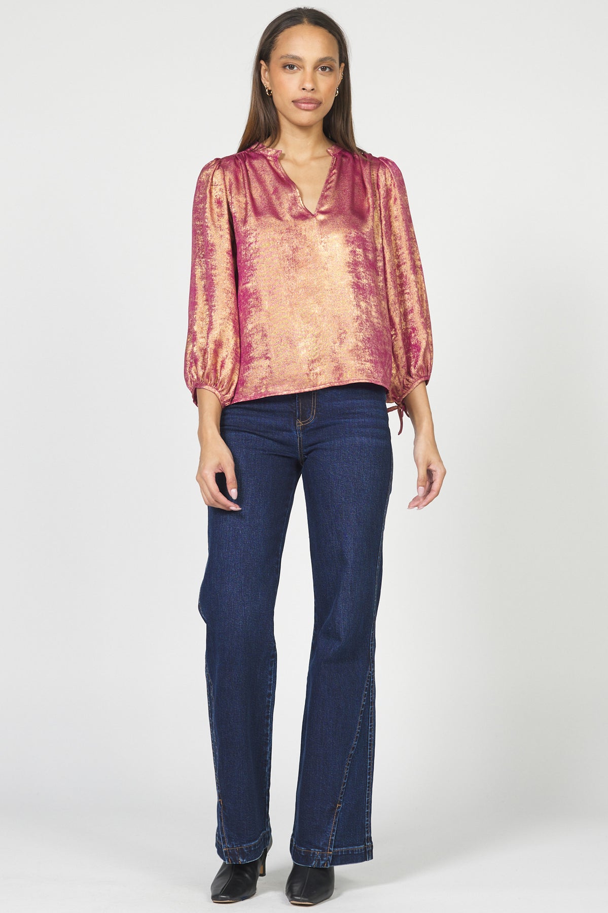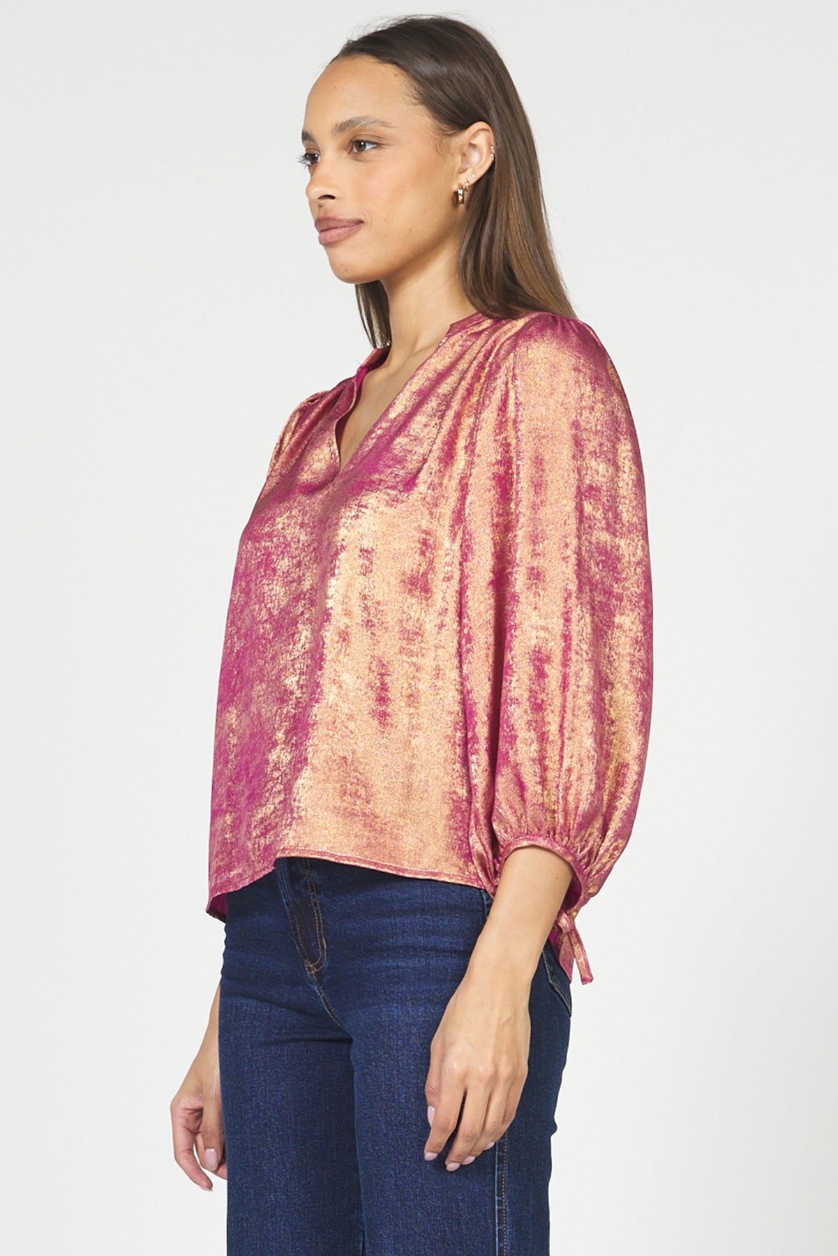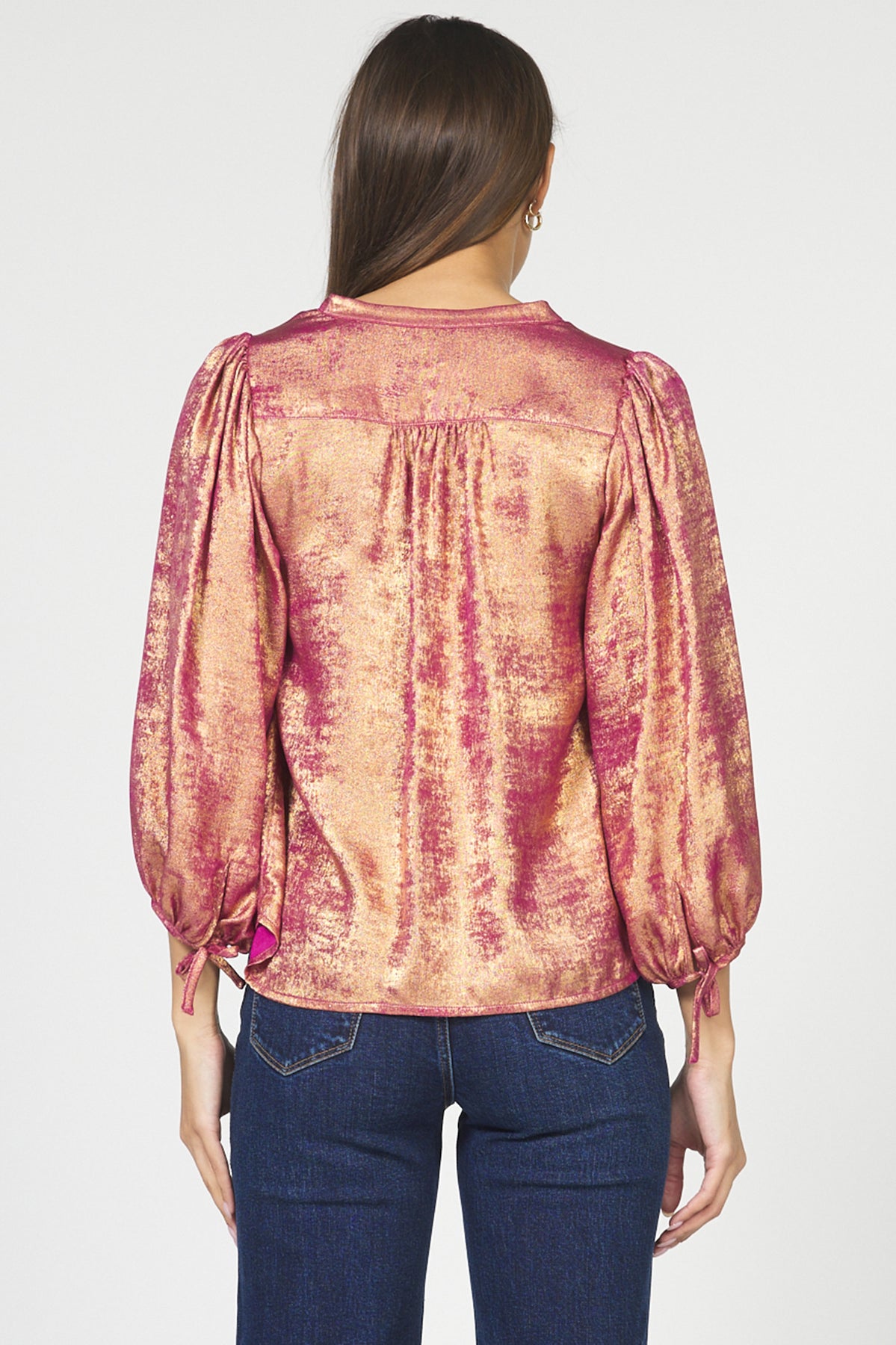 Elevate your holiday wardrobe with the DEAR JOHN MARGOT BLOUSE, featuring a stunning blend of pink and gold hues accented by a subtle metallic sheen. This versatile top pairs effortlessly with any skirt or pant, adding a festive yet elegant touch to your look. Perfect for celebrations, it combines style and shimmer to ensure you stand out with confidence.