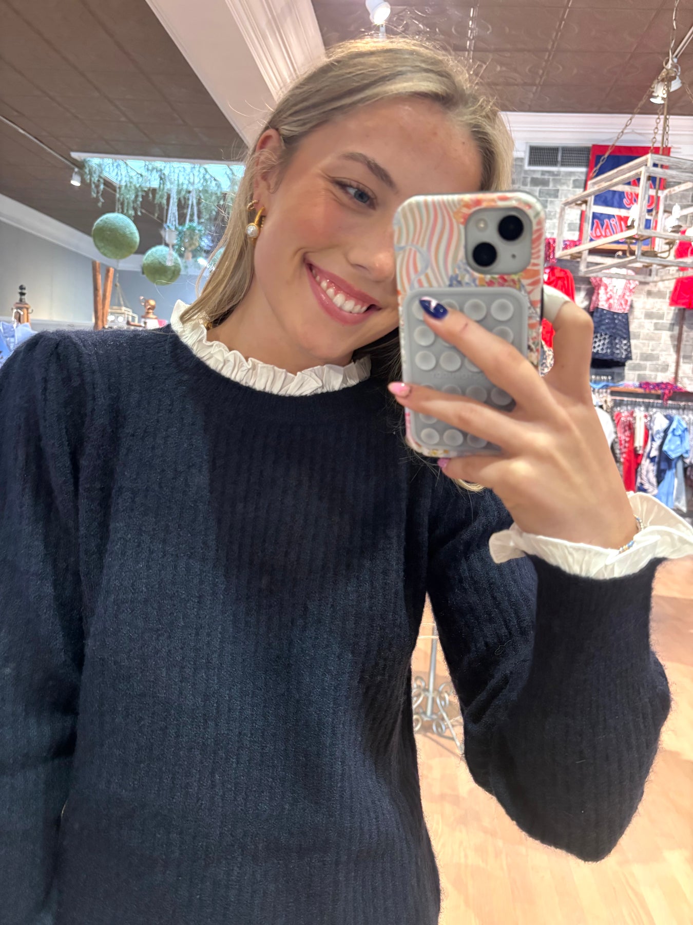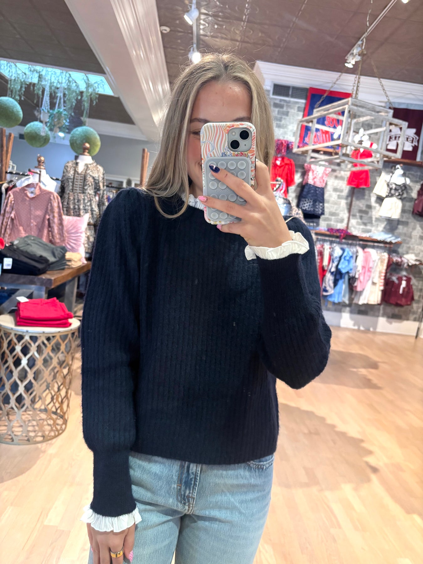 Elevate your wardrobe with this navy knit woven combi sweater top, featuring a delicate white ruffle trim for a feminine touch. Crafted for softness and comfort, its crew neck design offers a timeless silhouette perfect for layering or wearing on its own. Experience cozy style that transitions seamlessly from casual days to chic evenings.